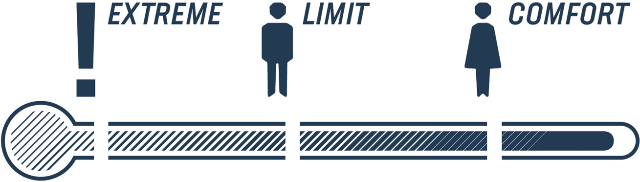 - T-EXT: der Risikobereich gibt die untere Extremtemperatur an, die eine durchschnittliche Frau bei starker Kältebelastung begrenzt für 6 h aushalten kann. An Schlaf ist hier nicht zu denken. Im Risikobereich ist mit starkem Kälteempfinden zu rechnen. Es besteht das Risiko von Gesundheitsschäden durch Hypothermie (Unterkühlung).