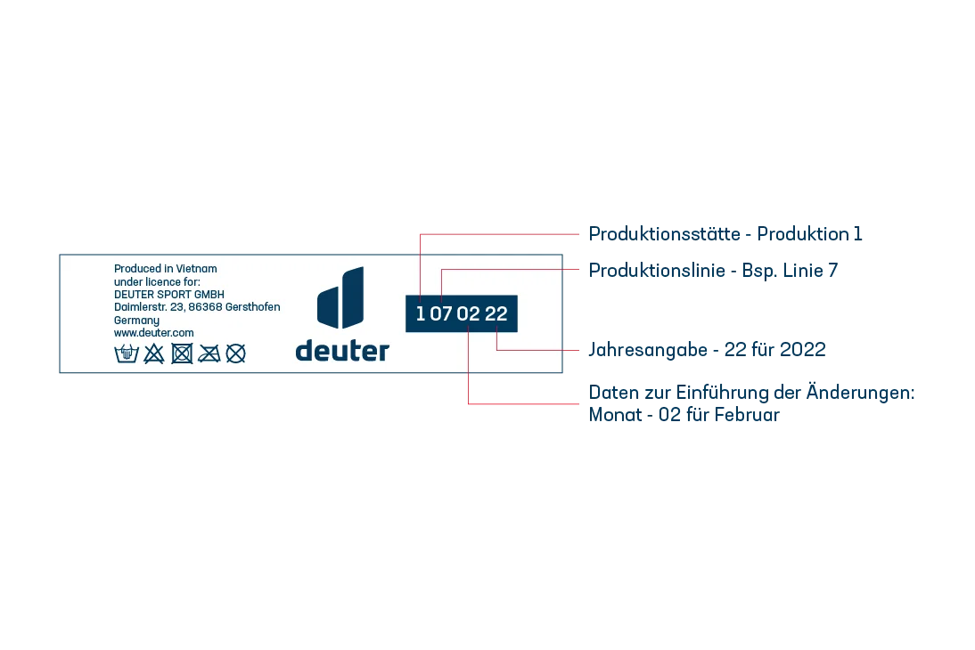 The production code is printed on a small white or black "flag". This can be found in the Kid Comfort's pack sack (the storage space underneath the child). The last two digits indicate the year of production, so it can be determined when the carrier was produced. It looks like this: