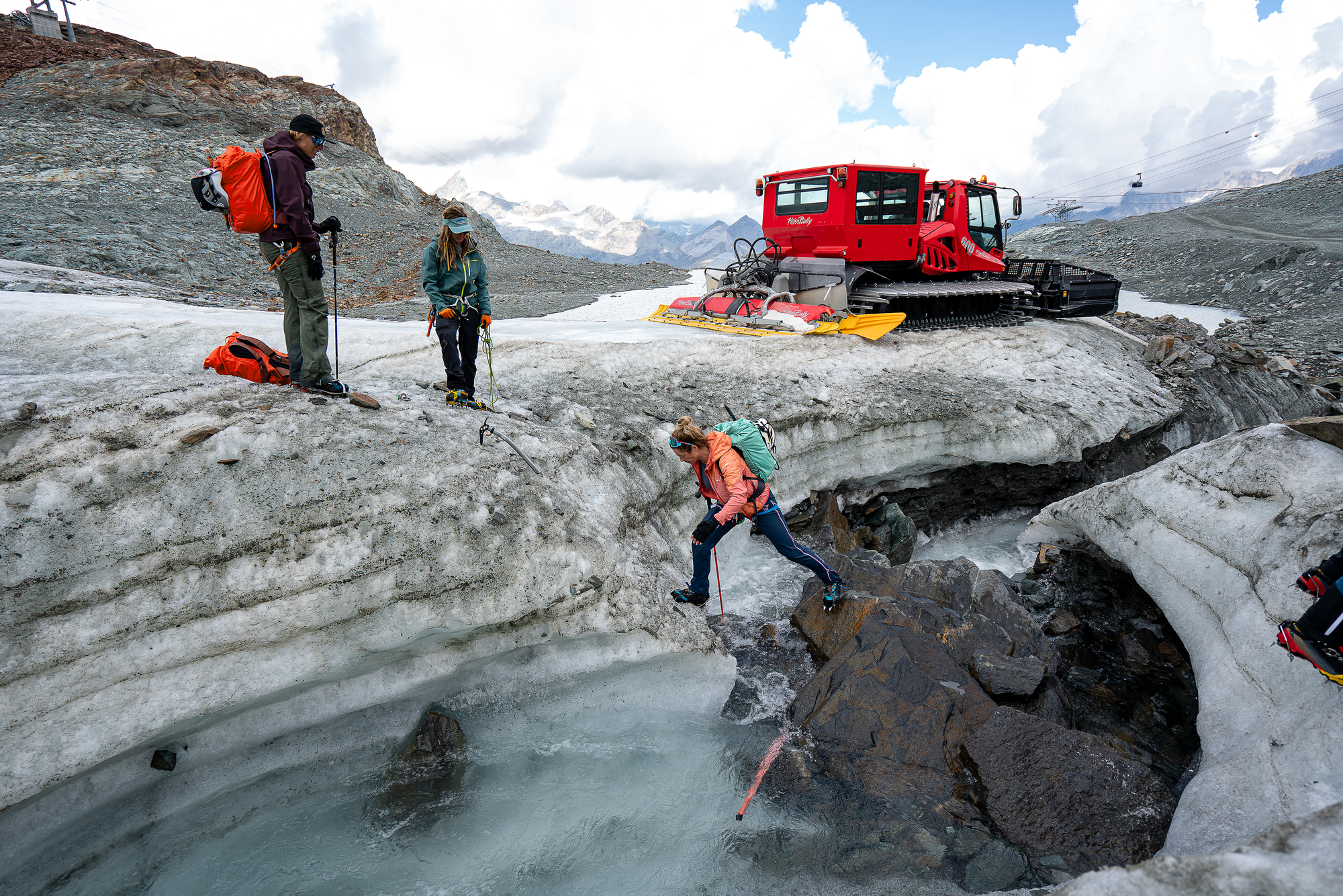 Am 8. August, nach einer Wanderung auf die Britanniahütte und ein paar lauen Stunden im idyllischen Bergdorf Saas Fee, brechen wir um 6.00 Uhr endlich Richtung Allalinhorn auf. Ehrlich gesagt, hatten wir kaum mehr damit gerechnet, da die Vorhersagen sehr schlecht waren. Der niederschlagsarme Winter und extrem warme Sommer haben die Spalten größer und mehr werden lassen. Bisherige Wege sind fast nicht mehr begehbar. Die Schneebrücken über die Spalten entweder instabil oder gar nicht mehr vorhanden. Nach umfangreicher Recherche und Gesprächen mit einheimischen Bergführern beschliesst unser Team zusammen mit unseren Bergführern Susi und Michi es zu probieren. Und so steigen wir um 6.15 Uhr in die Gondel, die uns zum Mittelallalin bringt. Dort betreten kurz später die Eiswelt des Feengletschers – oder vielmehr das, was die warmen Temperaturen noch übrig gelassen haben. Einen aperen Gletscher mit tiefen Spalten. Traurig schaut er aus. Noch trauriger macht es uns zu beobachten, dass er an manchen Stellen sogar mechanisch abgetragen wird, damit die Pisten für das Sommertraining der Profis einen soliden Zustand aufweisen. Und auch wir sind Teil des Tourismus am Berg, dessen Nachhaltigkeit in der heutigen Zeit fragwürdig ist. Diese Gedanken begleiten uns nicht nur während des heutigen Aufstiegs, sondern die ganze Tour hinweg. Nachdem wir uns mühsam den Weg durch zwei Schlüsselstellen auf das Feejoch gebahnt haben, ist der Aufstieg über die Westflanke dagegen ein purer Genuss. Nach nur kurzer Zeit erreichen wir den Gipfel des „Altweiberviertausenders“. Der lieblose Titel wird diesem Berg nicht gerecht. Für uns ist er der schönste Gipfel, den wir uns in diesem Moment erträumen könnten. Denn wir sind nicht hier, um Gipfelschwierigkeiten oder menschliche Leistungen zu vergleichen. Wer wären wir, dies zu bewerten, haben wir doch alle unterschiedliche Hintergründe und dennoch ein gemeinsames Ziel. Ein weiteres ist der sichere Abstieg zurück ins Tal. Voller Energie, Stolz und Dankbarkeit kehren wir nach wenigen Stunden zurück und belohnen uns mit einem großen Stück Schokokuchen und einem heißen Kaffee, bevor wir nach Herbriggen aufbrechen, um dort mit der eigentlichen Tour zu starten.
