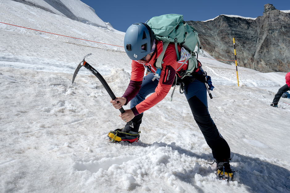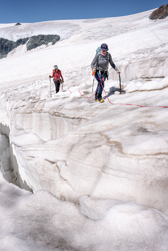 Ab heute, dem 9. August, geht es fünf Tage durch die Gletscherwelt des Monte Rosa Massivs. Immer entlang der Grenze zwischen Italien und der Schweiz. Die Tour wird auch Spaghetti-Tour genannt. Gleichnamige gibt es allerdings auf keiner der Hütten für uns zu essen. Dafür unfassbar leckere Farfalle, was uns persönlich viel besser gefällt. Denn „Farfalla“ ist ein italienischer Frauenname und bedeutet Schmetterling. Und genau so unbeschwert und leicht fühlen wir uns, als wir das Klein Matterhorn mit all seinen Besuchern hinter uns lassen und unseren Weg aufs Breithorn bahnen. Von hier oben erscheint dieser 4.000er wie ein kleiner Hügel. Auch der Aufstieg dauert nicht lang, bis wir auf dem kleinen Plateau am Gipfel stehen und den Blick nicht vom Matterhorn lösen können, das in all seiner Pracht direkt vor uns steht. Als wäre das nicht schon beeindruckend genug, erklingen hinter uns plötzlich die mächtigen, sehnsüchtigen Töne eines Alphorns und tragen uns fort in eine andere Zeit. Wir fragen nicht nach dem Sinn, sondern nehmen dieses erhebende Gefühl mit auf die schweißtreibende Querung des Gletschers zwischen Breithorn, Castor und Pollux. Der Marsch vorbei an wunderschönen Skulpturen der Vergänglichkeit über verspaltetes Gelände, dessen bizarre Formen jedes Mal einen kleinen Schauder in uns auslösen, zieht sich lange bis zu unserer Unterkunft für die Nacht: die Guide Ayas Hütte. Erschöpft dort angekommen, empfängt uns italienische Gastfreundlichkeit, leckeres Essen und unser erster Spritz für die Tour – für Amy, unsere Kollegin aus Colorado, sogar der erste ihres Lebens. Aber nicht nur das ist ein Novum. Auch die Hüttentoiletten stellen sie vor eine neue Herausforderung – oder in Amys Worten: „My personal Nemesis.“