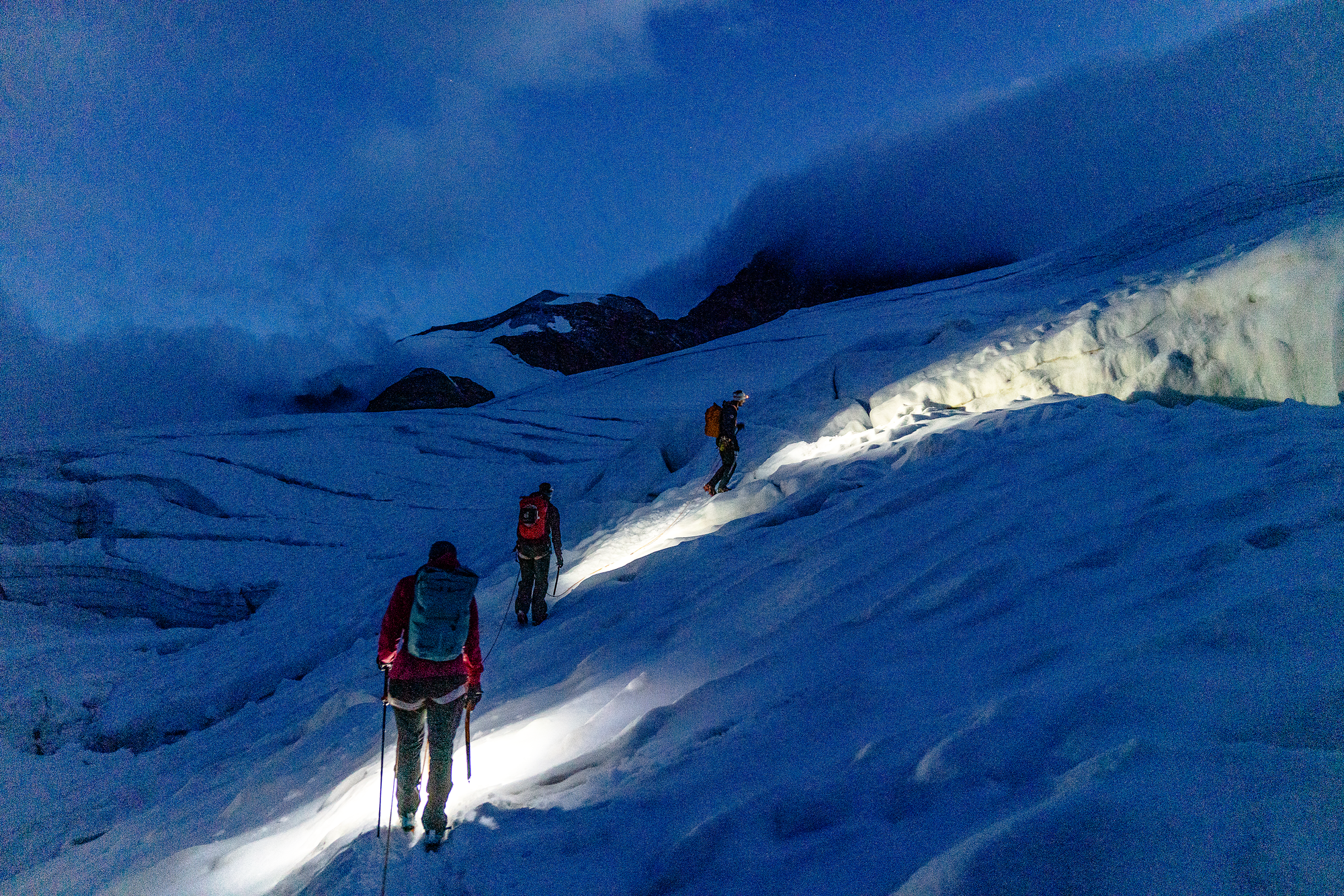 Am nächsten Tag klingelt der Wecker um 3.00 Uhr. Binnen einer Stunde haben wir uns angezogen, gepackt, gefrühstückt und sind abmarschbereit. Im Dunklen setzen wir vorsichtig einen Schritt vor den anderen. Die Sinne geschärft. Die Kegel unserer Stirnlampen tanzen wie Glühwürmchen über das große Eisfeld hinter der Hütte. Die Wegführung ist anspruchsvoll, denn es gibt mehr Spalten als erwartet. Gleich zweimal zerschneidet das Geräusch herabfallender Séracs die Stille der Nacht. Gänsehaut – und das nicht, weil es kalt ist. Langsam und konzentriert arbeiten wir uns hoch zum Einstieg in die westliche Gletscherflanke des Castor. Langsam geht die Sonne auf und lässt den Mont Blanc im Morgenlicht erstrahlen. Gänsehaut – jetzt, weil es schön ist. Wir starten mit dem technischen Aufstieg in zwei Seilschaften. Dabei kommen wir nur langsam voran, setzen immer wieder Belays und müssen im oberen Stück an der 55 Grad steilen Eisflanke sogar Eisklettern. Am Firn-Eisgrat sehen wir das erste Mal Richtung Lyskamp. Aber eigentlich haben wir nur Augen für den Grat. Eine maximal 40 cm breite, makellose Haifischflosse, die sich elegant in der Sonne spiegelnd in Richtung Süden zum Gipfel erstreckt. Die erste Seilschaft mit Christina, Katharina und Michi winkt vom Gipfel zu uns herüber, aber das sehen wir schon gar nicht mehr. Wir sind im Tunnel. Und ich habe sowieso nur Augen für Amys Hintern, der gute 30 cm vor mir der einzige Anhaltspunkt ist, auf den ich mich bei der Überschreitung konzentrieren kann. Nach gefühlten zehn Minuten Atem anhalten kommen wir am Gipfel an. Es folgt der maximale Adrenalin-Kick. Es dauert einige Zeit, bis wir ruhig genug sind, um über den Südostgrat zum Felikjoch und von dort aus auf dem breiten Rücken hinab zum Rifugio Quintino Sella abzusteigen. Klar, dass auch hier zur Feier des Tages der Spritz nicht fehlen darf.