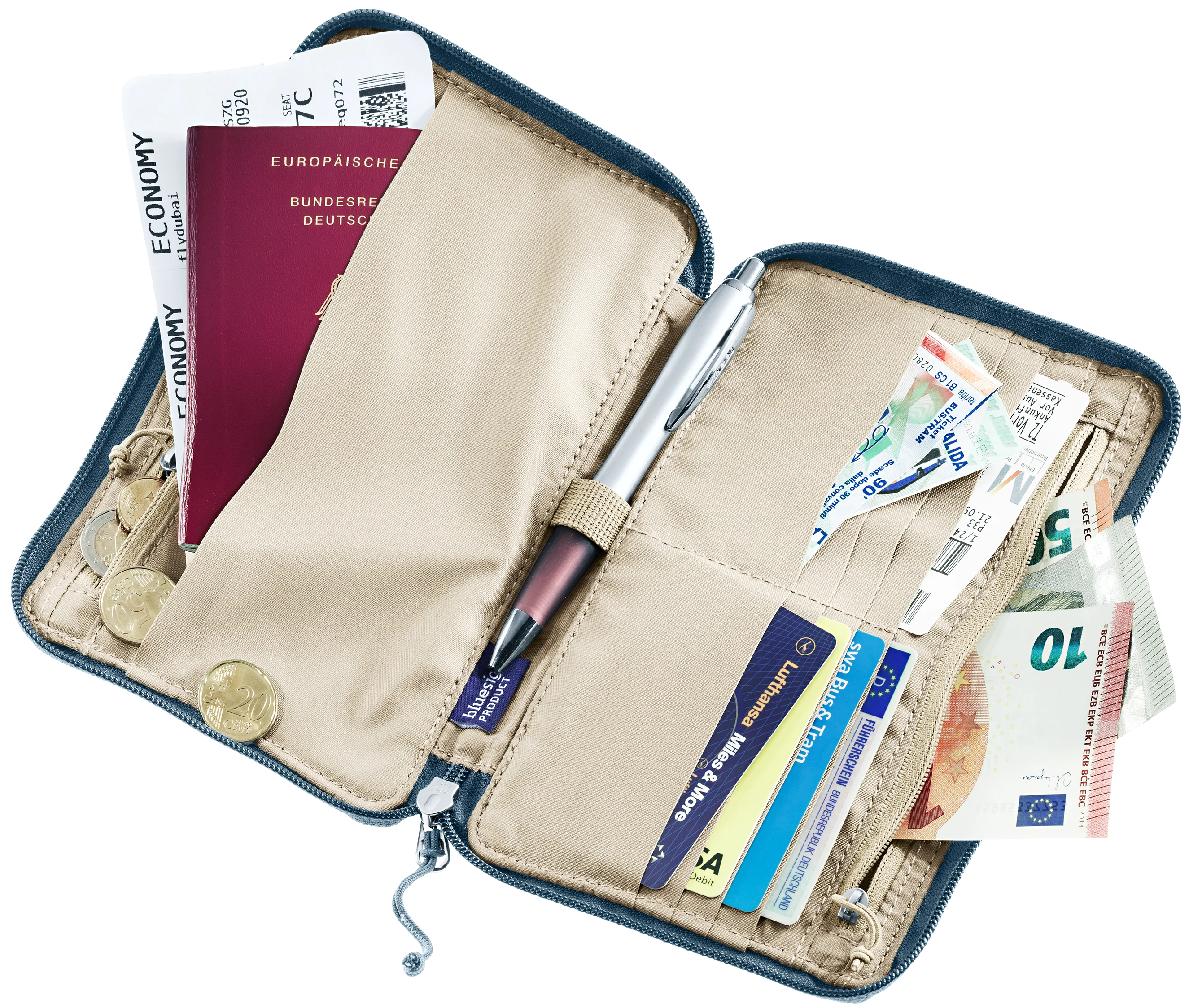 This practical travel wallet has clever compartments for on-the-move organization. Inside the clamshell zippered opening, it has a coin compartment and a note compartment, plus stash pockets and a pen holder. On the outside, there’s a quick-access stash pocket for tickets and a passport. Not only is this bluesign® accredited product sustainably made and Green Button certified, it also looks great in a timeless design.