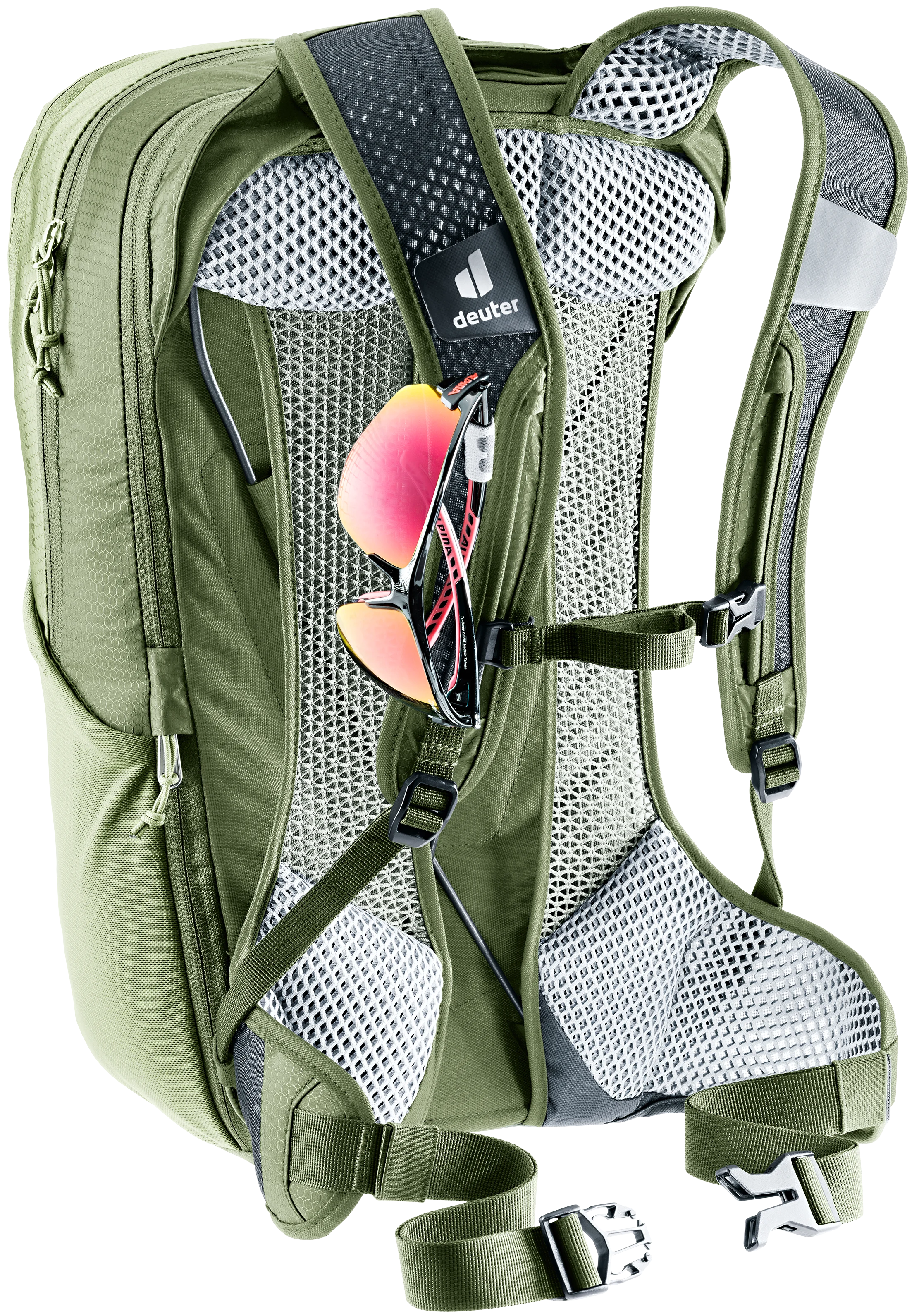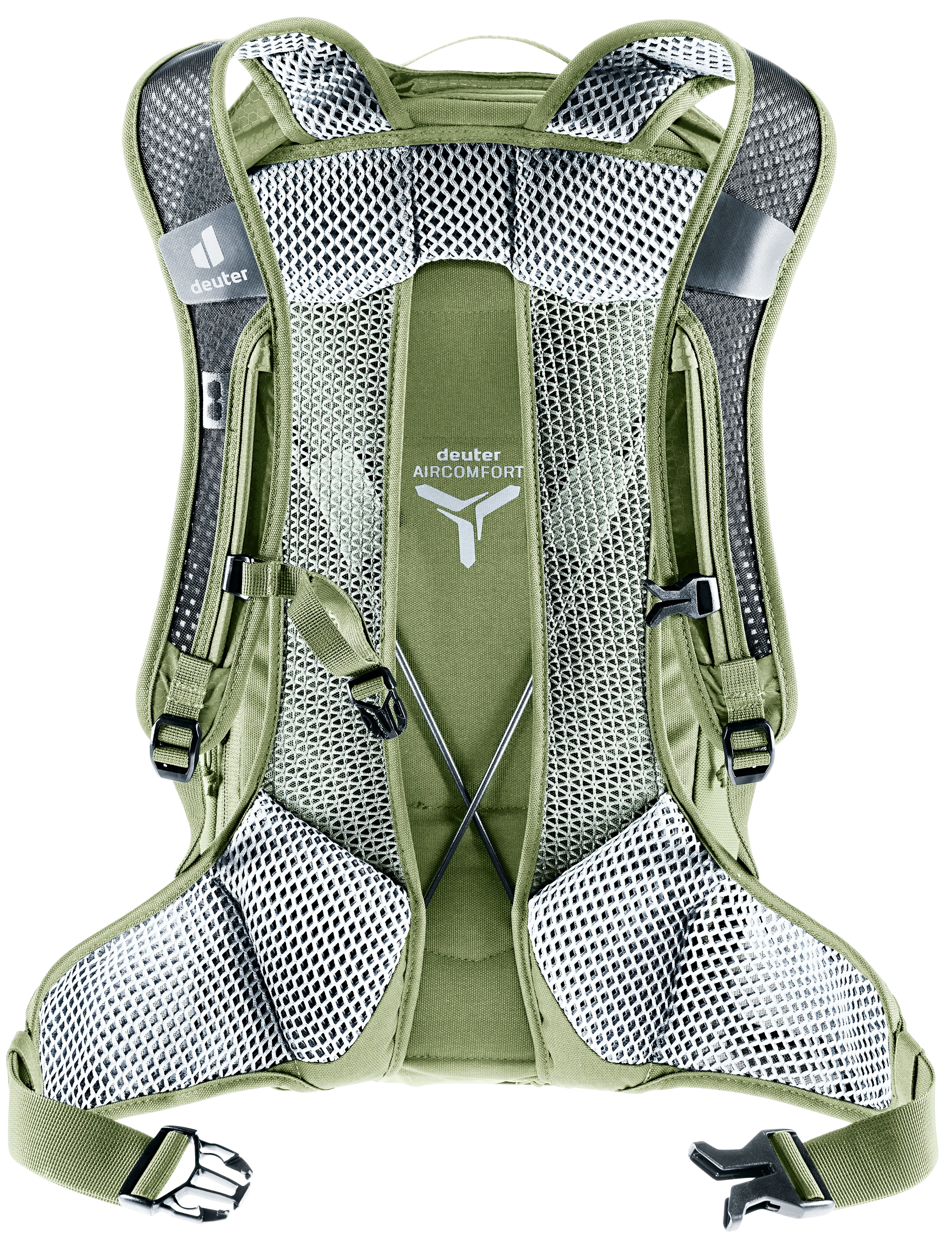 Ultra-light yet durable bike backpack with outstanding comfort for the weight. The deuter Aircomfort back system, designed specifically for biking, with a mesh back panel that’s split down the middle means that even less of the pack is in direct contact with the back, and makes more room for a rounded spine in riding position. The airy mesh hip fins, perforated shoulder straps and back padding ensure maximum airflow and a solid, snug fit. This climate neutral, PFAS-free mountain biking pack uses bluesign® approved 100% recycled body fabric, and components made using environmentally friendly, resource-efficient manufacturing practices.
