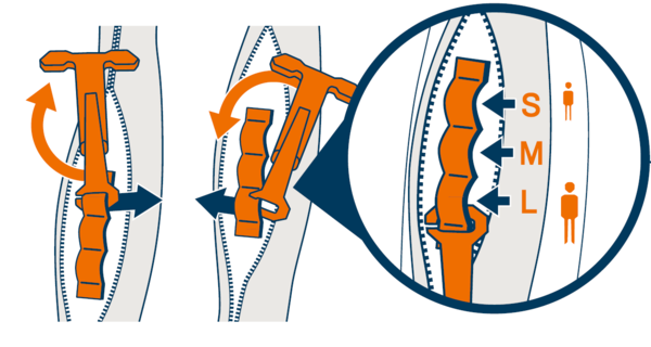 La poignée de déclenchement doit idéalement se trouver à hauteur de poitrine pour une meilleure accessibilité. Elle peut être réglée à trois hauteurs différentes. Il suffit de faire pivoter la poignée de déclenchement vers le haut et de la sortir de la boucle de la bandoulière, puis de la réinsérer dans celle qui convient.