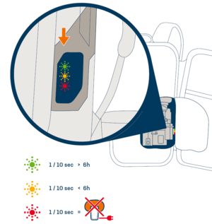 Le système Alpride E2 effectue un "auto-test" à chaque mise sous tension, afin de vérifier que le moteur, les supercondensateurs et l'électronique sont parfaitement opérationnels. Pendant cette période de test, les trois voyants lumineux s'allument l'un après l'autre pour vérifier leur fonctionnement. Une fois l'auto-test terminé avec succès, le système est prêt à être utilisé. Le moteur tourne une seconde fois et le voyant vert ou orange clignote en fonction de l'état de charge.