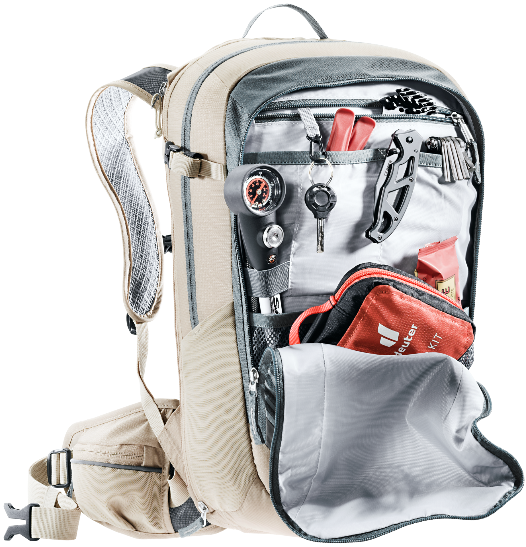 Un compartiment supplémentaire pour la poche d'hydratation, un compartiment séparé pour le smartphone, un compartiment à outils clairement agencé, deux poches zippées sur les ailerons, deux poches latérales et la possibilité d'augmenter le volume.