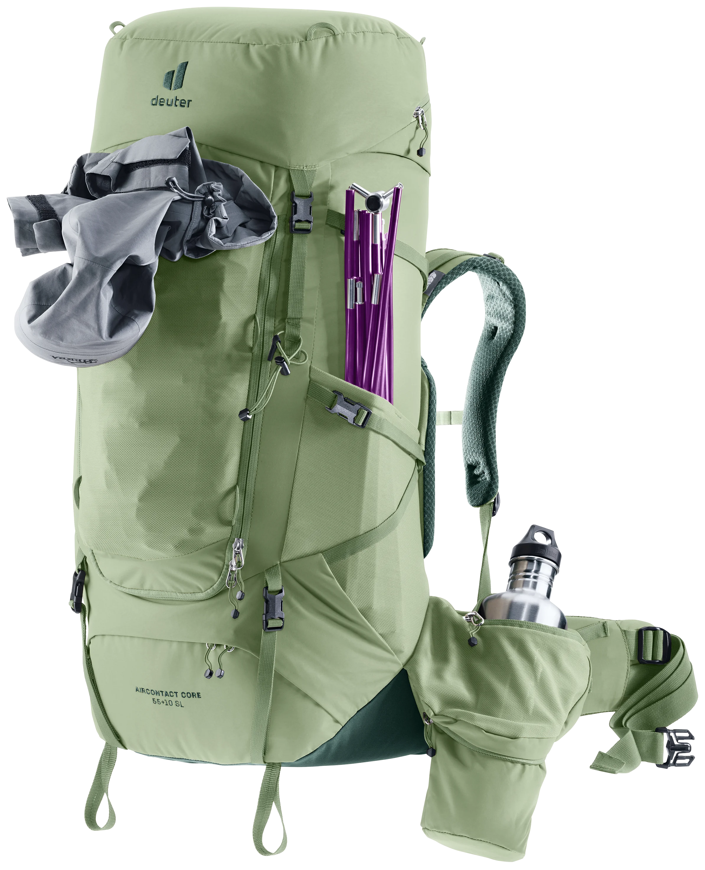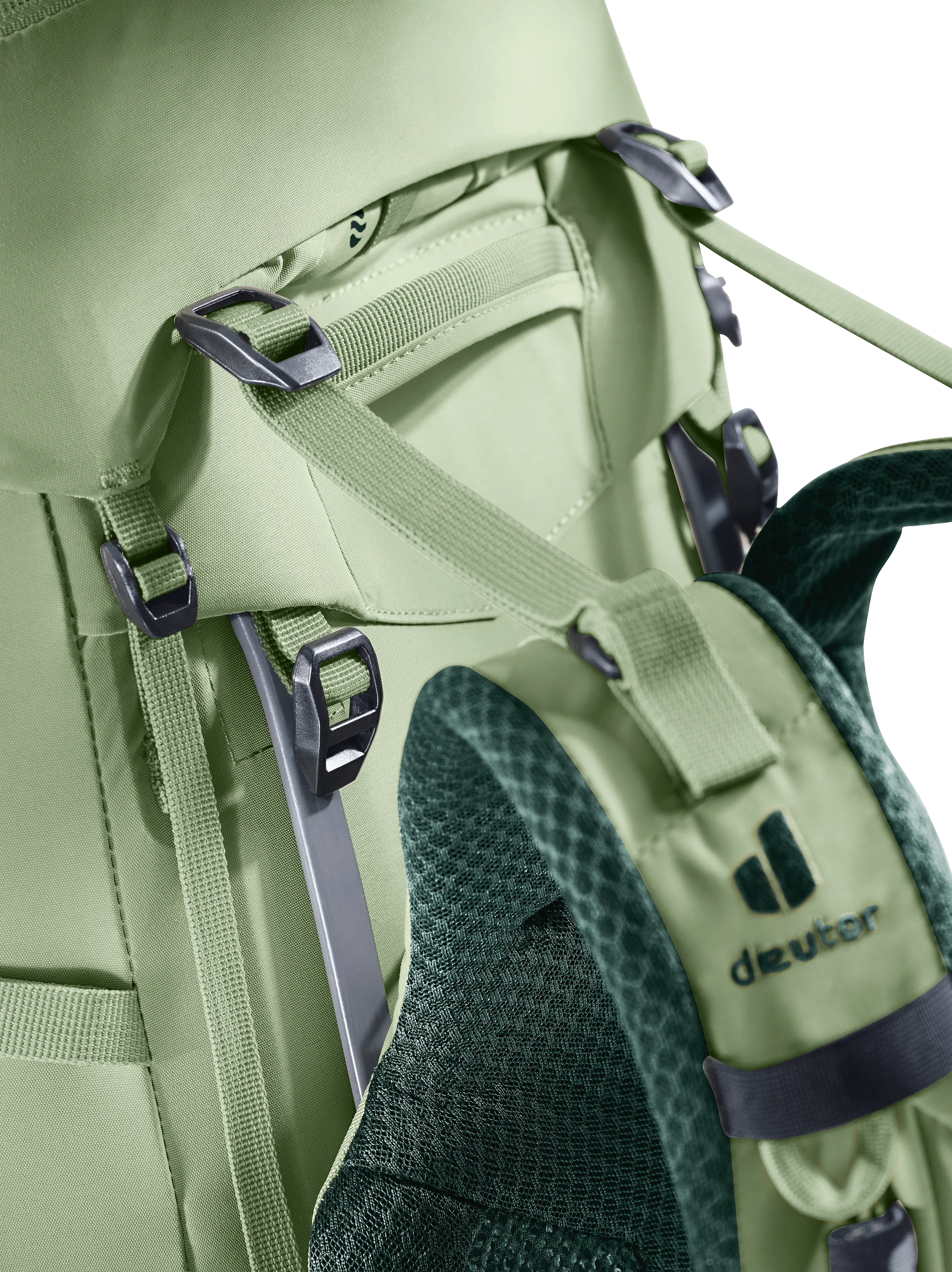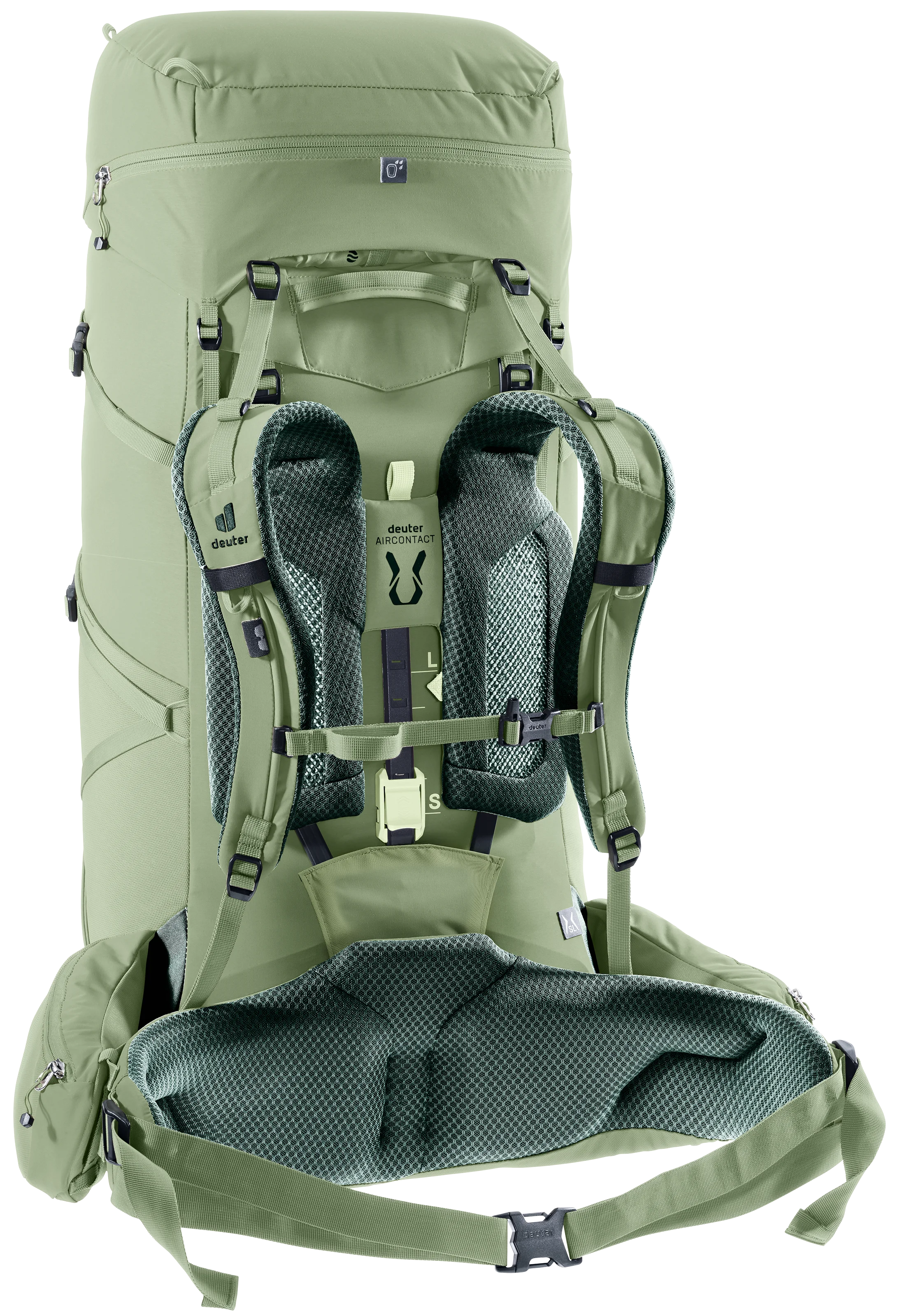 Der Rucksack lässt sich dank des neuen VariClick-Systems mit fünf Stufen individuell an die Rückenlänge anpassen. Der leicht bedienbare Mechanismus gibt durch ein spürbares Klick-Feedback Sicherheit beim Einrasten, während die zentrale Platzierung für eine gerade Ausrichtung sorgt. Die neuartigen ActiveBalance-Schulterträger passen sich durch das bewegliche Schulterträgerherz dynamisch der Körperbewegung an und gewährleisten zusammen mit dem VariFlex-System ein ausbalanciertes Tragegefühl sowie eine zentrierte Position des Rucksacks. Zudem erlauben zwei Positionen für die Lageverstellriemen eine präzise Anpassung an die Körpergröße. Die ECL-Hüftflossen verteilen das Gewicht gleichmäßig auf die Hüfte. Der teilweise freiliegende Aluminium-Y-Rahmen sorgt für Stabilität und ermöglicht in Kombination mit dem atmungsaktiven Air-Spacer-Mesh des Aircontact-Rückensystems maximale Luftzirkulation. Die durchgehende Polsterung an Hüftflossen und Schulterträgern reduziert Druckstellen und erhöht den Tragekomfort.