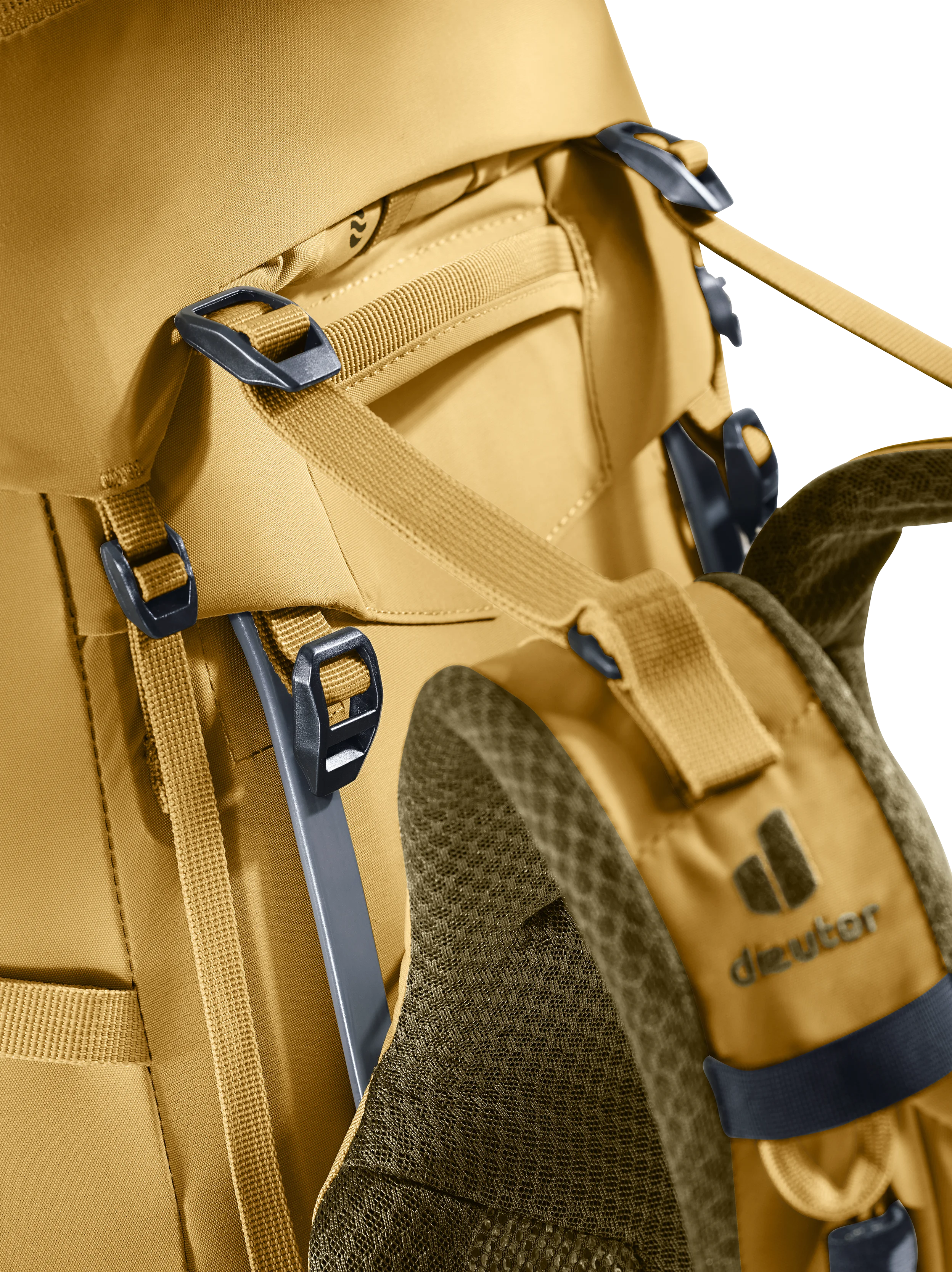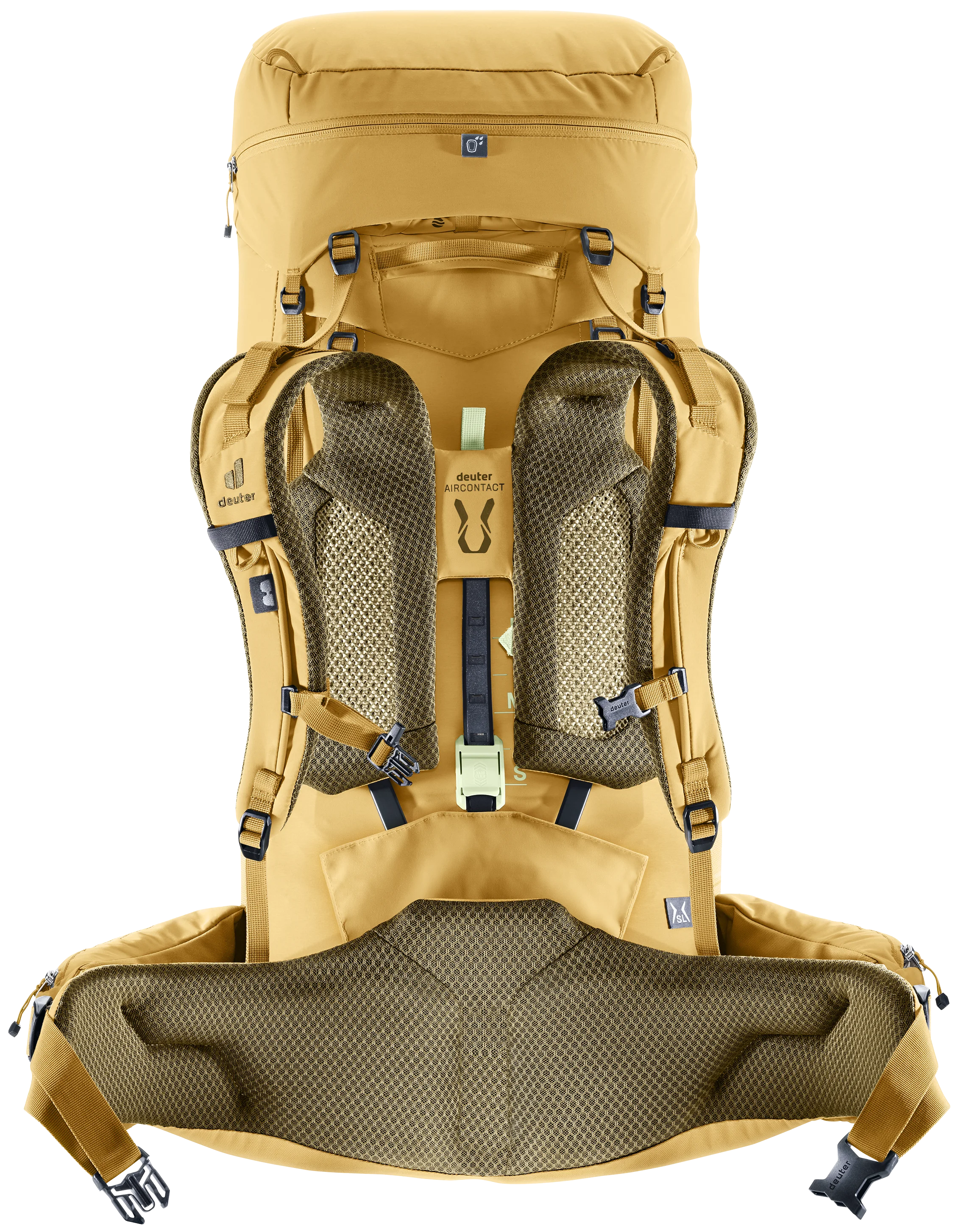 Der Rucksack lässt sich dank des neuen VariClick-Systems mit fünf Stufen individuell an die Rückenlänge anpassen. Der leicht bedienbare Mechanismus gibt durch ein spürbares Klick-Feedback Sicherheit beim Einrasten, während die zentrale Platzierung für eine gerade Ausrichtung sorgt. Die neuartigen ActiveBalance-Schulterträger passen sich durch das bewegliche Schulterträgerherz dynamisch der Körperbewegung an und gewährleisten zusammen mit dem VariFlex-System ein ausbalanciertes Tragegefühl sowie eine zentrierte Position des Rucksacks. Zudem erlauben zwei Positionen für die Lageverstellriemen eine präzise Anpassung an die Körpergröße. Die ECL-Hüftflossen verteilen das Gewicht gleichmäßig auf die Hüfte. Der teilweise freiliegende Aluminium-Y-Rahmen sorgt für Stabilität und ermöglicht in Kombination mit dem atmungsaktiven Air-Spacer-Mesh des Aircontact-Rückensystems maximale Luftzirkulation. Die durchgehende Polsterung an Hüftflossen und Schulterträgern reduziert Druckstellen und erhöht den Tragekomfort.