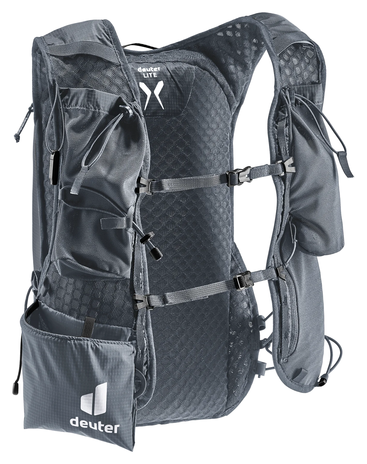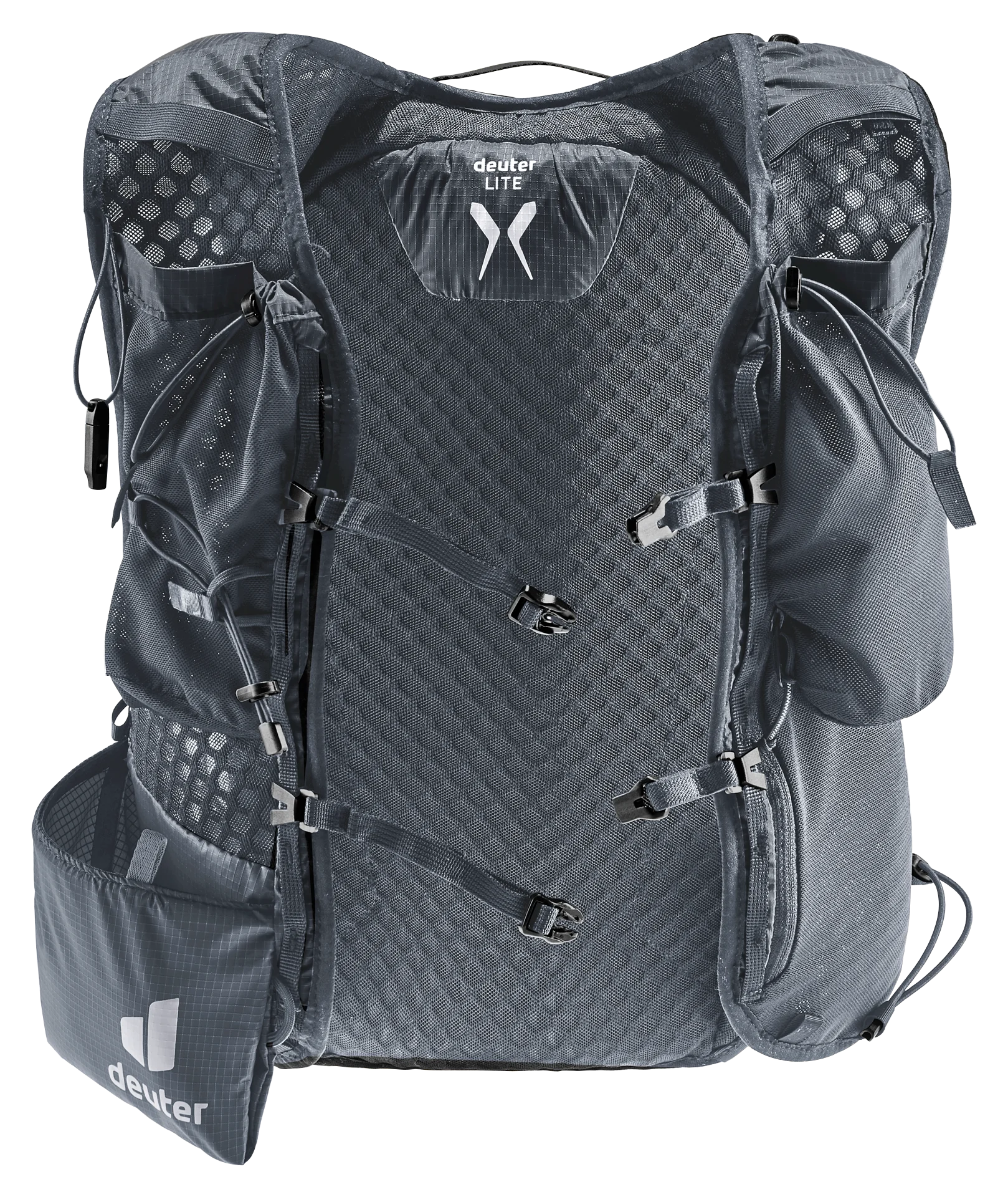 Leichtgewicht mit Komfort: ergonomische, westenförmige Schulterträger mit elastischem Kompressionsgurt, verstellbare Brustgurte und ein weiches Rückenmaterial lassen den Rucksack eng am Oberkörper anliegen. Zudem sorgen die Netzinnentasche und seitlichen Kompressionsriemen für eine Minimierung der Auf- und Abbewegung der Ladung beim Laufen. Die Holster-Stockhalterung am Schultergurt bietet schnellen Zugriff auf die Stöcke. Auch Softflask und GPS sind in den Taschen der Schulterträger stets griffbereit. Das Hauptmaterial des Trailrunnig-Rucksacks ist zu 100% recycelt und bluesign® zertifiziert.