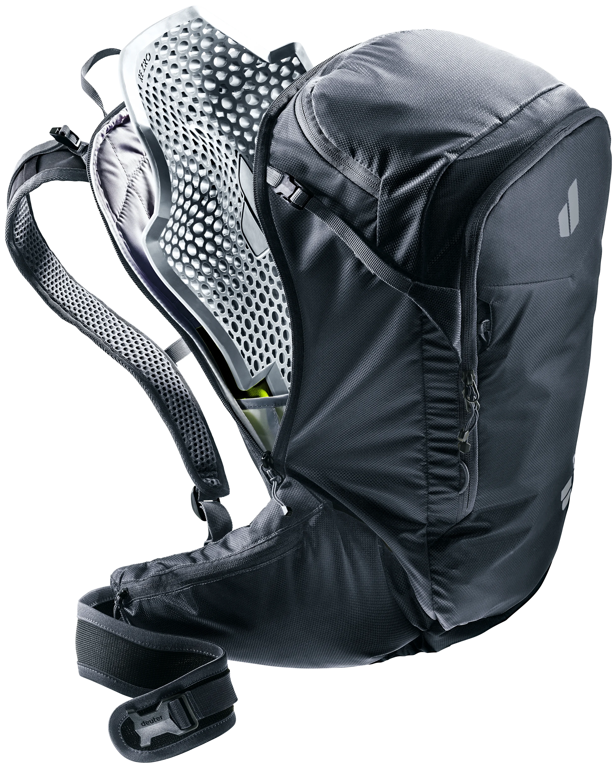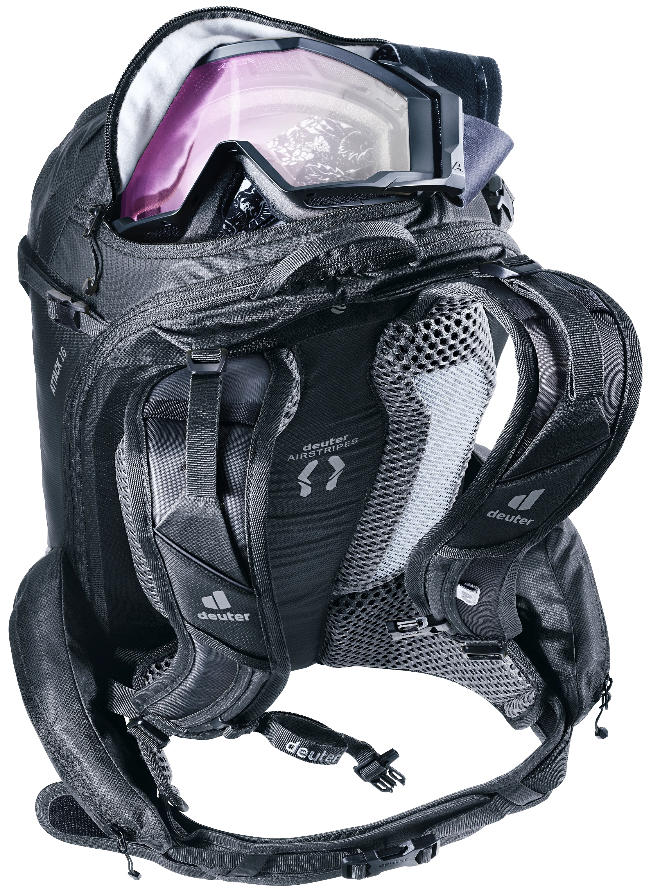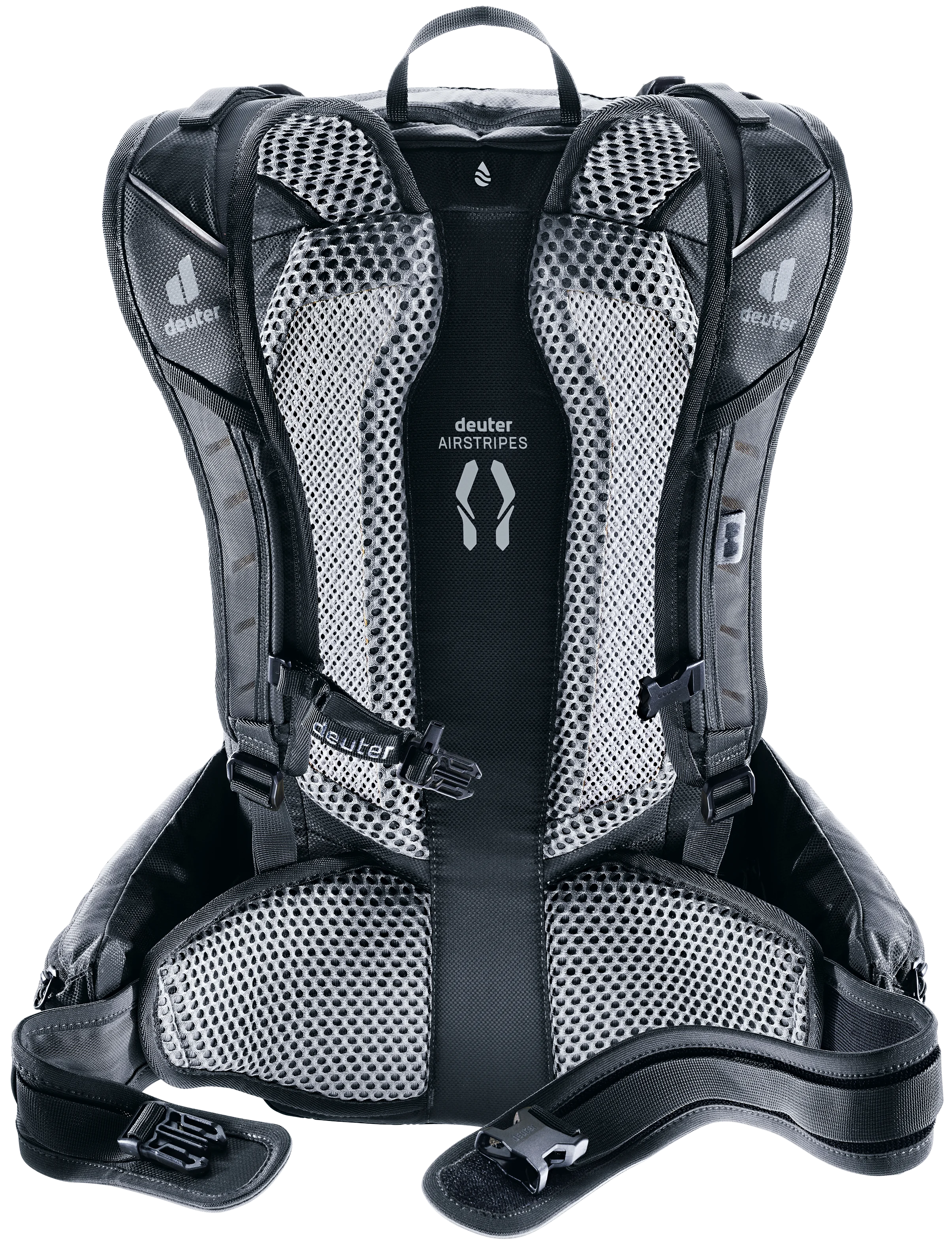 Das Airstripes-Rückensystem reduziert die Kontaktfläche des Rucksacks am Rücken und sorgt so für ein angenehmes Tragegefühl. Der Belüftungskanal in Kombination mit den perforierten Hüftflossen und Schulterträgern garantiert nicht nur eine hervorragende Luftzirkulation, sondern auch höchsten Komfort bei langen Fahrten.