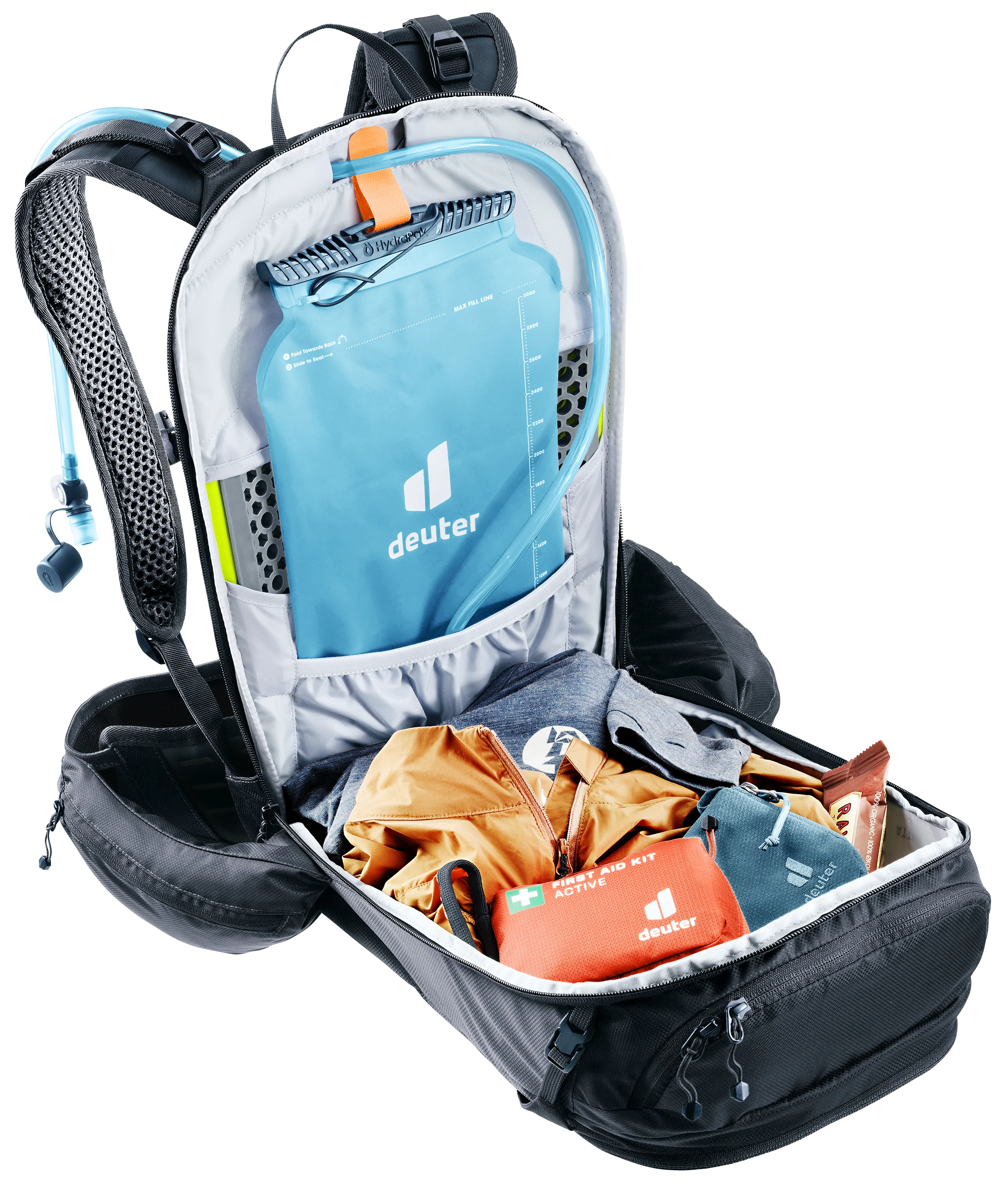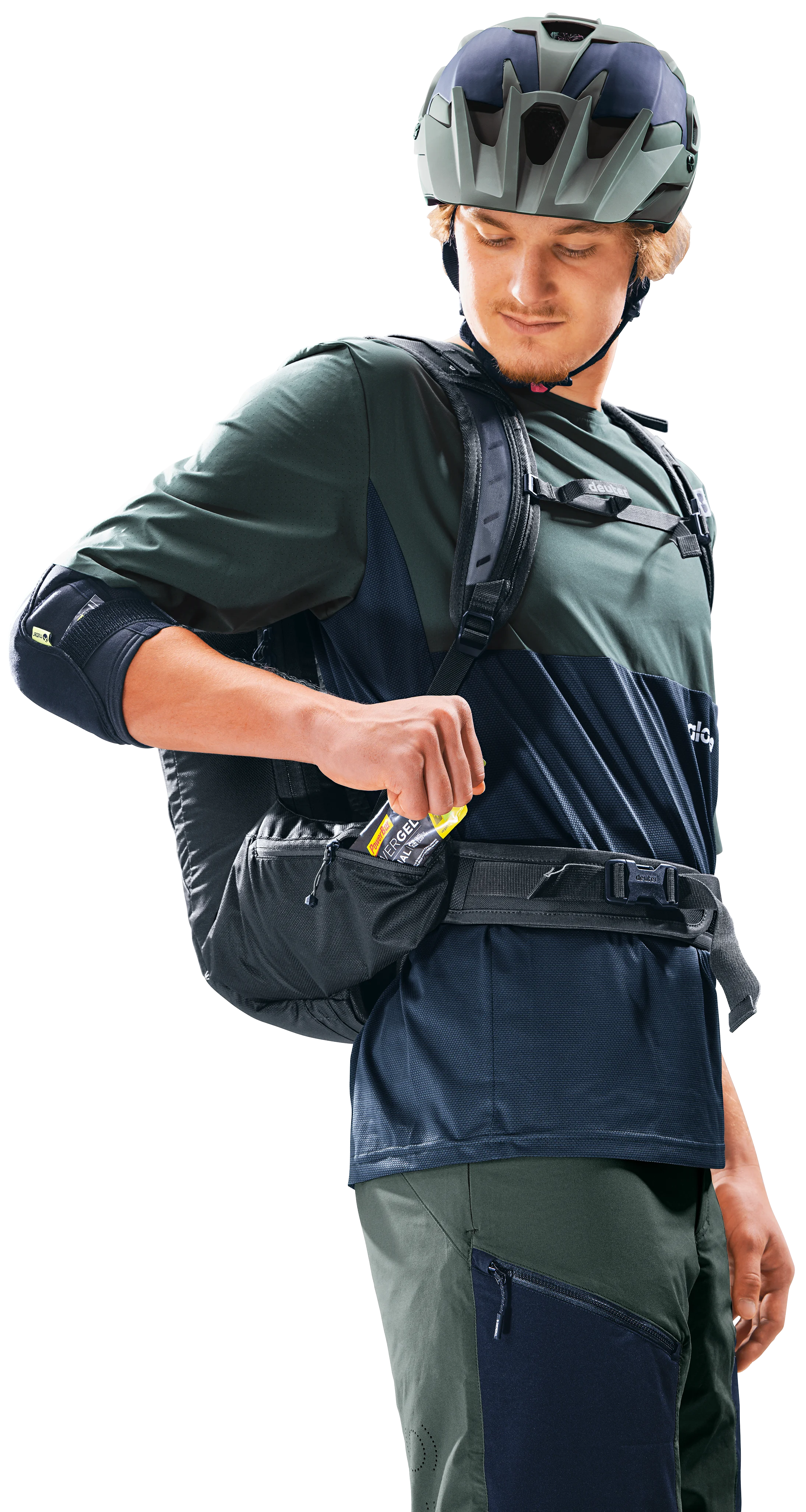 Das luftdurchlässige Airstripes-Rückensystem mit atmungsaktivem Air-Spacer-Mesh und der stromlinienförmige Packsack gewährleisten eine kompakte Passform. Die Hüftflossen gehen in den elastischen Hüftgurt über und bieten zugleich Halt und Bewegungsfreiheit beim Atmen. Zusätzliche Komprimierung erfolgt über die an Packsack und Hüftgurt angebrachten extrabreiten Hüftflossentaschen. Ergonomische Schulterträger und Lageverstellriemen optimieren die Balance und bieten damit einen sicheren, passgenauen Sitz auf anspruchsvollen Trails.