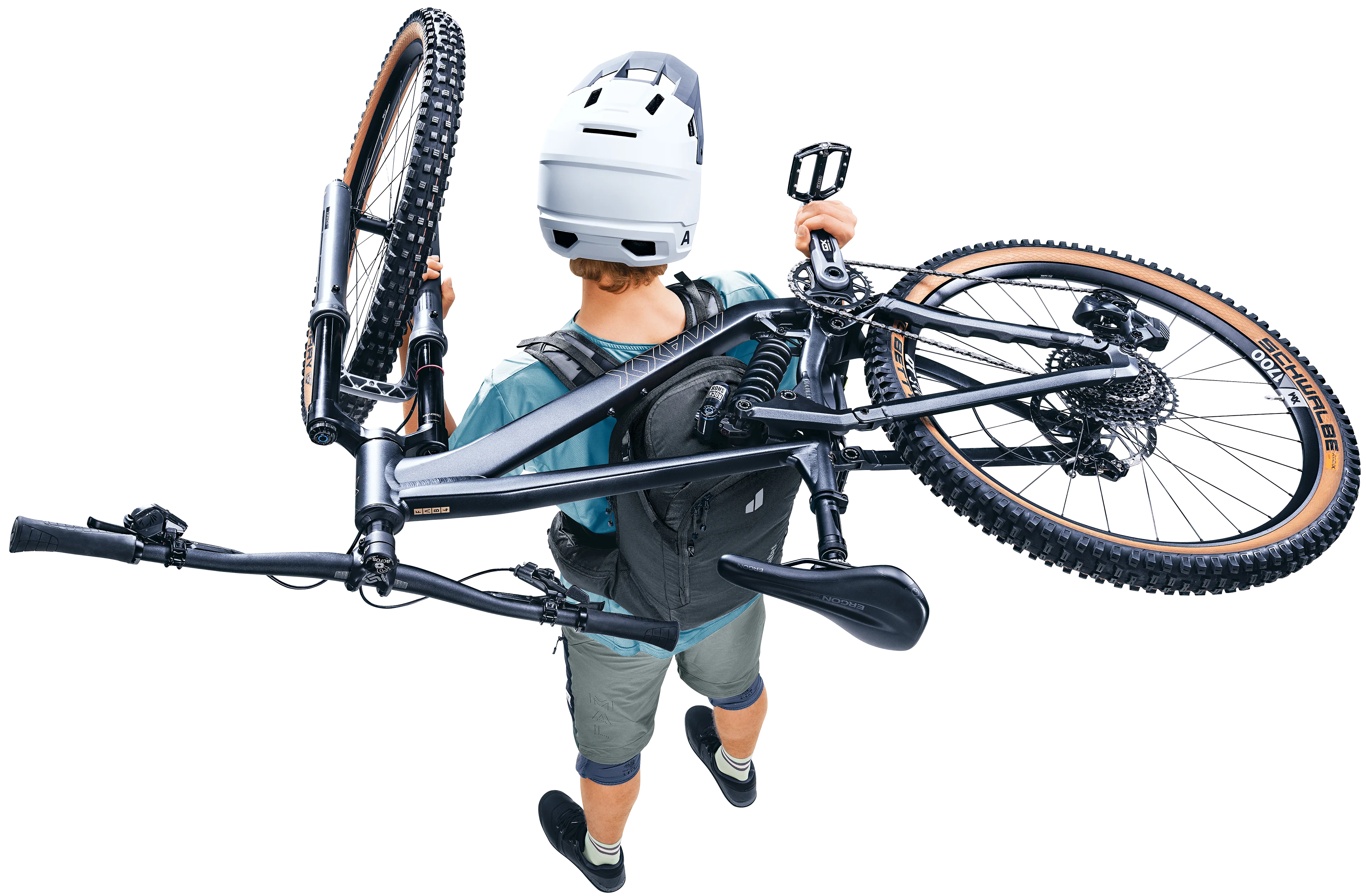 - Carrying Guard: um das Bike in Trage-Passagen fest auf dem Rucksack zu tragen