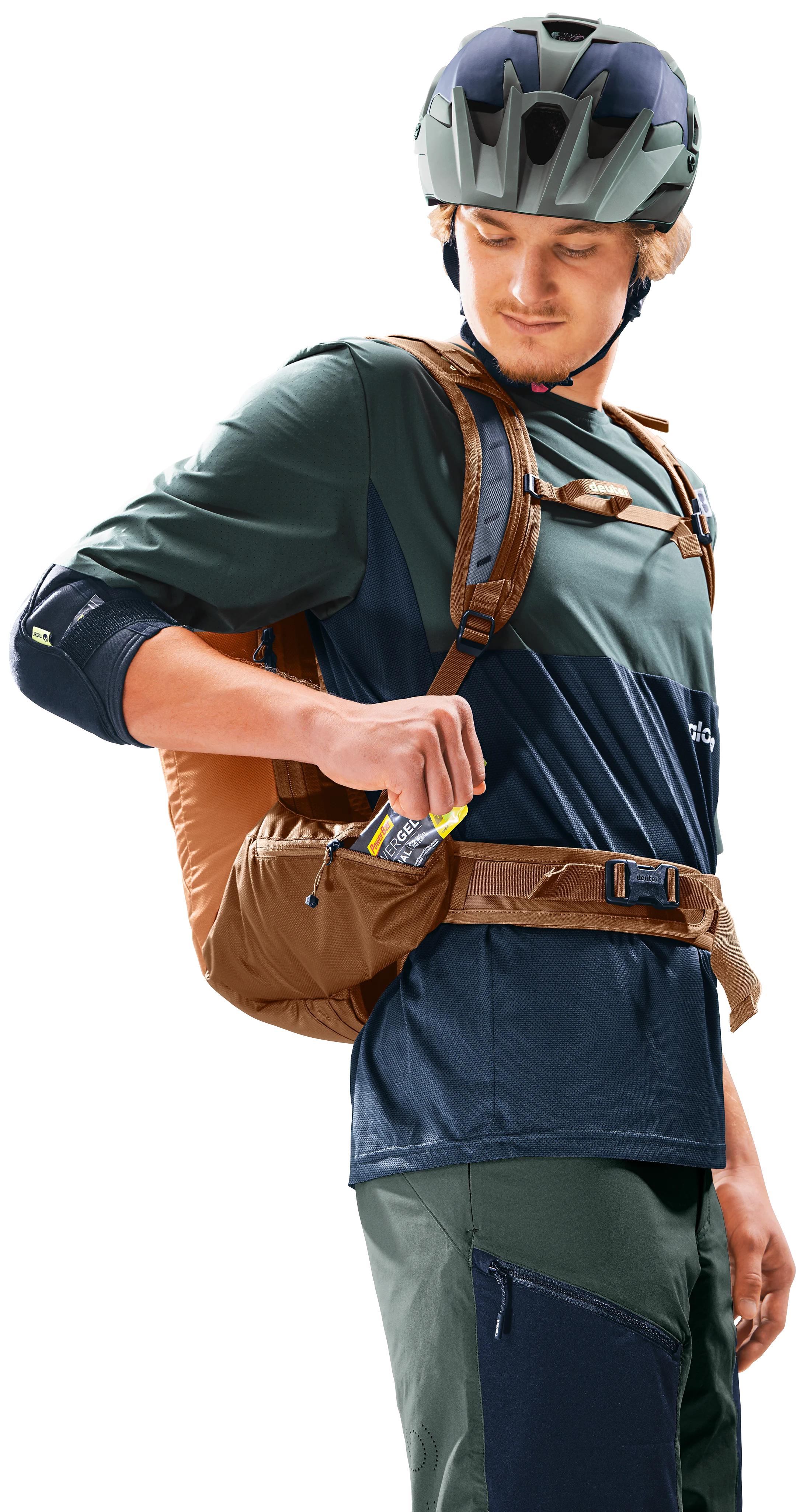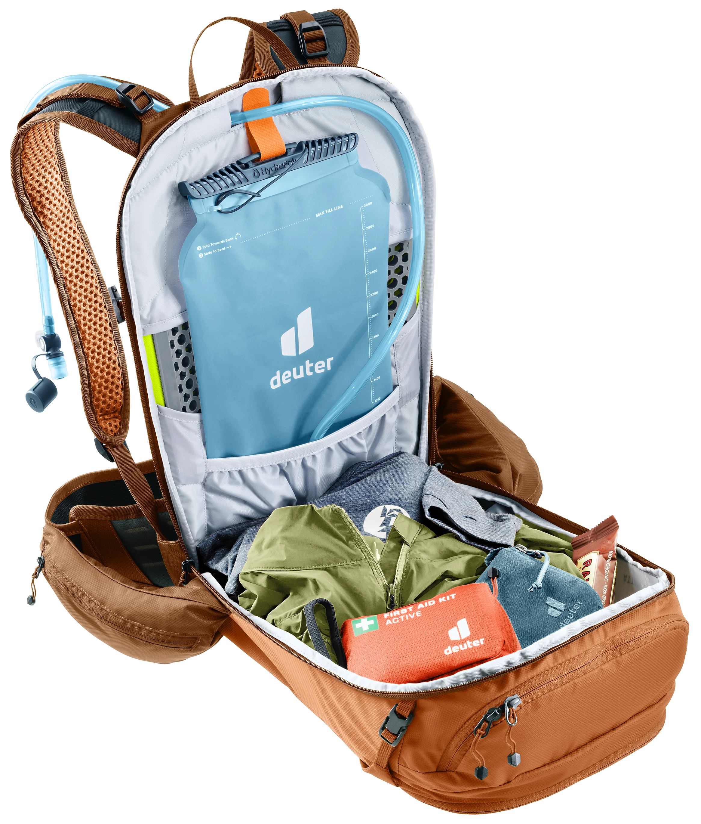 Das luftdurchlässige Airstripes-Rückensystem mit atmungsaktivem Air-Spacer-Mesh und der stromlinienförmige Packsack gewährleisten eine kompakte Passform. Die Hüftflossen gehen in den elastischen Hüftgurt über und bieten zugleich Halt und Bewegungsfreiheit beim Atmen. Zusätzliche Komprimierung erfolgt über die an Packsack und Hüftgurt angebrachten extrabreiten Hüftflossentaschen. Ergonomische Schulterträger und Lageverstellriemen optimieren die Balance und bieten damit einen sicheren, passgenauen Sitz auf anspruchsvollen Trails.