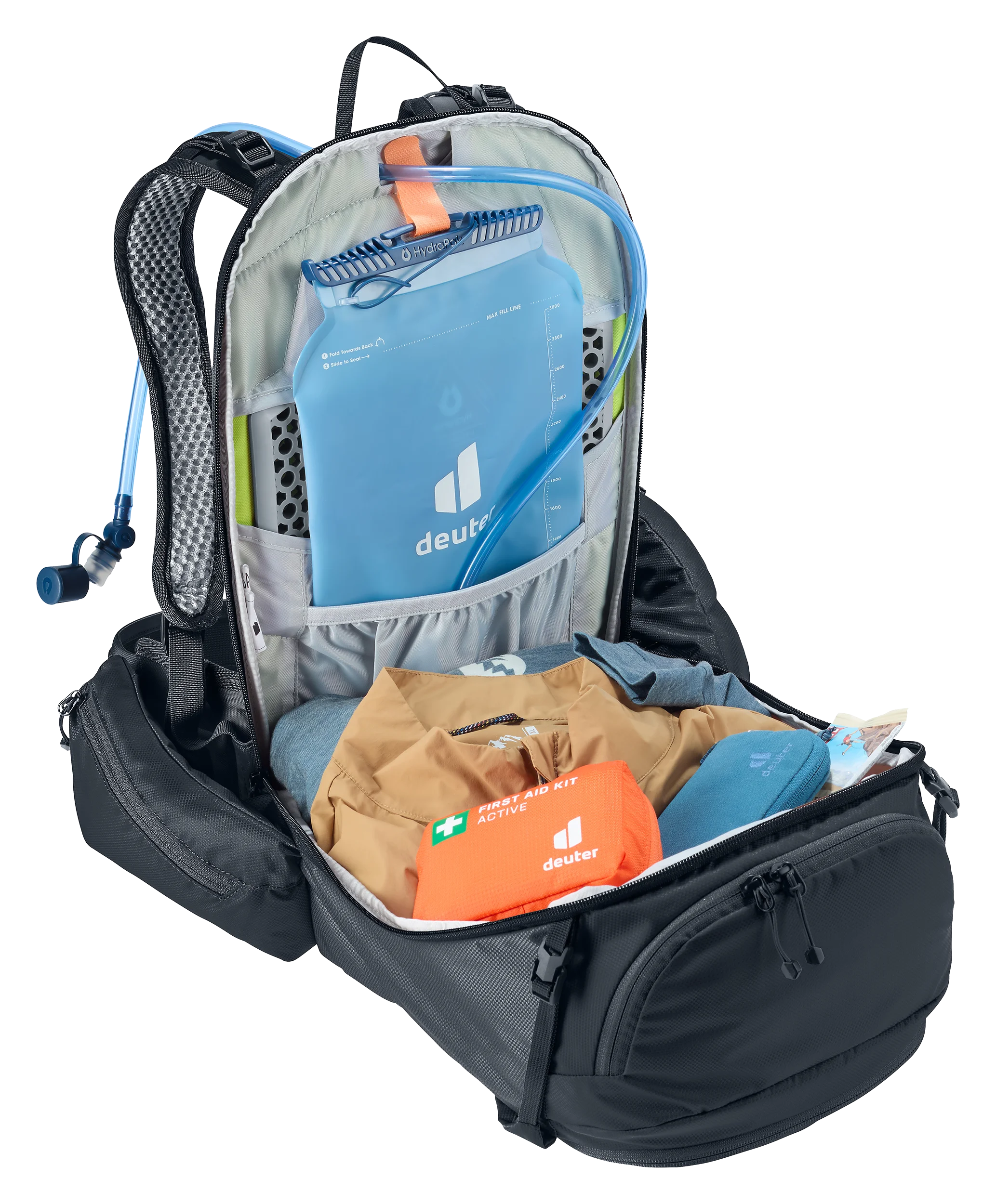 Das luftdurchlässige Airstripes-Rückensystem mit atmungsaktivem Air-Spacer-Mesh und der stromlinienförmige Packsack gewährleisten eine kompakte Passform. Die Hüftflossen gehen in den elastischen Hüftgurt über und bieten zugleich Halt und Bewegungsfreiheit beim Atmen. Zusätzliche Komprimierung erfolgt über die an Packsack und Hüftgurt angebrachten extrabreiten Hüftflossentaschen. Ergonomische Schulterträger und Lageverstellriemen optimieren die Balance und bieten damit einen sicheren, passgenauen Sitz auf anspruchsvollen Trails.