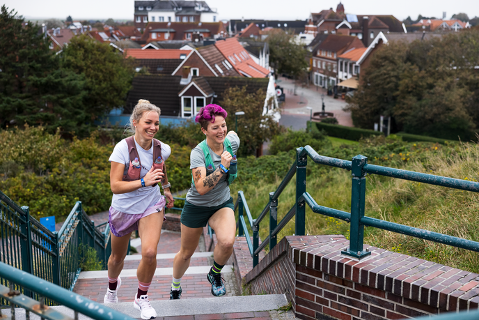 - Gehen ist keine Schande: Denn an besonders steilen Anstiegen ist Gehen sogar effizienter. Schalte in den Speed-Hiking-Modus um und drücke dich kräftig vom Boden ab. So sparst du Energie und bist kaum langsamer als im Laufschritt. Laufstöcke geben dir einen Extra-Turboantrieb. Sie entlasten die Beine. Ohne Stöcke kannst du dich am Oberschenkel abstützen, kurz oberhalb des Kniegelenks.