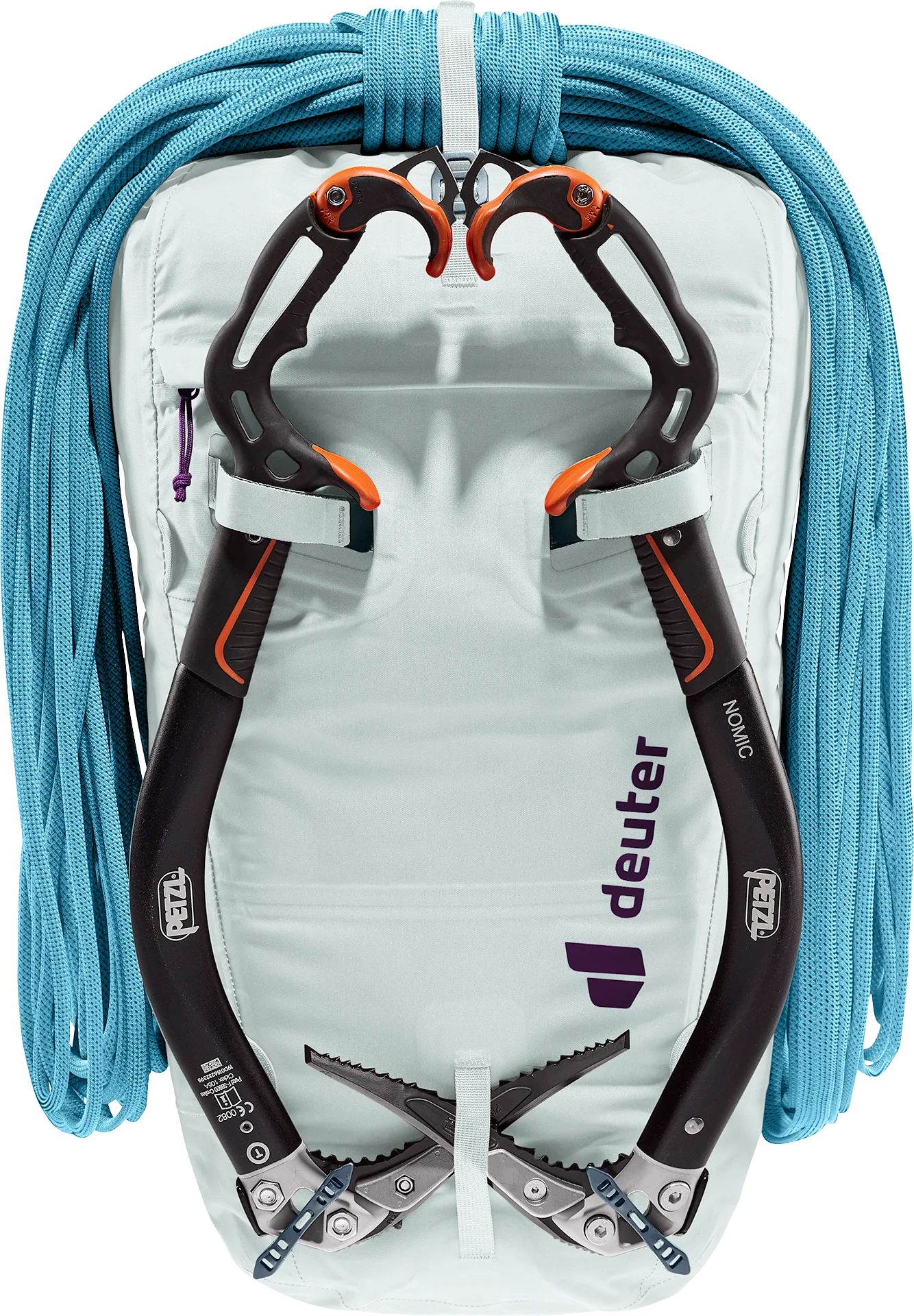 Strapazierfähiges Material, getapte, wasserdicht versiegelte Nähte, TPU beschichtete und mit einem Flap geschützte Reißverschlüsse sowie die Rolltop-Deckelkonstruktion schützen den Inhalt des Mountaineering-Rucksacks sicher vor dem Eindringen von Nässe. Zudem sorgen durchdachte Befestigungsschlaufen und seitlich verstaubare Hüftflossen nicht nur für ein herausragendes Komfort-Gewichts-Verhältnis, sondern ermöglichen Bergsportlerinnen auch das Tragen eines Gurtes und damit den vielseitigen Einsatz des wasserdichten Rucksacks.