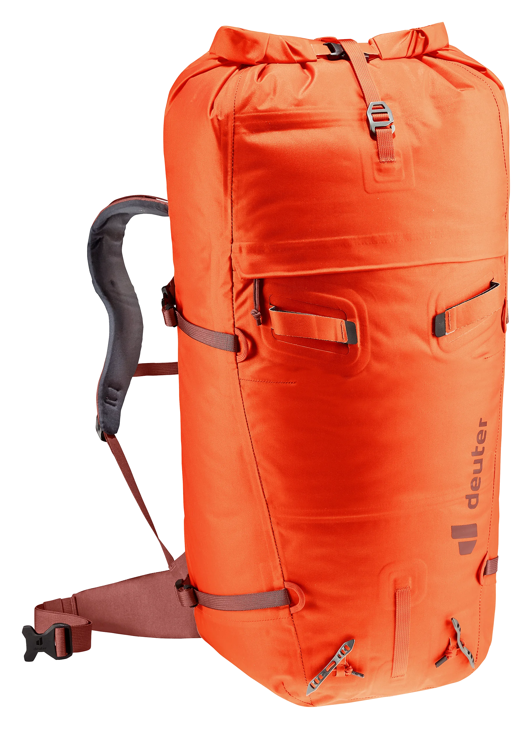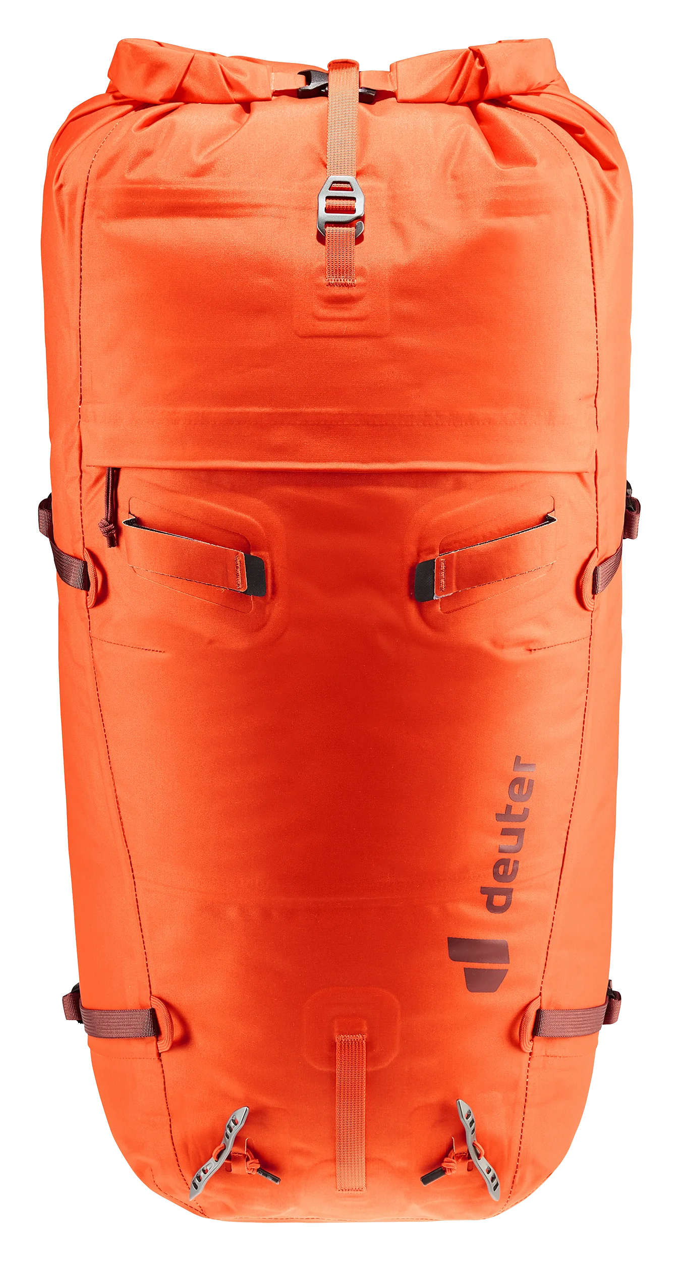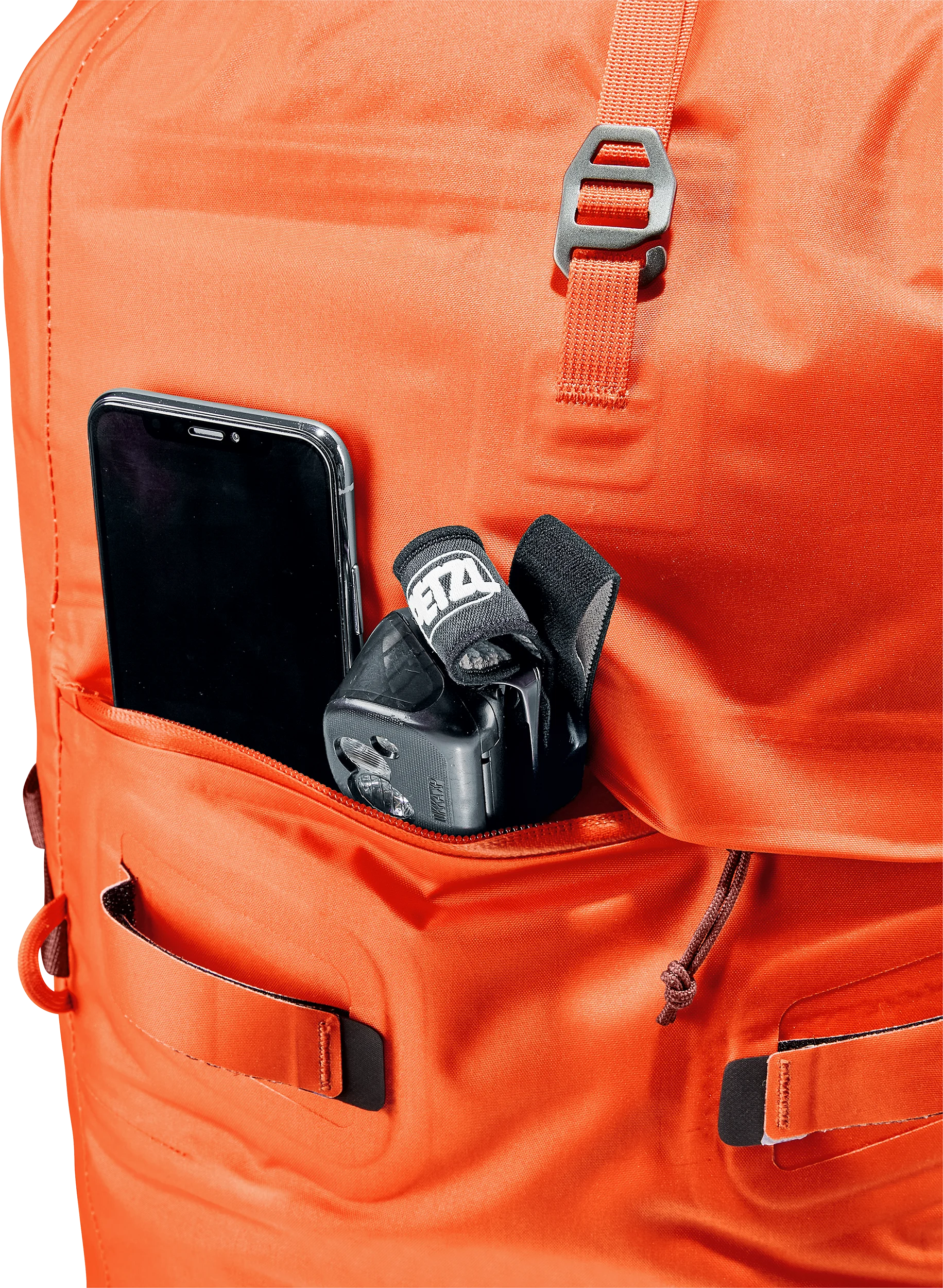 Strapazierfähiges Material, getapte, wasserdicht versiegelte Nähte, TPU beschichtete und mit einem Flap geschützte Reißverschlüsse sowie die Rolltop-Deckelkonstruktion schützen den Inhalt des Mountaineering-Rucksacks sicher vor dem Eindringen von Nässe. Zudem sorgen die seitlich verstaubaren Hüftflossen nicht nur für ein herausragendes Komfort-Gewichts-Verhältnis, sondern ermöglichen Bergsportlerinnen auch das Tragen eines Gurtes. Durchdachte Befestigungsschlaufen und Kompressionsriemen zur Fixierung von Ski unterstützen den vielseitigen Einsatz des wasserdichten Rucksacks.