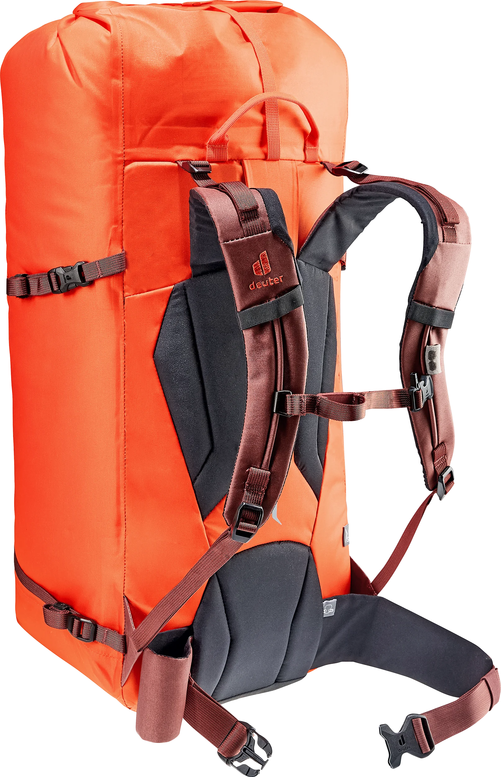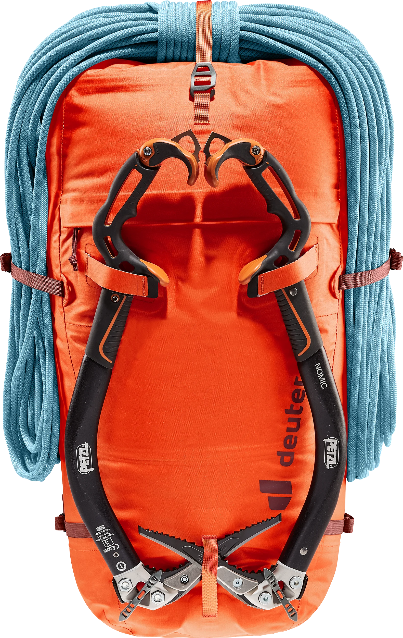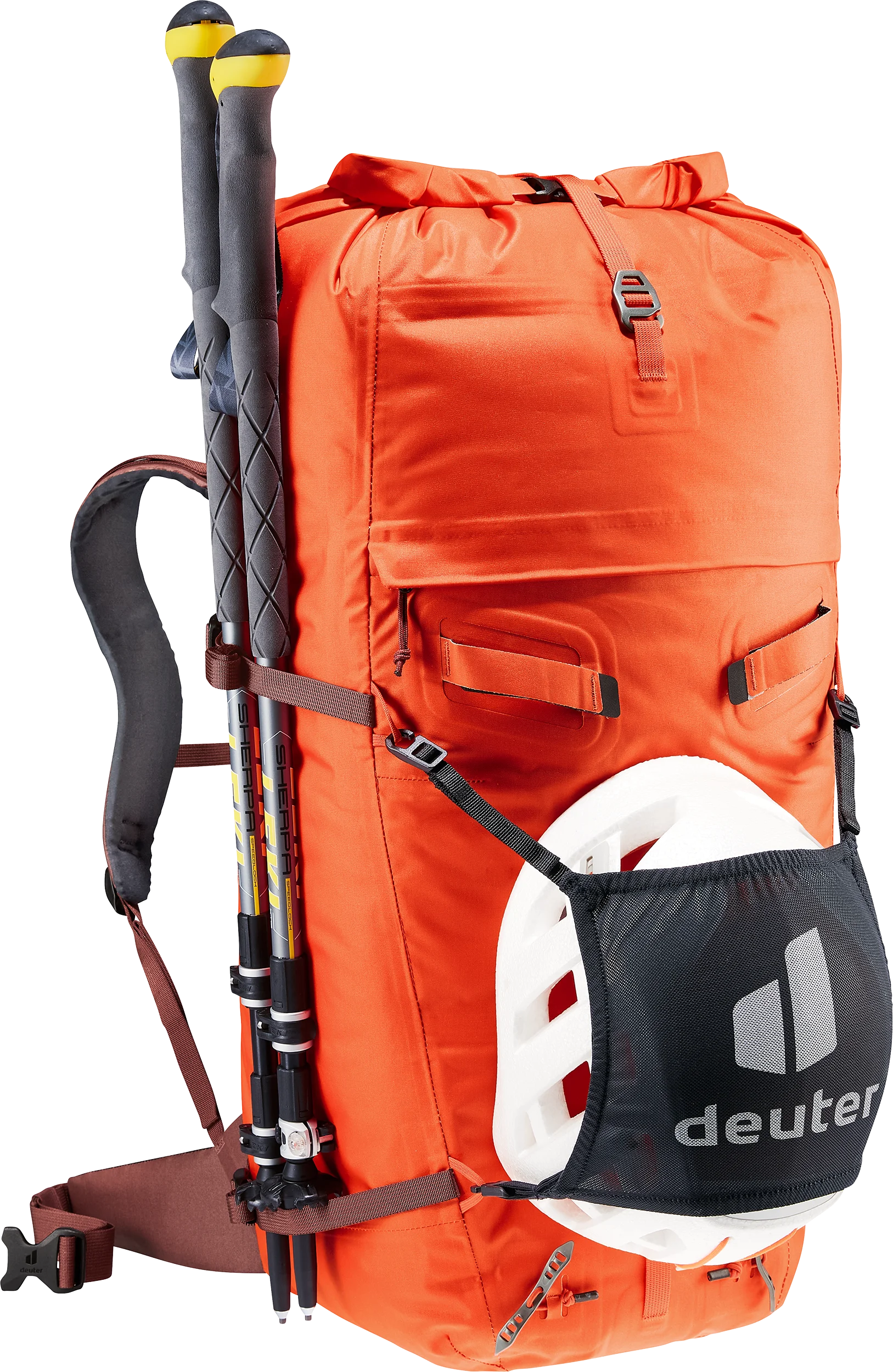 Strapazierfähiges Material, getapte, wasserdicht versiegelte Nähte, TPU beschichtete und mit einem Flap geschützte Reißverschlüsse sowie die Rolltop-Deckelkonstruktion schützen den Inhalt des Mountaineering-Rucksacks sicher vor dem Eindringen von Nässe. Zudem sorgen die seitlich verstaubaren Hüftflossen nicht nur für ein herausragendes Komfort-Gewichts-Verhältnis, sondern ermöglichen Bergsportlerinnen auch das Tragen eines Gurtes. Durchdachte Befestigungsschlaufen und Kompressionsriemen zur Fixierung von Ski unterstützen den vielseitigen Einsatz des wasserdichten Rucksacks.