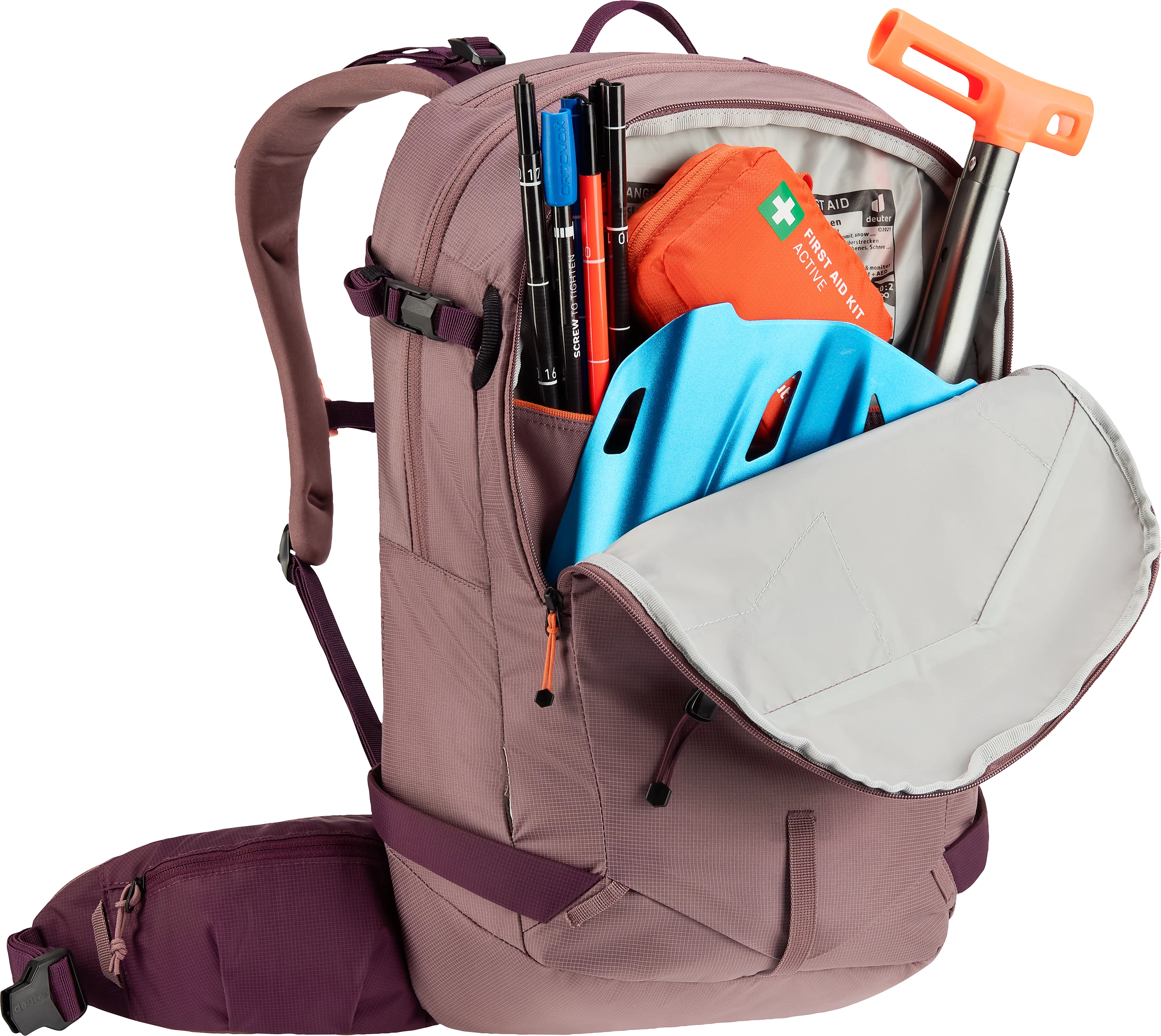 Dank der großen Rückenöffnung ist ein schneller Zugriff auf das Hauptfach garantiert. Der rundum laufende Reißverschluss ist unterhalb der Schulterträger eingesetzt, sodass keine Träger oder Riemen beim Öffnen stören. So können Skier, Snowboard oder Steigeisen beim Ein- und Auspacken befestigt bleiben. Das spezielle Fach für die Lawinensicherheitsausrüstung ermöglicht zudem einen schnellen Zugriff auf essenzielles Equipment im Notfall.
