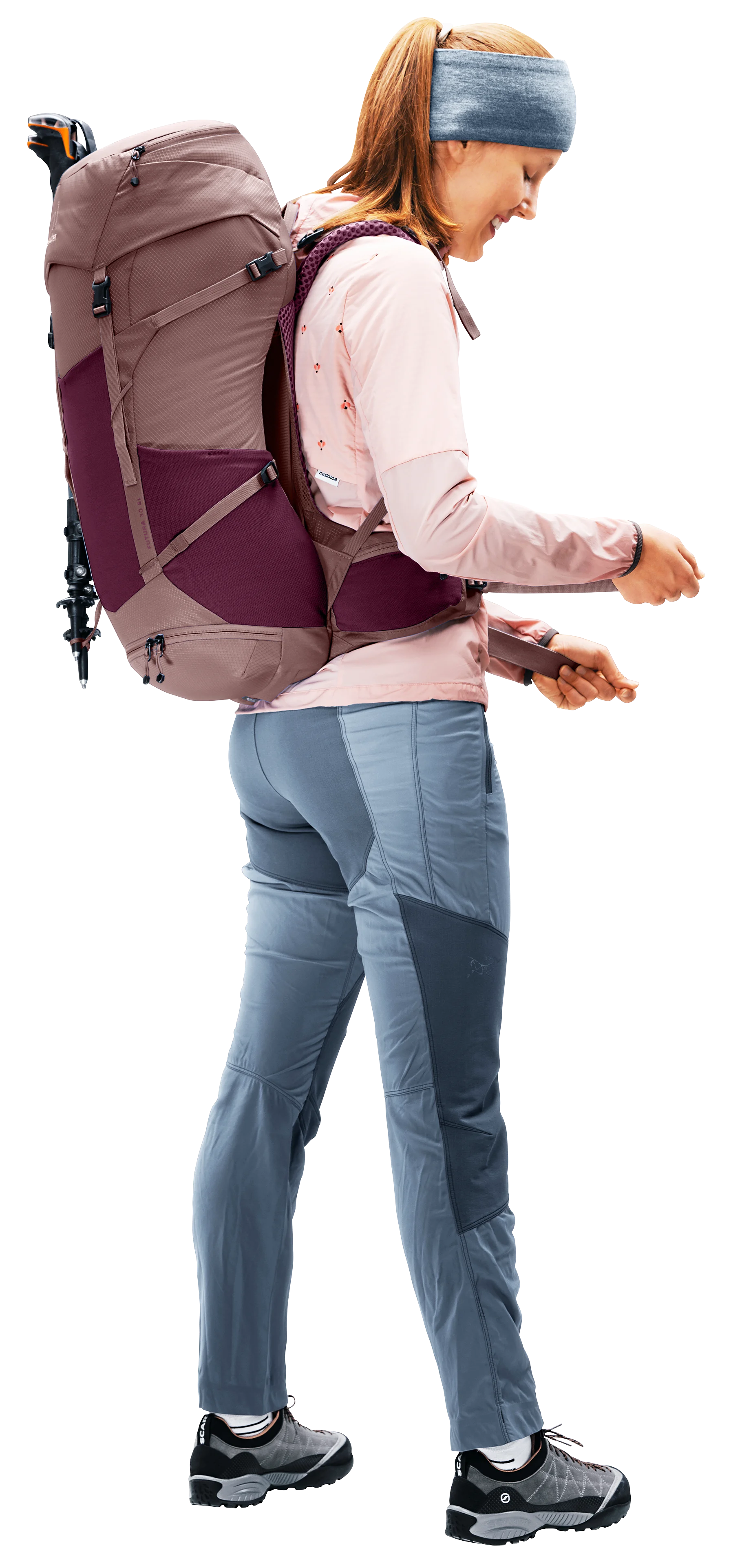 Die Stöcke lassen sich vorne am Rucksackträger befestigen und sind somit direkt während des Gehens zugänglich. Eine große Stretchaußentasche mit zusätzlichem seitlichem Zugriff ermöglicht es, Gegenstände, wie eine Trinkflasche bequem zu greifen, ohne den Rucksack abzusetzen. Zusätzlich sorgen zwei Hüftflossentaschen, zwei Deckelfächer, ein separates Bodenfach und ein großes Stretchfach an der Vorderseite für optimale Organisation. Der geräumige Zugang über den Toploader bietet schnellen Zugriff zum Innenfach.