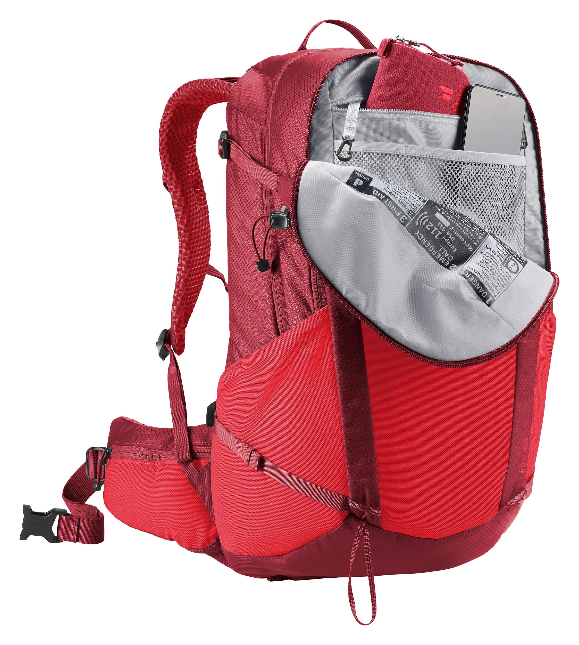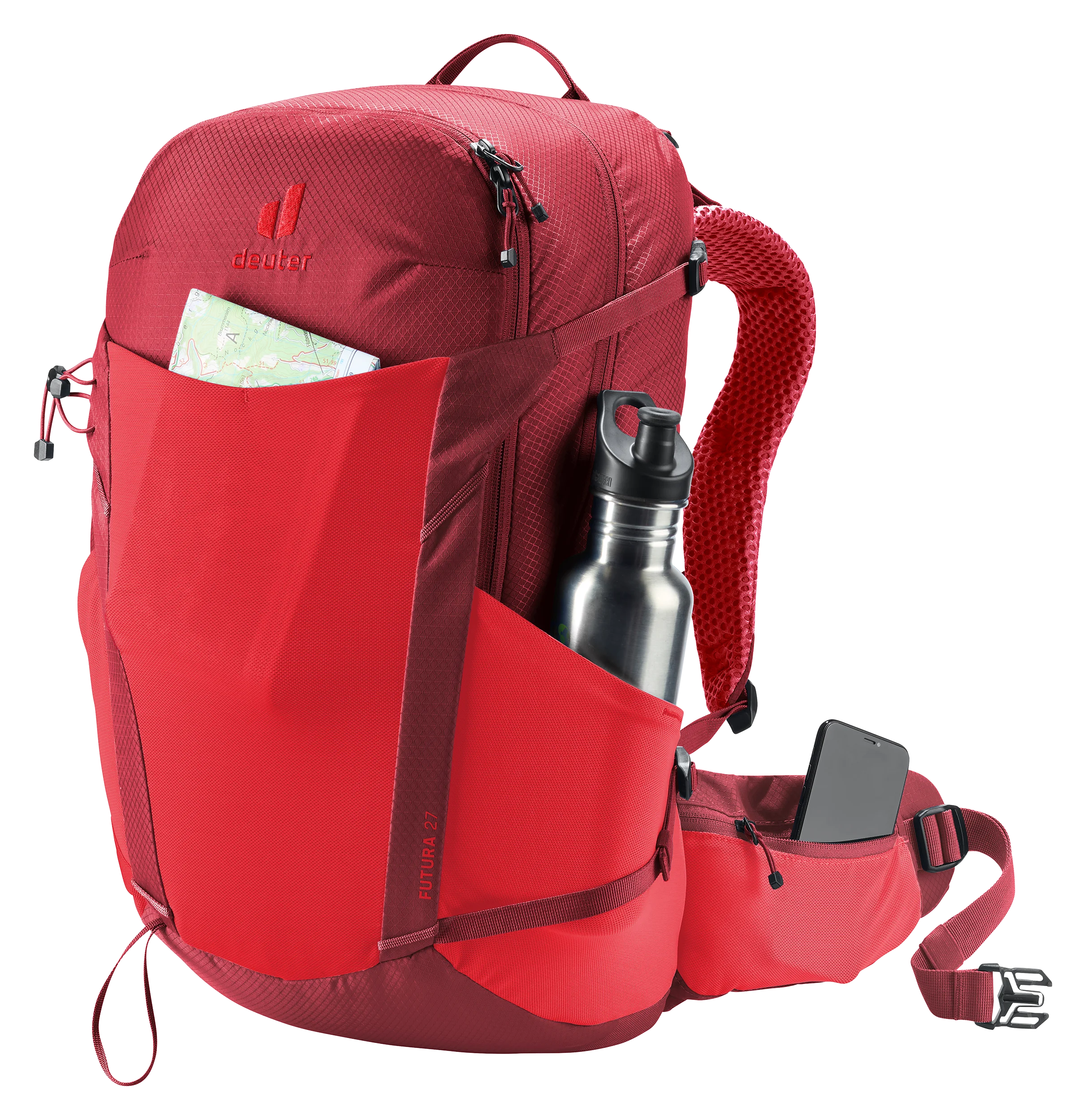 Die Stöcke lassen sich vorne am Rucksackträger befestigen und sind somit direkt während des Gehens zugänglich. Eine große Stretchaußentasche mit zusätzlichem seitlichem Zugriff ermöglicht es, Gegenstände, wie eine Trinkflasche bequem zu greifen, ohne den Rucksack abzusetzen. Zusätzlich sorgen zwei Hüftflossentaschen, zwei Deckelfächer, ein separates Bodenfach und ein großes Stretchfach an der Vorderseite für optimale Organisation. Der geräumige Zugang über den Toploader bietet schnellen Zugriff zum Innenfach.