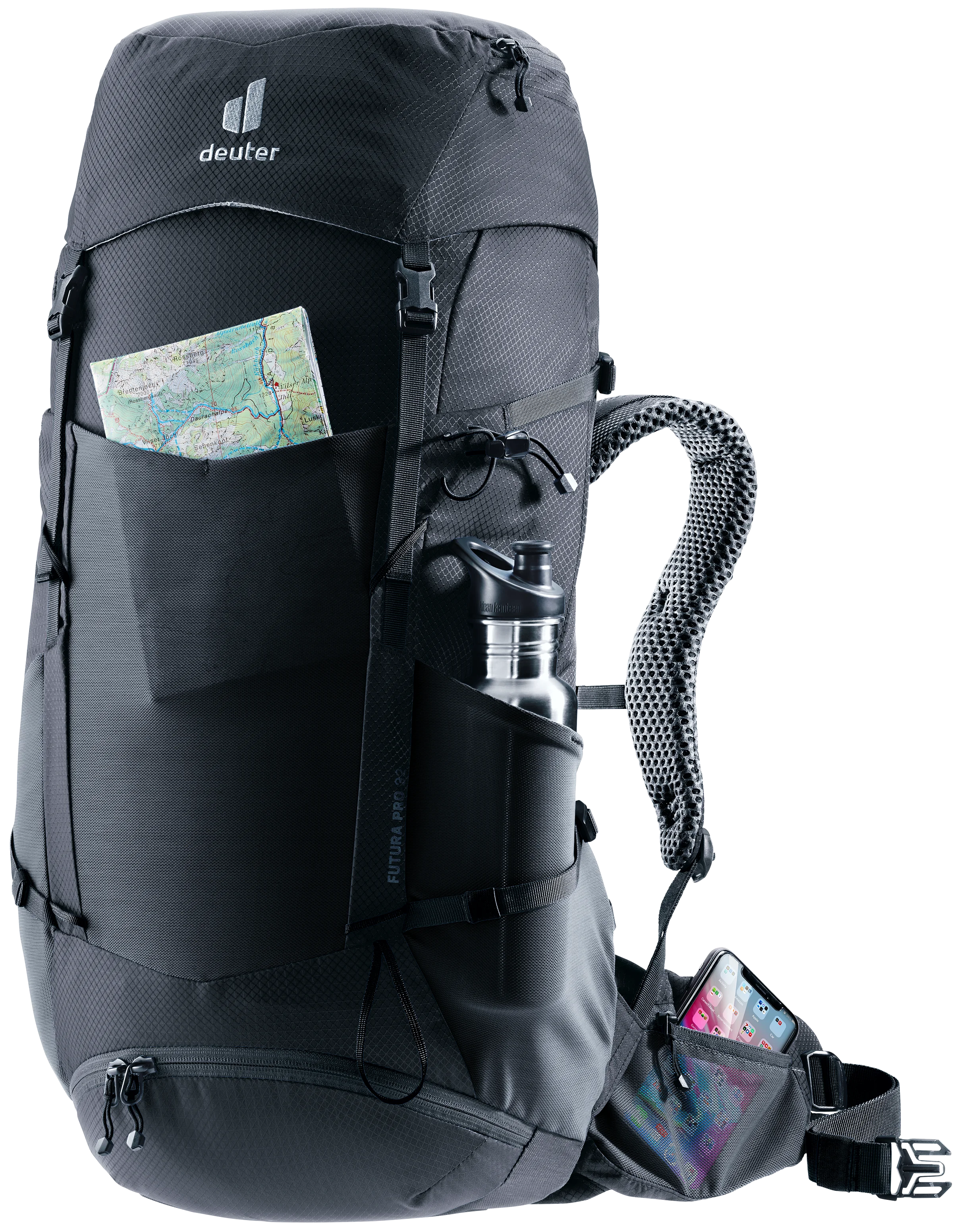 Die Stöcke lassen sich vorne am Rucksackträger befestigen und sind somit direkt während des Gehens zugänglich. Eine große Stretchaußentasche mit zusätzlichem seitlichem Zugriff ermöglicht es, Gegenstände, wie eine Trinkflasche bequem zu greifen, ohne den Rucksack abzusetzen. Zusätzlich sorgen zwei Hüftflossentaschen, zwei Deckelfächer, ein separates Bodenfach und ein großes Stretchfach an der Vorderseite für optimale Organisation. Der geräumige Zugang über den Toploader bietet schnellen Zugriff zum Innenfach.