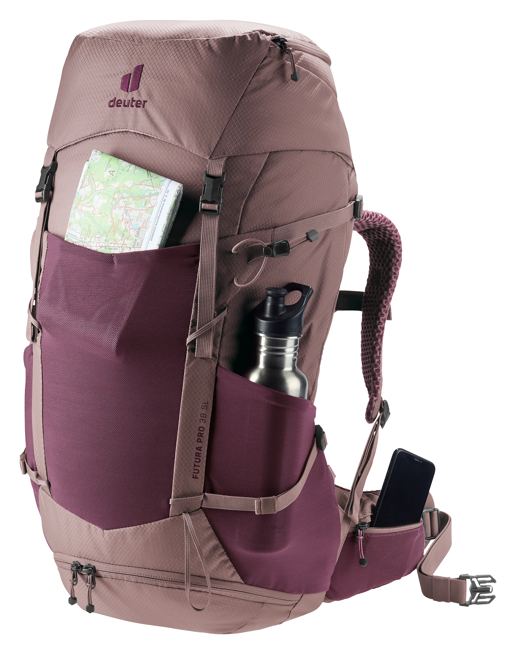 Die Stöcke lassen sich vorne am Rucksackträger befestigen und sind somit direkt während des Gehens zugänglich. Eine große Stretchaußentasche mit zusätzlichem seitlichem Zugriff ermöglicht es, Gegenstände, wie eine Trinkflasche bequem zu greifen, ohne den Rucksack abzusetzen. Zusätzlich sorgen zwei Hüftflossentaschen, zwei Deckelfächer, ein separates Bodenfach und ein großes Stretchfach an der Vorderseite für optimale Organisation. Der geräumige Zugang über den Toploader bietet schnellen Zugriff zum Innenfach.