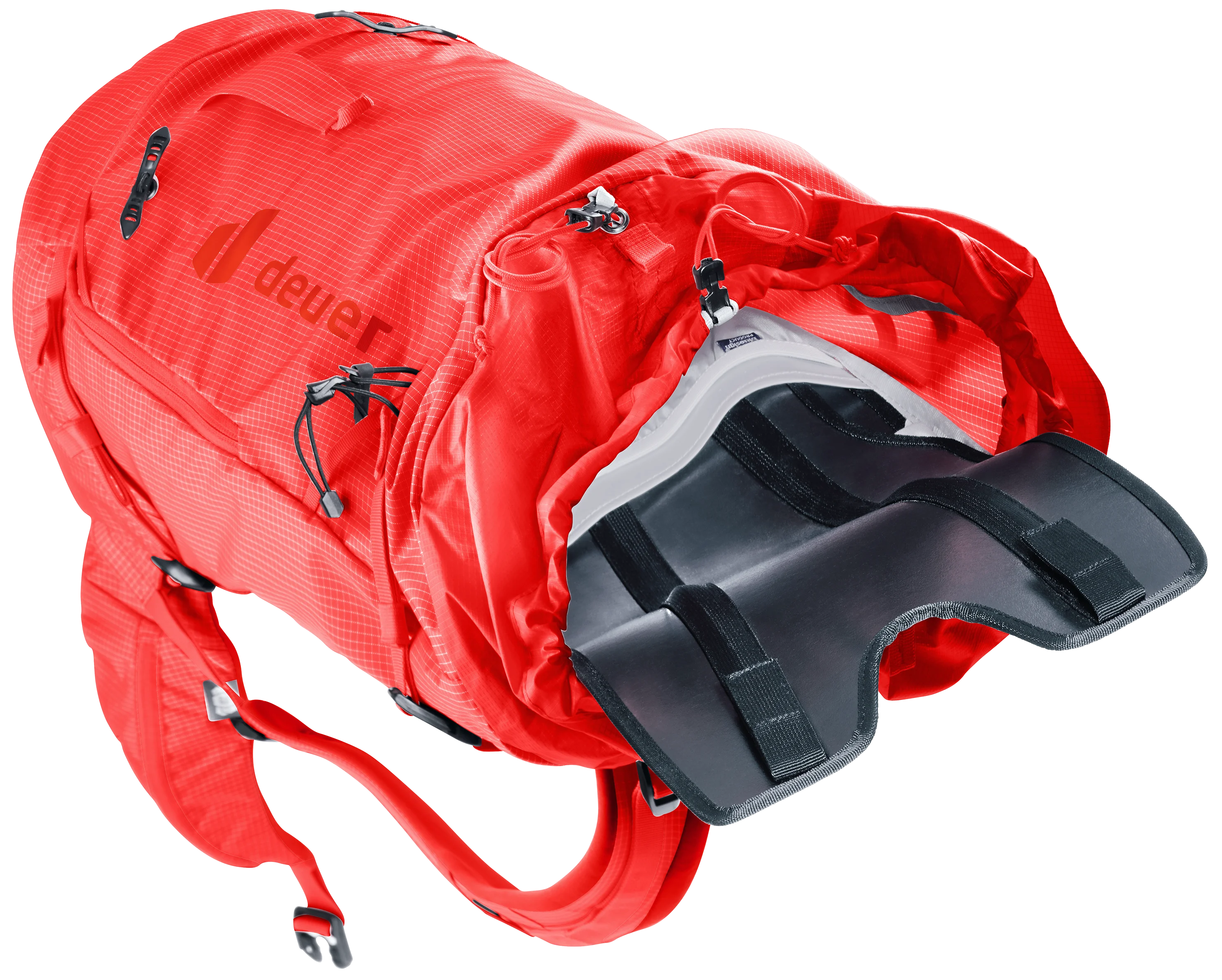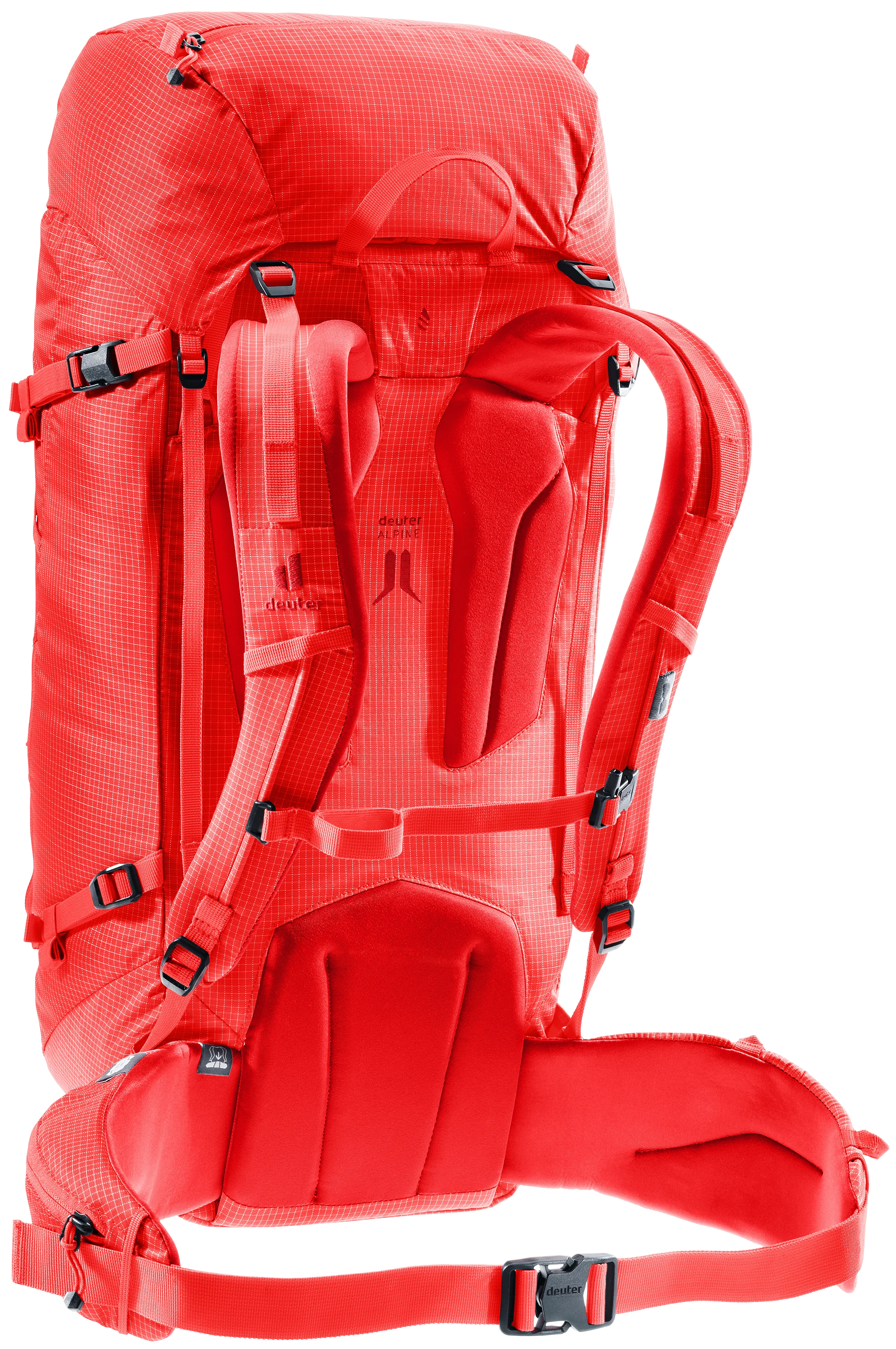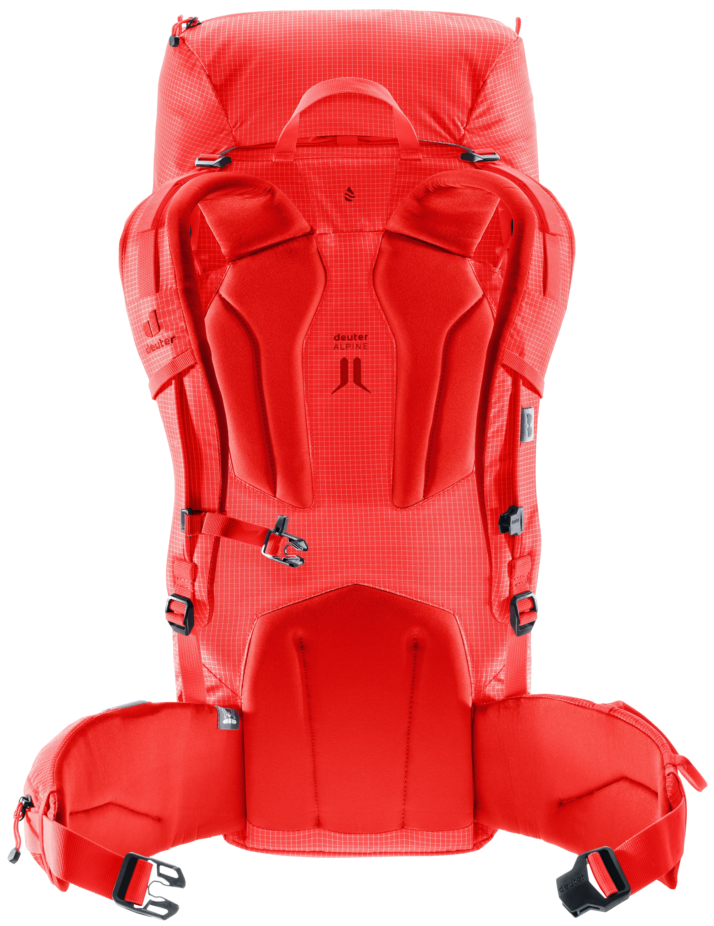 Das Alpine-Rückensystem bietet einen stabilen, sicheren Sitz für konzentriertes Agieren und hohen Tragekomfort in alpinem Terrain. Zudem sorgen die seitlichen Kompressionsriemen für die Fixierung des Rucksackvolumens nahe am Körperschwerpunkt.