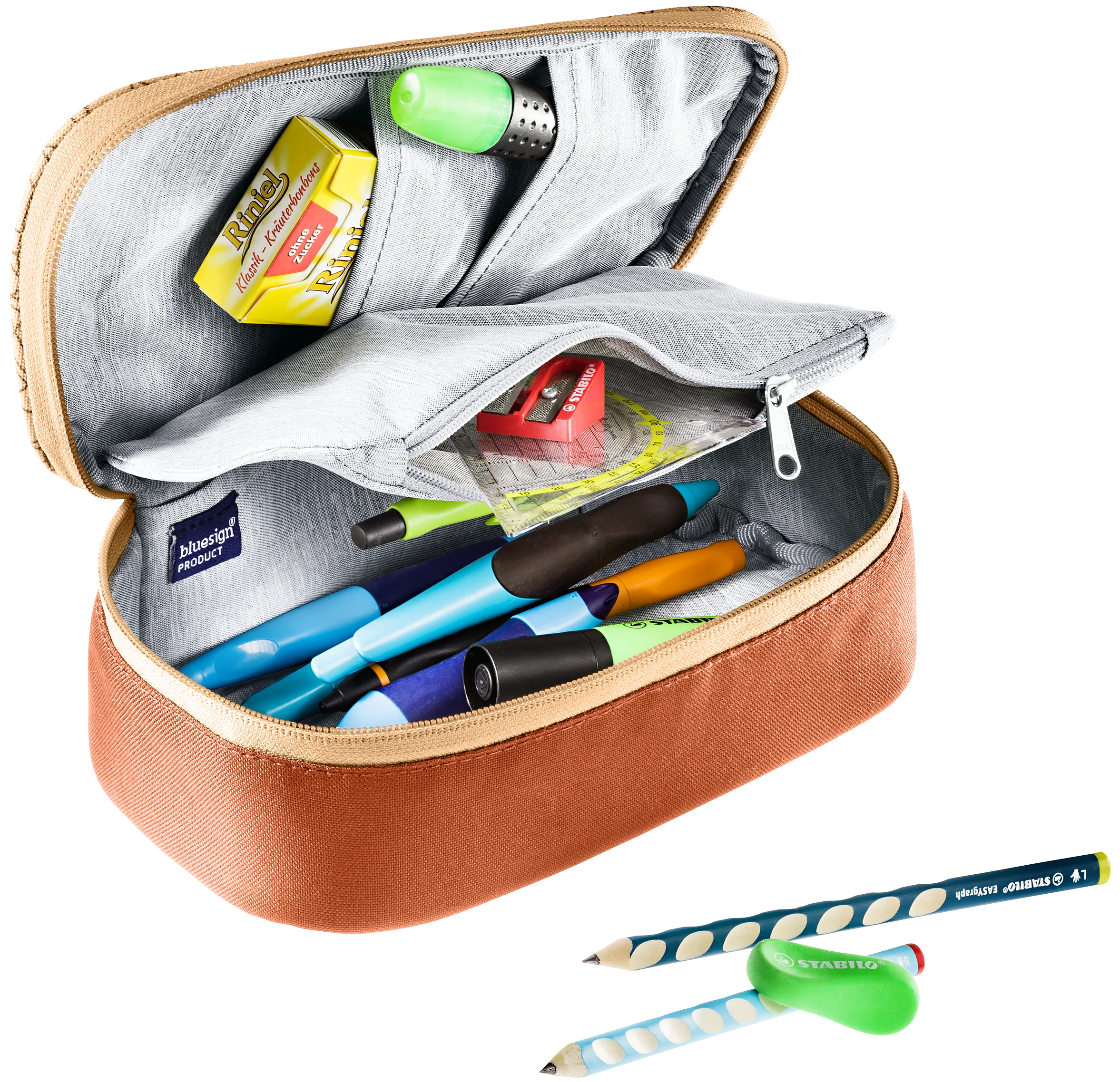 Das praktische Federmäppchen in vielen bunten Farben bietet Platz für alles was du an deinem Schultag so brauchst! Größere Gegenstände wie Bleistifte, Filzmalstifte, Füller und Spitzer kannst du im geräumigen Haupfach unterbringen, Radiergummi, Geo-Dreieck und andere sperrigere Dinge, finden im Reisverschlussfach platz und in den Steckfächern kannst du Zirkel und Tipp-Ex verstauen. Praktisch und zudem auch noch nachhaltig: das bluesign® Product aus 100 % recyceltem Hauptmaterial ist zudem mit dem Grünen Knopf zertifiziert und PFC-frei.