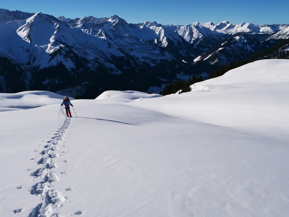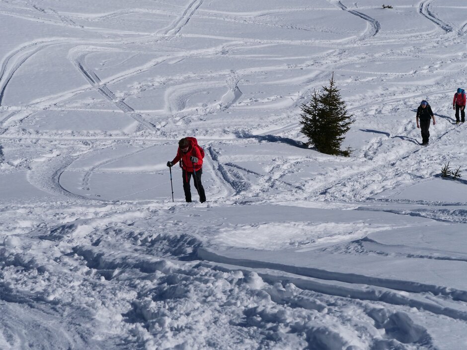 Man sollte bei den ersten Schneeschuhwanderungen nicht zu ambitioniert sein. Die Bewegungen und die angefragten Muskeln sind andere, das Atmen und der Rhythmus ist anders. Es ist einfach anstrengender! Deswegen sollte man sich keine Gedanken machen, wenn man am Anfang vielleicht nicht die längsten Touren durchhält. Eine längere Tour bedeutet ja nicht automatisch, dass diese auch schöner ist.