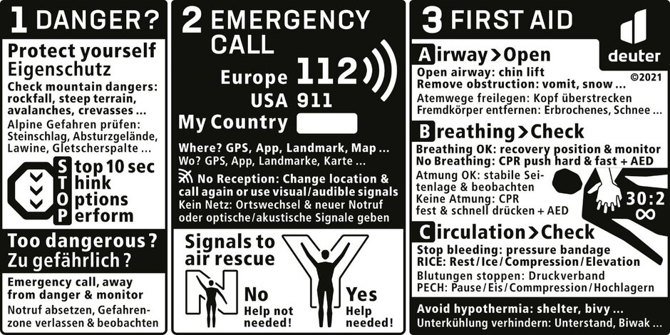 Um genau diese Fehlerquelle minimieren zu können, haben wir das SOS Label in all unseren deuter Rucksäcken neugestaltet. Es soll euch einen erprobten und realitäts-stabilen Handlungsleitfaden für Notfälle anbieten. Mit diesem kurzen Blogbeitrag wollen wir euch unser SOS Label und das dabei zugrunde liegende Prinzip detailliert darstellen.