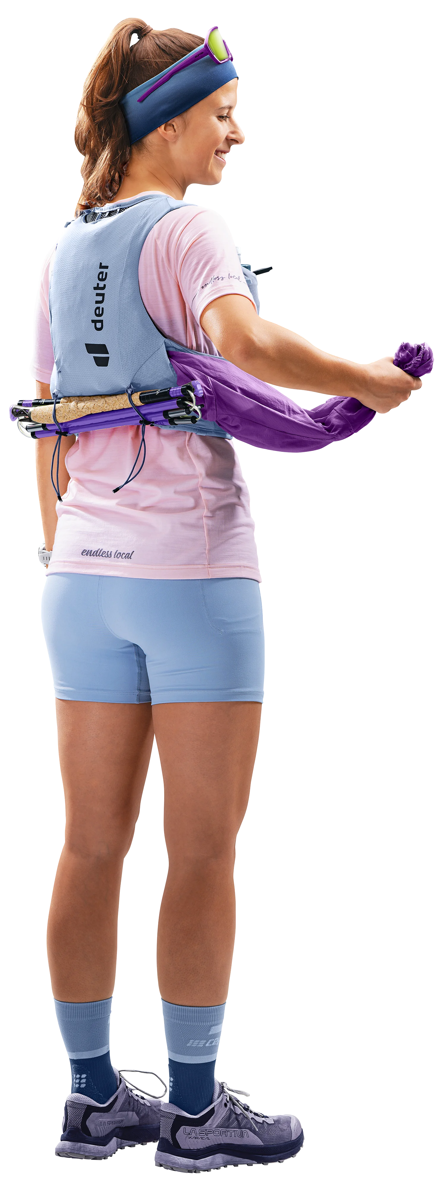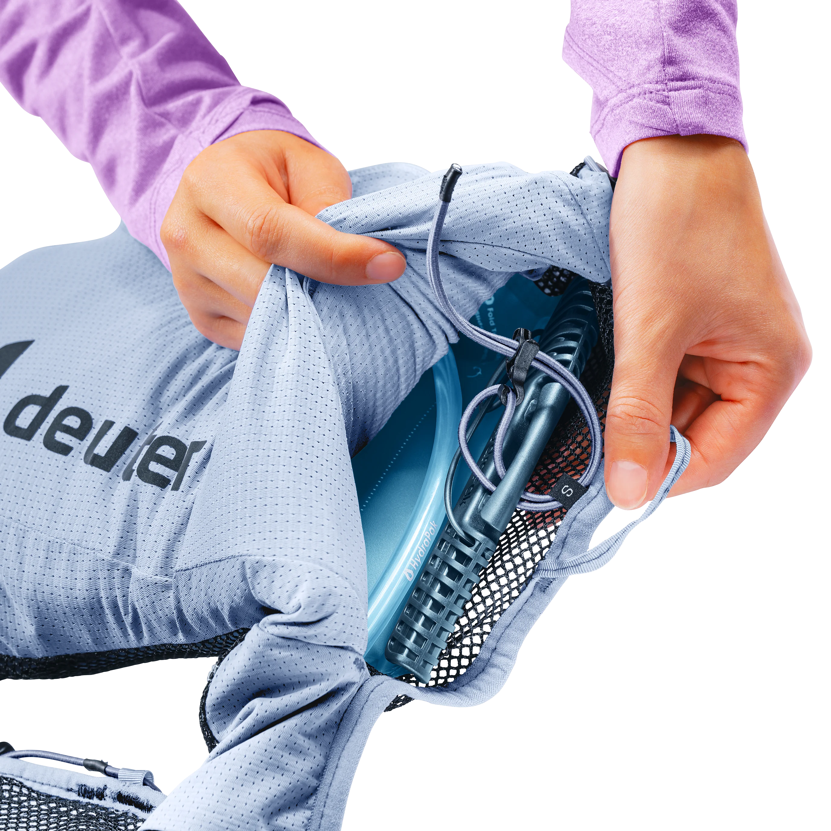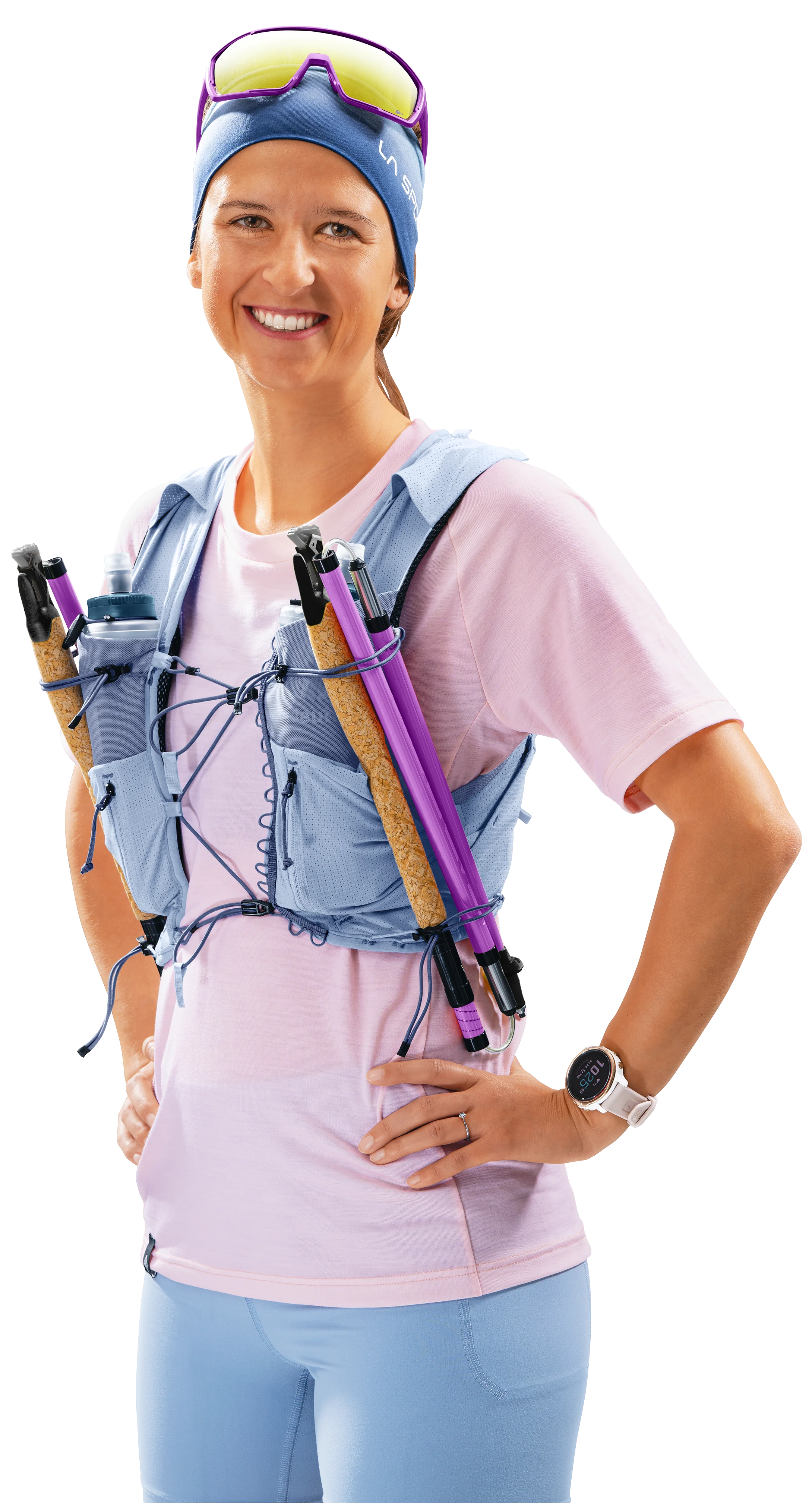 Die übersichtliche Einteilung der vier Taschen an jedem Schulterträger ermöglicht eine klare Orientierung und schnellen Zugriff auf Trinkflaschen, Müsliriegel, Handy und Co. Über die Steckfächer am Rücken sind sowohl die Trinkblase zum Auffüllen sofort zugänglich als auch eine Jacke schnell verstaubar. Im Hauptfach finden zusätzliche Verpfelgung und Kleidung ausreichend Platz. Die Stöcke sind dank vieler Befestigungsoptionen schnell verstaubar und griffbereit.