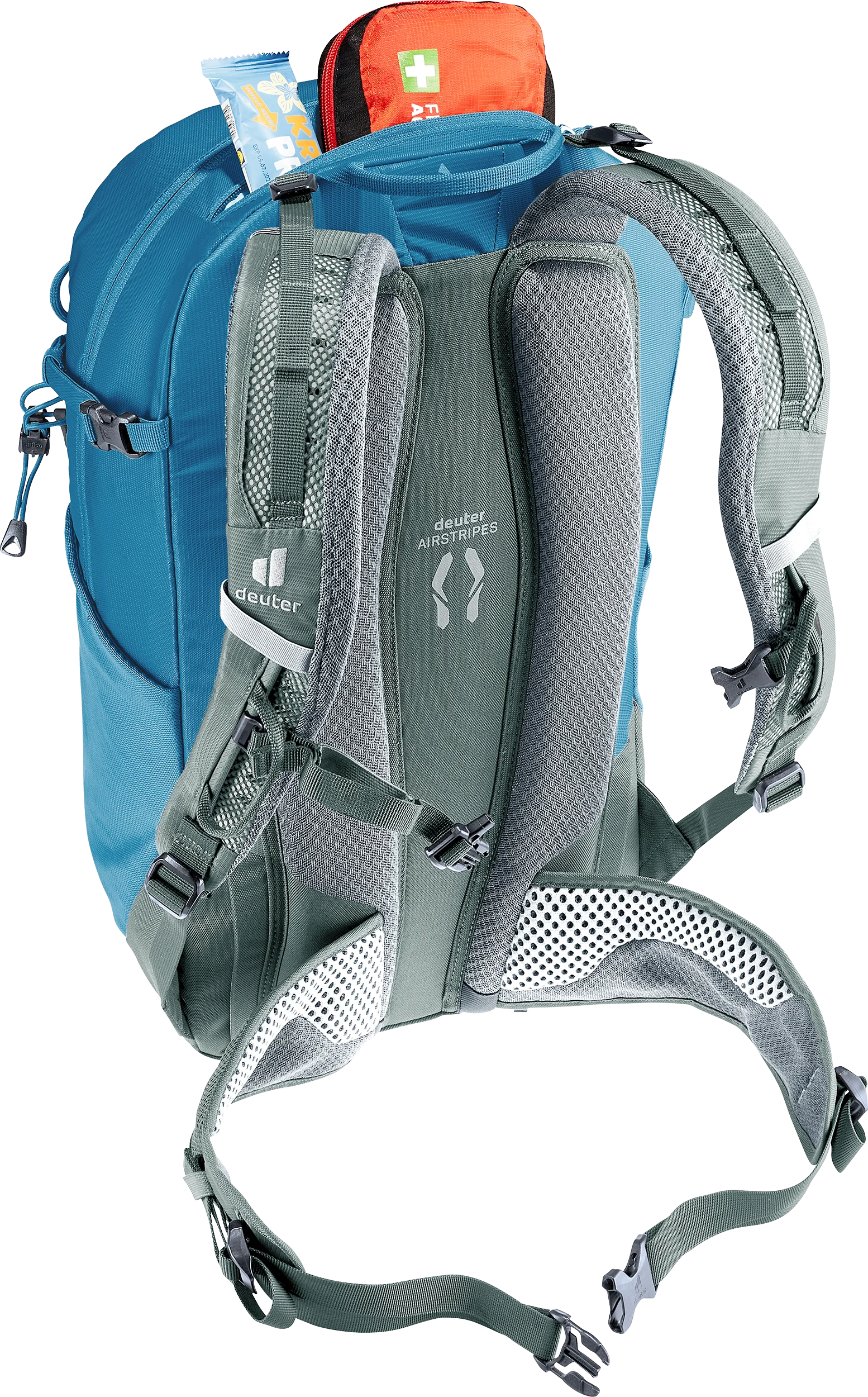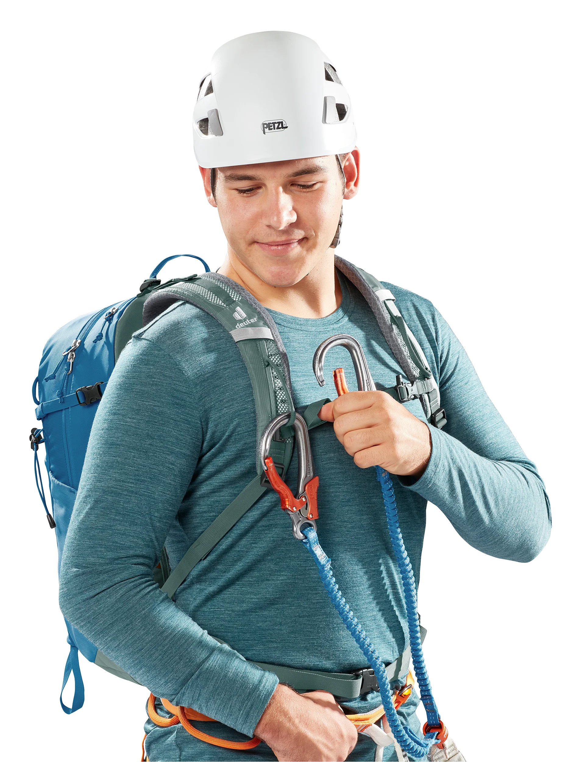 Das Airstripes Rückensystem mit geringer Rückenauflage und großen Belüftungskanälen sowie die perforierten Schulterträger und Hüftflossen sorgen für optimale Luftzirkulation, körpernahe Gewichtsverteilung und damit einen kompakten Sitz in jedem Terrain. Dank Fixierungen an den Schulterträgern sind die Karabiner des Klettersteigsets stets griffbereit. Zudem sind Ausrüstungsgegenstände und Material dank großer Rundbogenöffnung mit Reißverschluß, elastischer Frontstecktasche und Seitentaschen schnell zur Hand.
