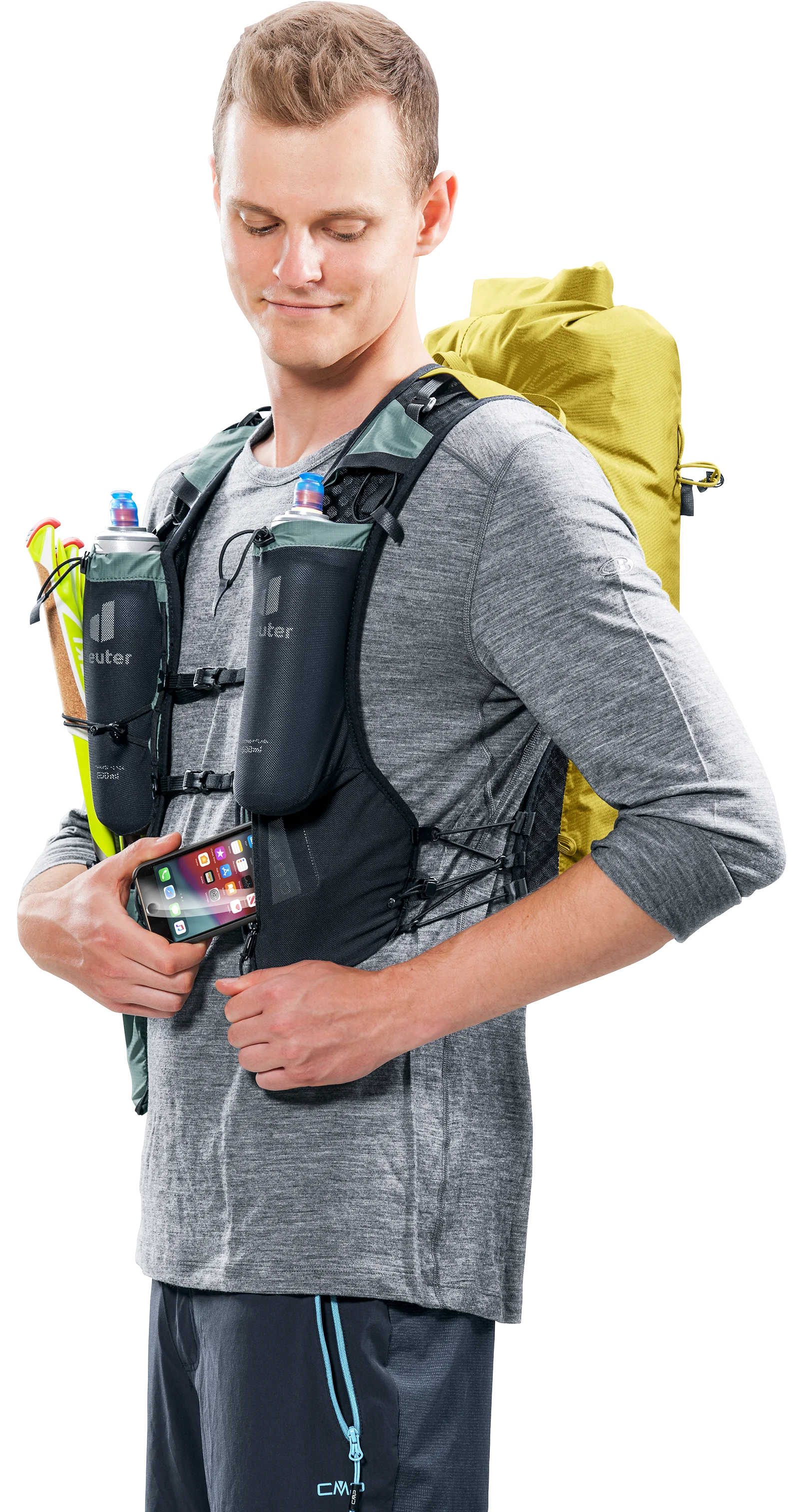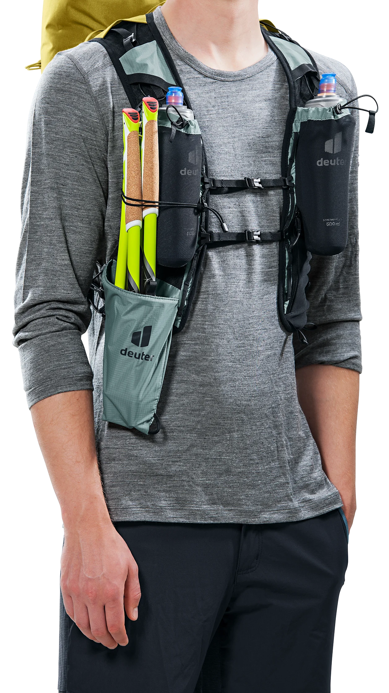Die breiten, westenförmigen Schulterträger und das weiche Rückenmaterial schmiegen sich an den Oberkörper an und sorgen so für einen festen, körpernahen Sitz und uneingeschränkte Bewegungsfreiheit. Dank des Westentragesystems ist das Notwendigste stets griffbereit.