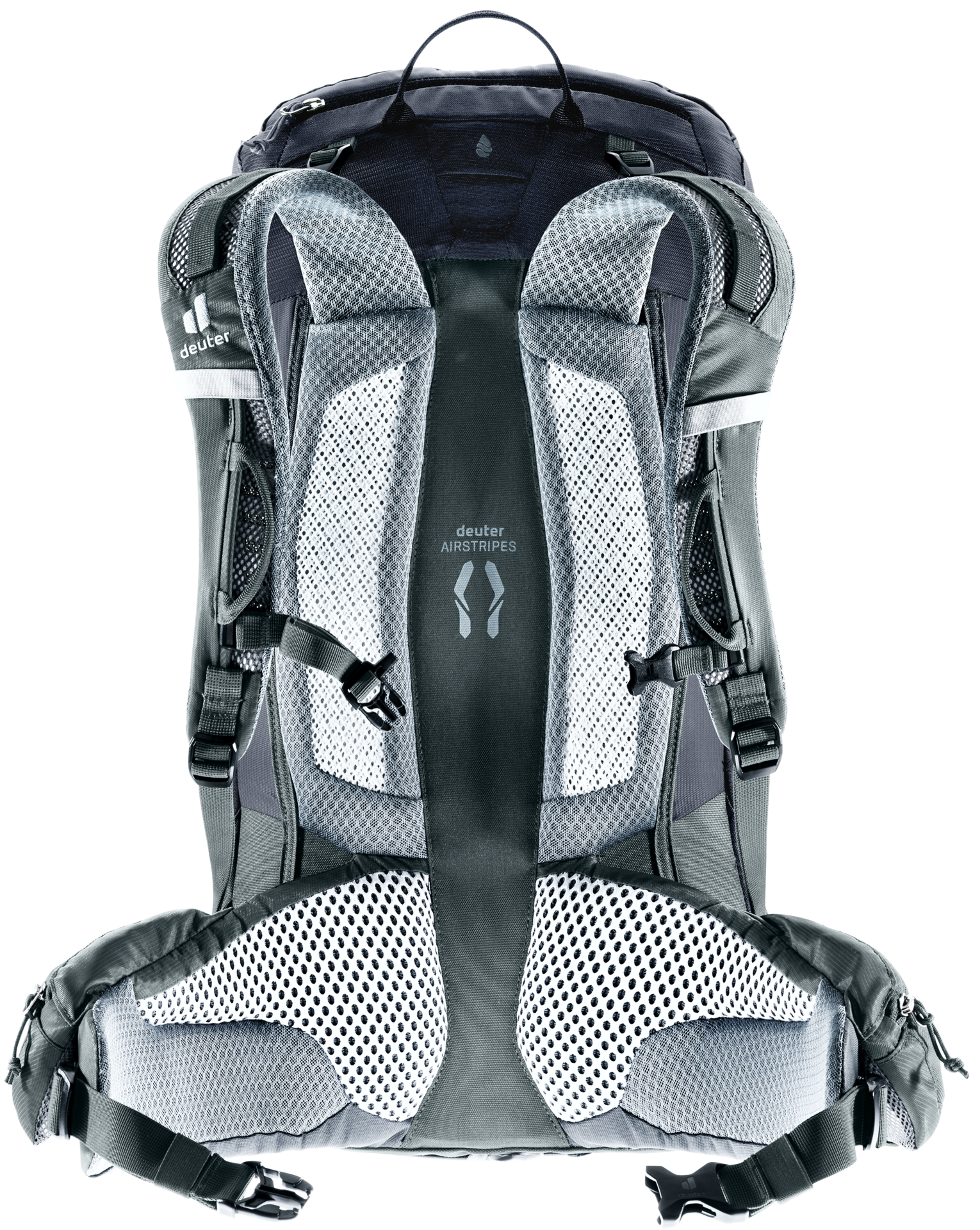 Das Airstripes Rückensystem mit geringer Auflagefläche und luftdurchlässigem, schnell trocknendem Air Spacer Mesh sorgt zusammen mit den perforierten Schulterträgern und Hüftflossen für maximale Belüftung, gute Lastverteilung und kompakten Sitz auf Mehrtagestouren mit Klettersteig. Dank Fixierungen an den Schulterträgern sind die Karabiner des Klettersteigsets stets griffbereit und das Material durch den großen Reißverschluss-Hauptfachzugang, die elastischen Seitentaschen und das separate Bodenfach gut sortiert und schnell verräumt.