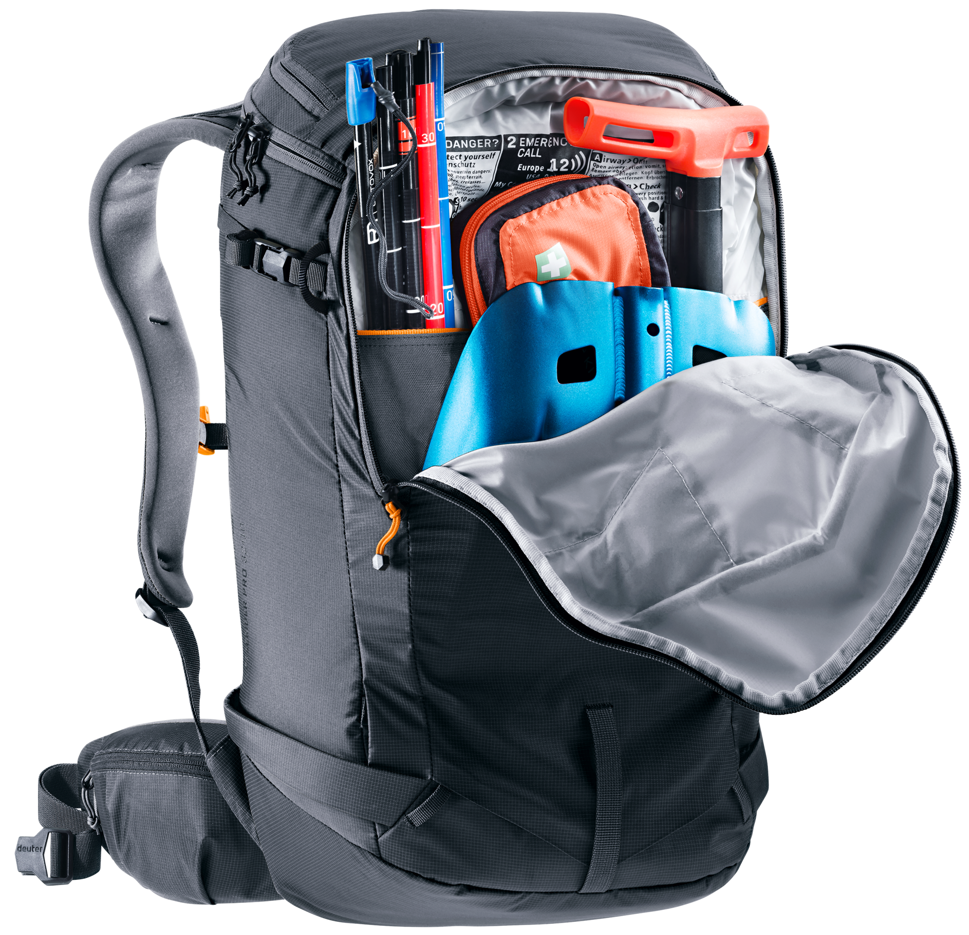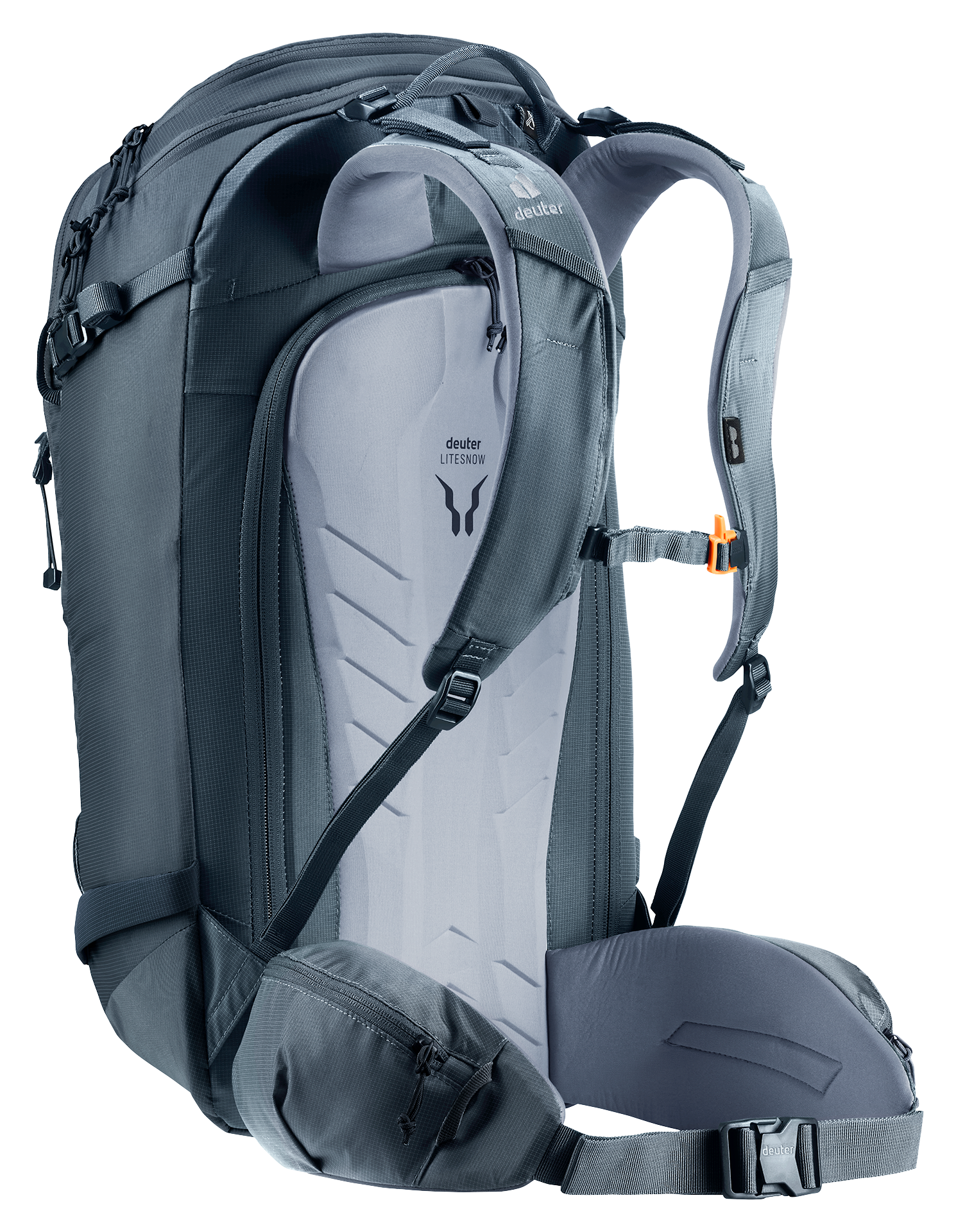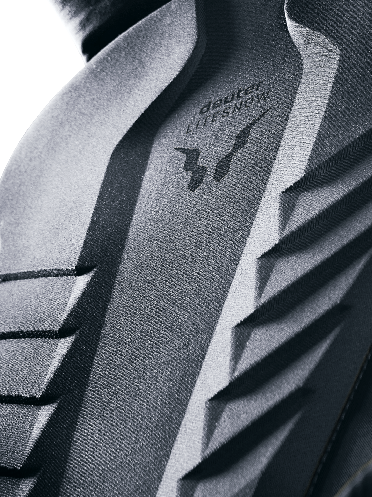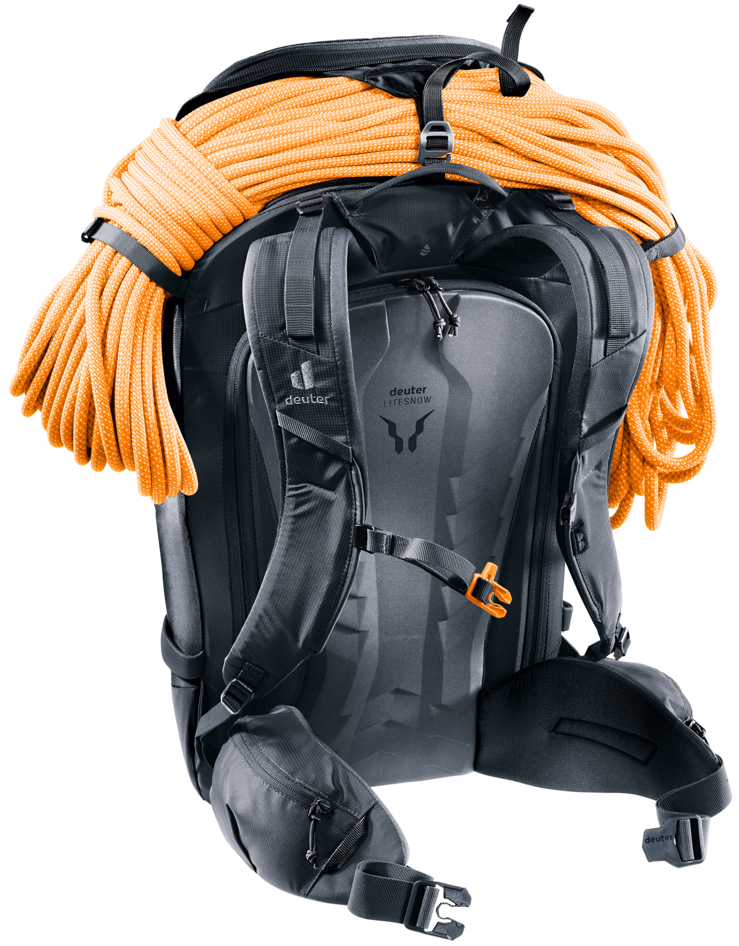Das LiteSnow-Rückensystem bietet hohen Komfort bei geringem Gewicht und verhindert dank innovativem Design und Material das Haften von Schnee und die Aufnahme von Feuchtigkeit. Dank Roll-Top kann das Volumen um 10 Liter erweitert werden. Verstaubare Riemen sorgen für sichere Fixierung von Seil, Skiern oder Snowboard. Und auch Pickel und Stöcke können fix auf der Rucksackfront befestigt werden. Die große Rückenöffnung ermöglicht einen schnellen Zugriff auf das Hauptfach. Ein spezielles Fach für Lawinensicherheitsausrüstung gewährleistet einen schnellen Zugriff im Notfall.