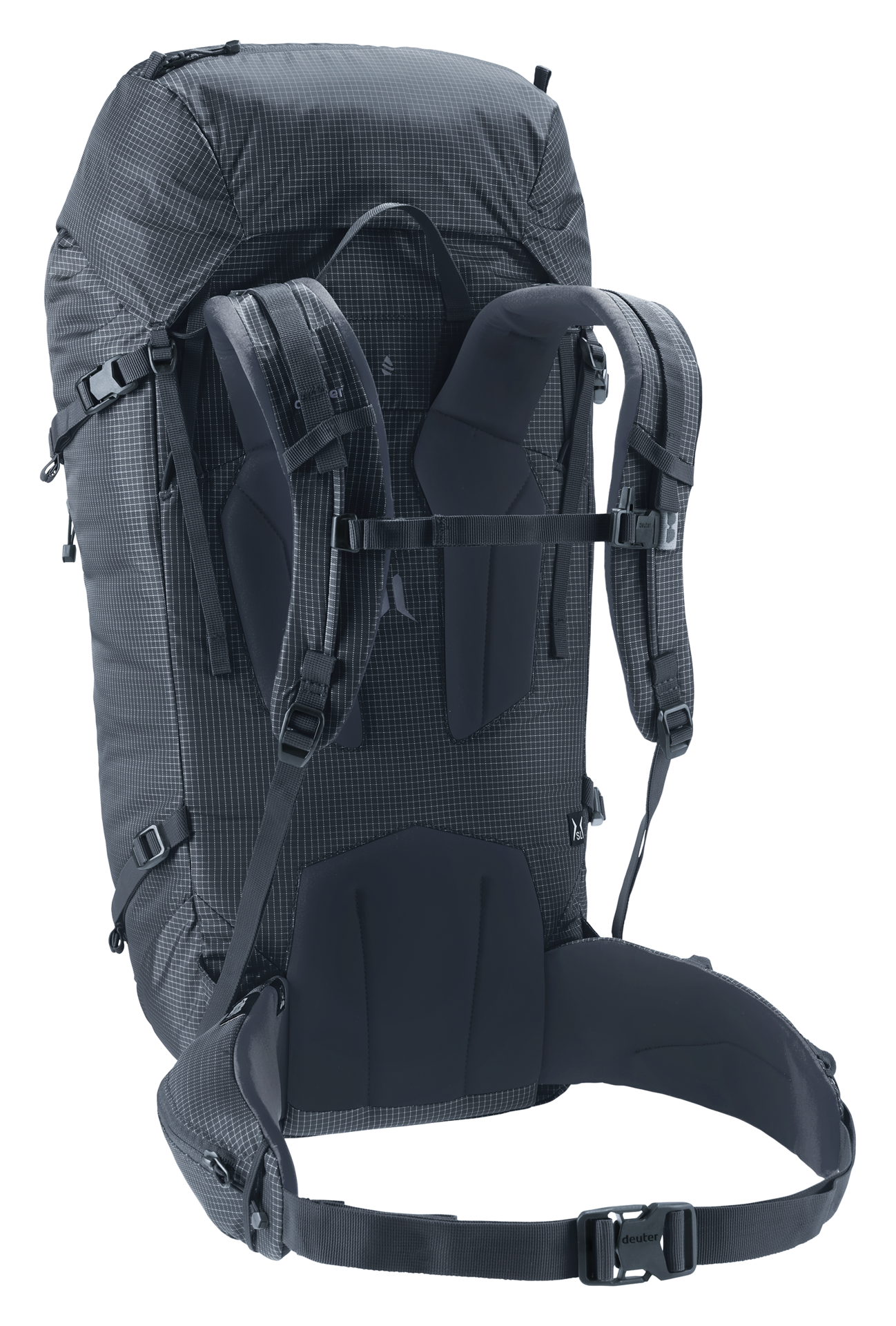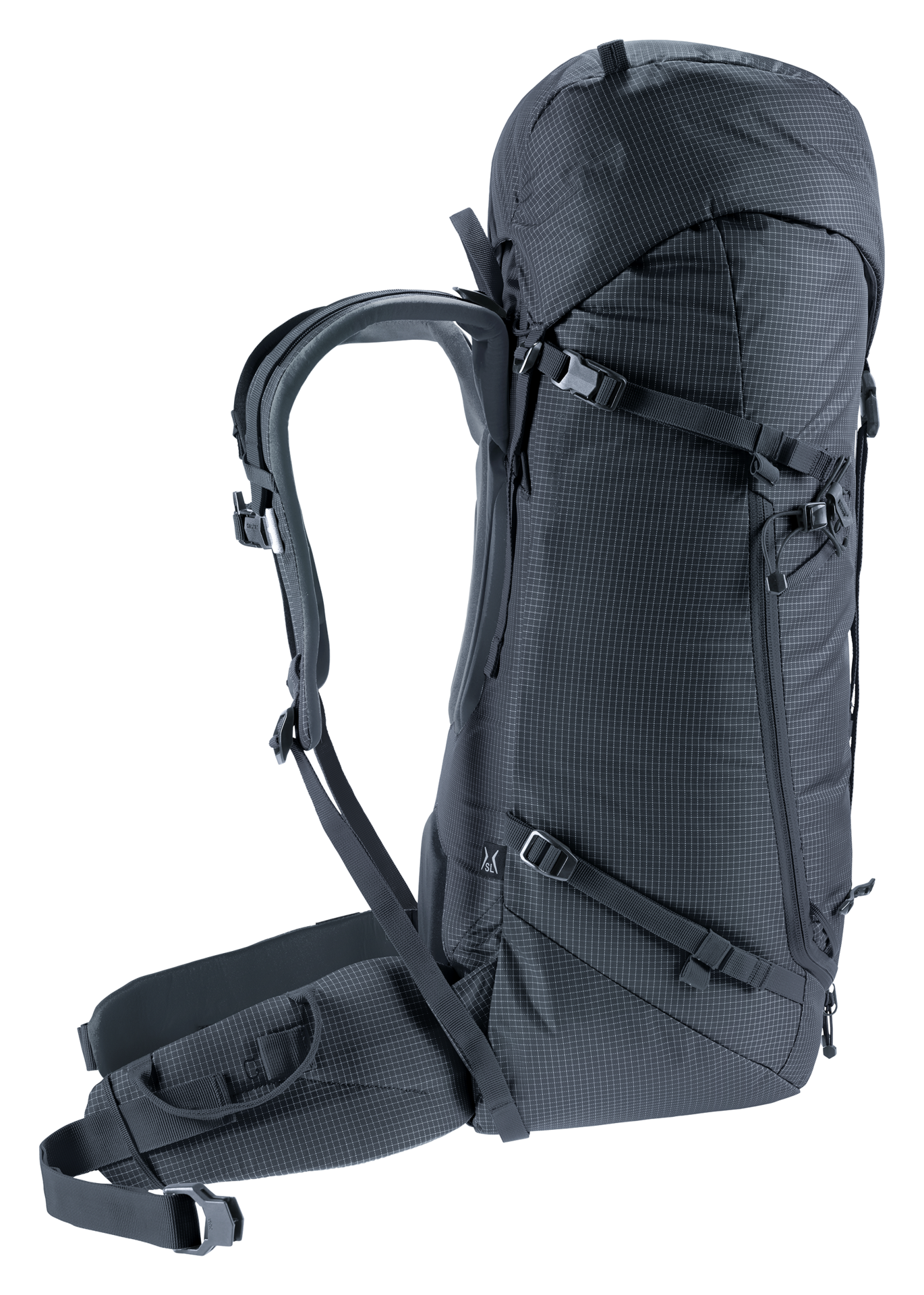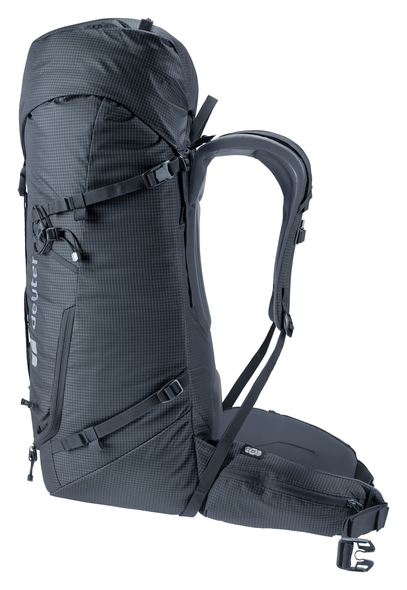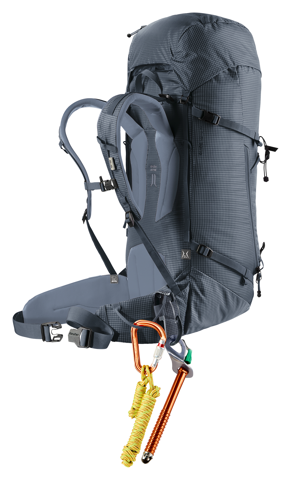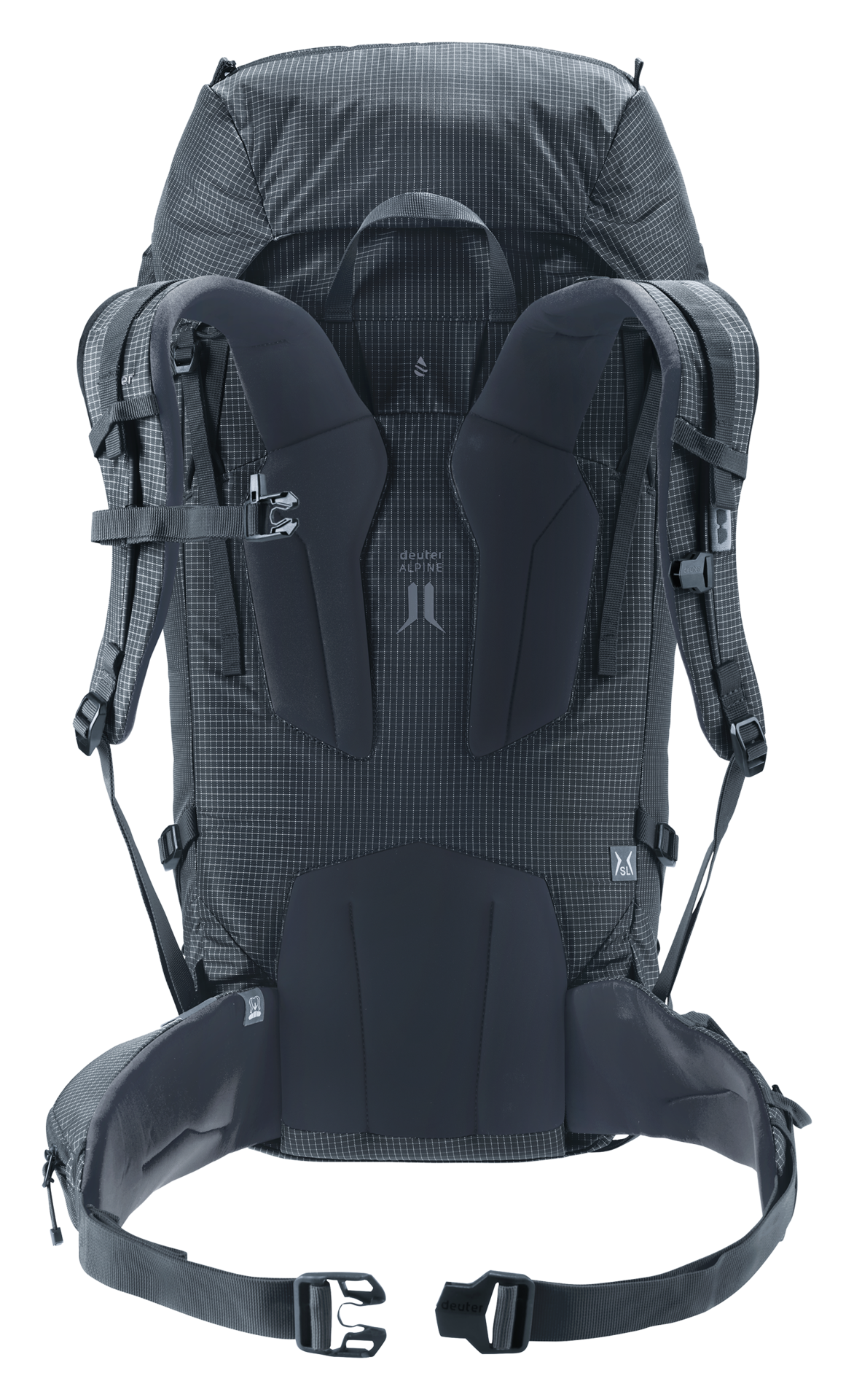 Mit alpinistischer Ausstattung und robusten Materialien bietet der Rucksack alles, was Alpinist*innen benötigen. Abnehmbare Hüftflossen und Deckelkonstruktion, Material- und Befestigungsschlaufen, beidseitige Pickelhalterung, seitliche Ski-Fixierung, Seilfixierung, Helmnetz und eine Volumenerweiterung bieten große Vielseitigkeit. Das Alpine-Rückensystem mit ergonomischer PE-Rückenplatte und Federstahlrahmen garantiert Stabilität, gute Belüftung und hohen Tragekomfort, selbst bei schwerer Beladung. Das Hauptmaterial aus 100 % recyceltem Ripstop-Gewebe schützt zuverlässig vor Nässe, Staub und Fels.