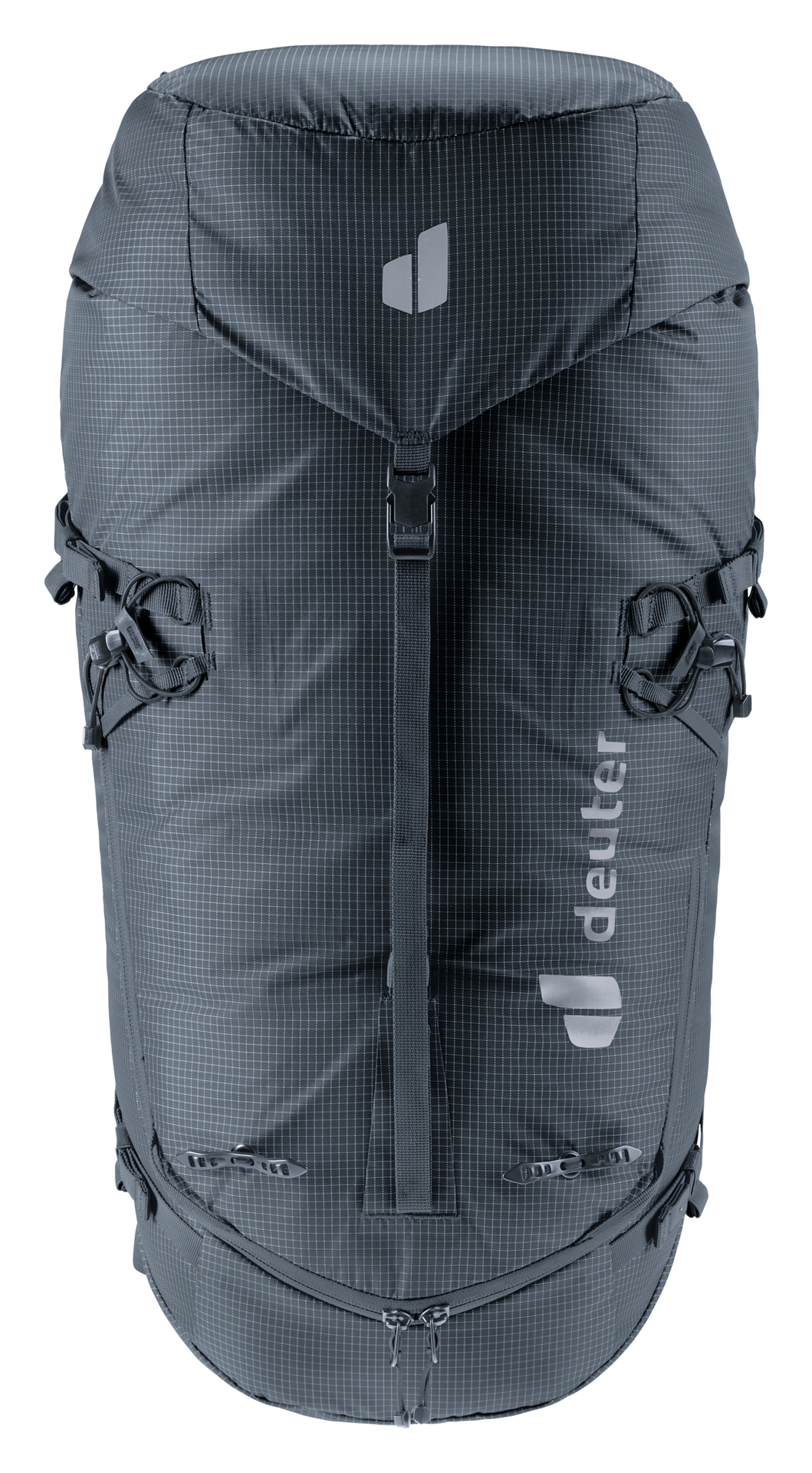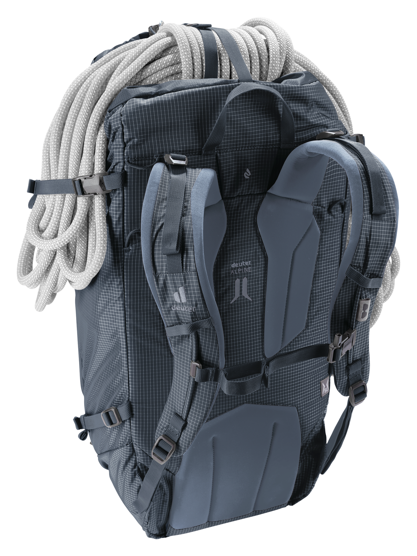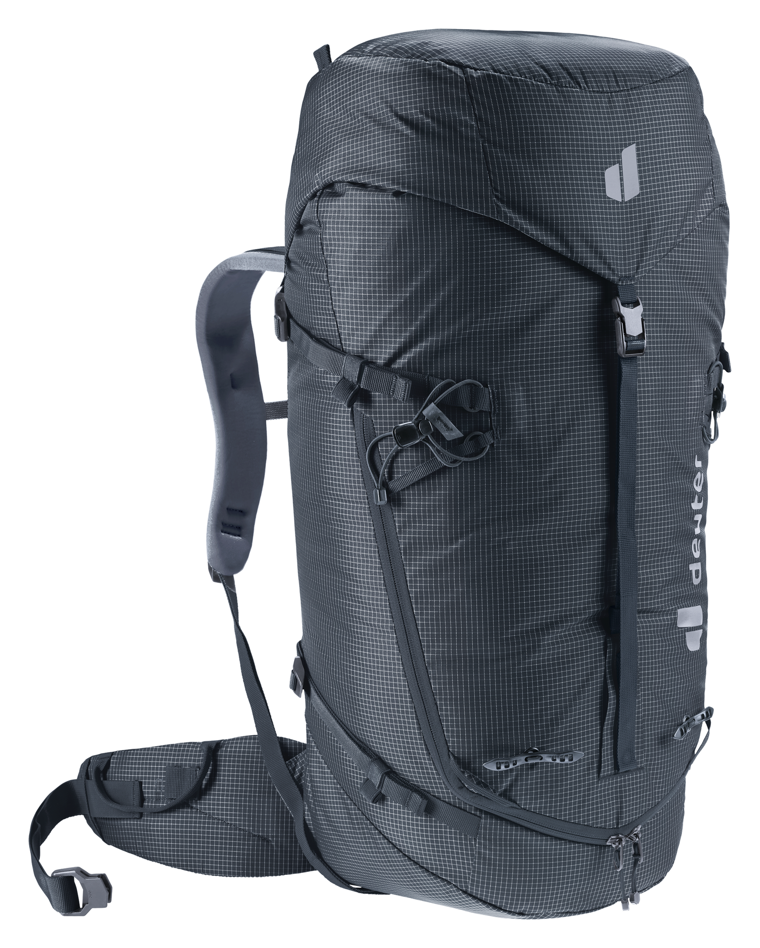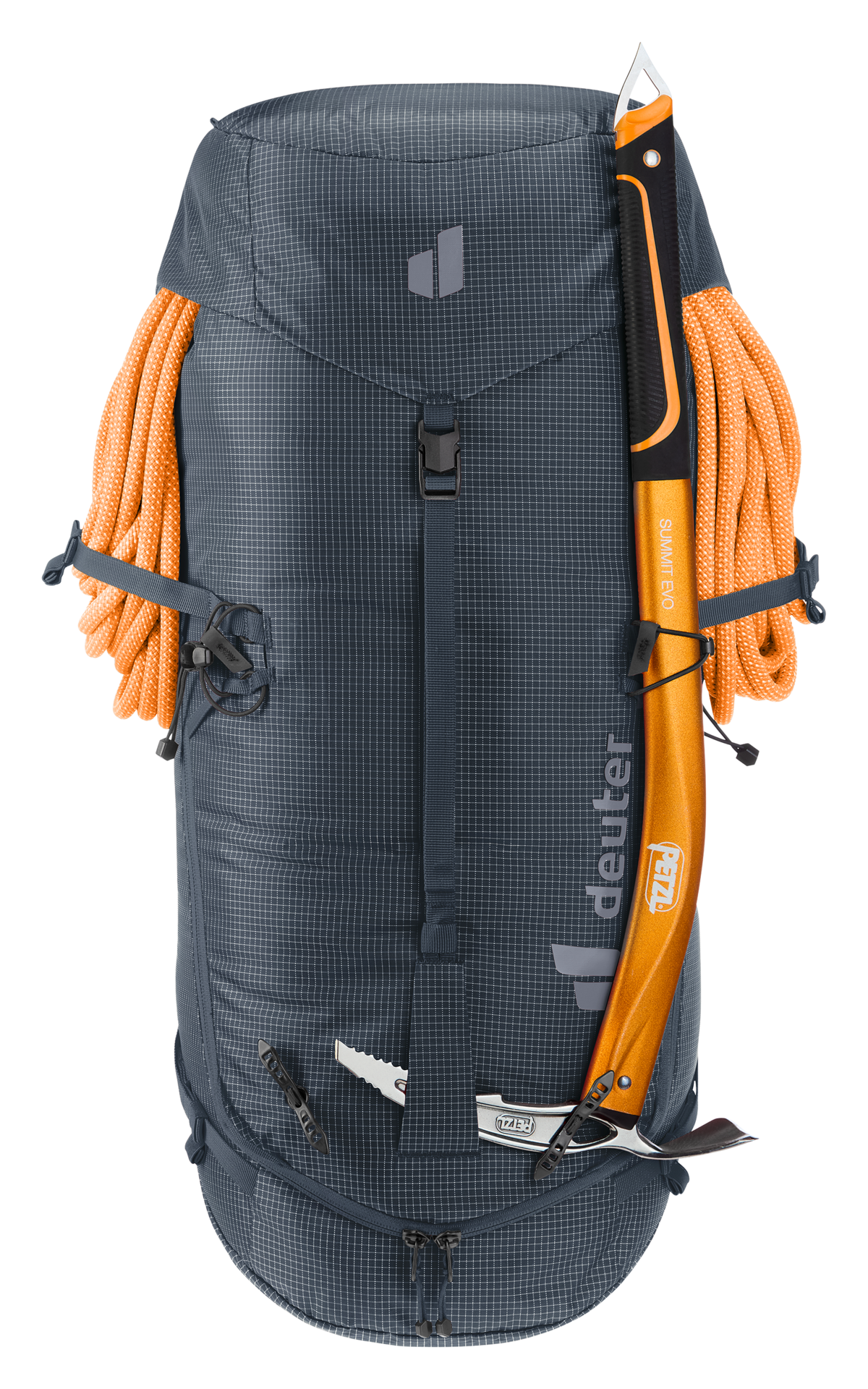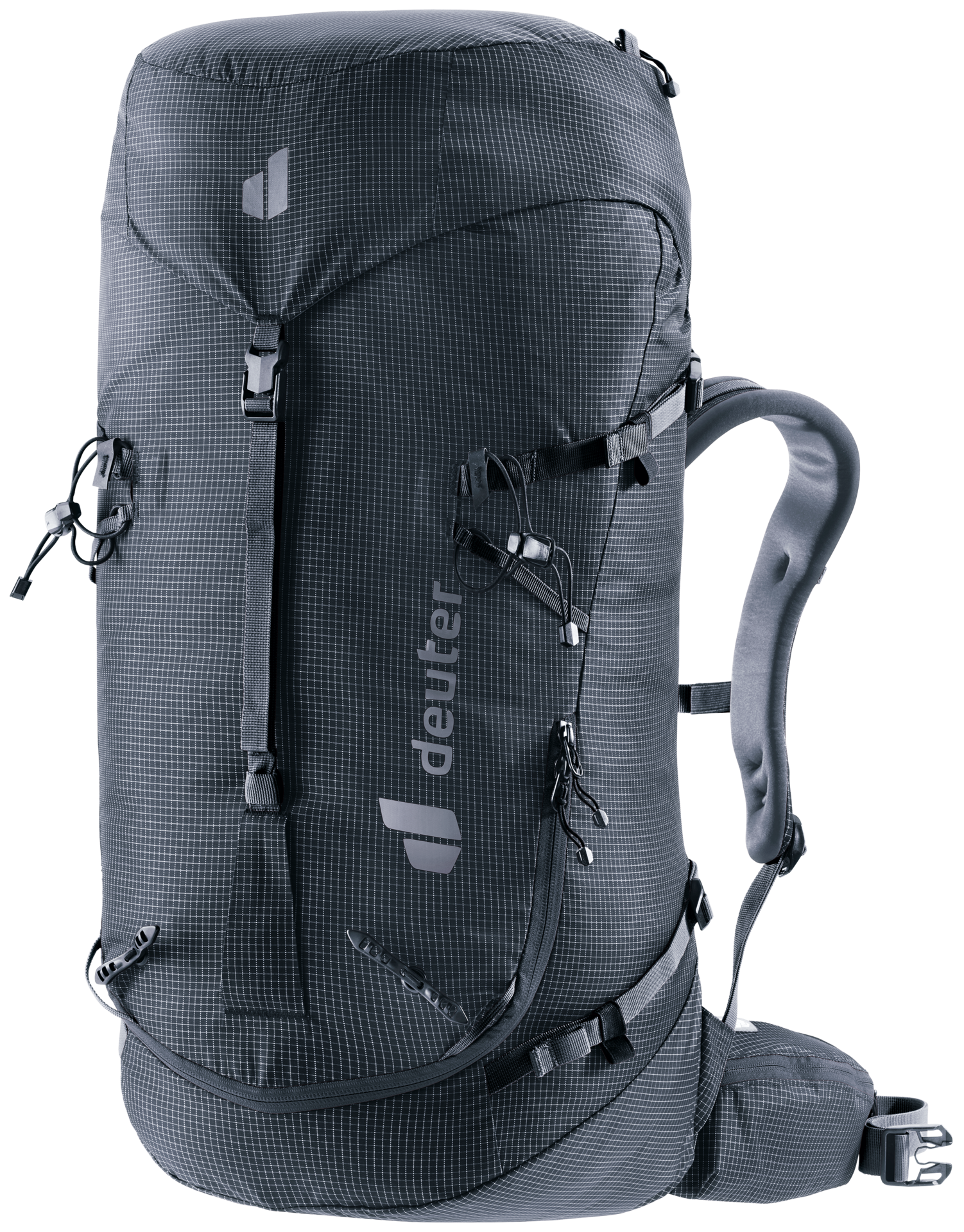 Mit alpinistischer Ausstattung und robusten Materialien bietet der Rucksack alles, was Alpinist*innen benötigen. Abnehmbare Hüftflossen und Deckelkonstruktion, Material- und Befestigungsschlaufen, beidseitige Pickelhalterung, seitliche Ski-Fixierung, Seilfixierung, Helmnetz und eine Volumenerweiterung bieten große Vielseitigkeit. Das Alpine-Rückensystem mit ergonomischer PE-Rückenplatte und Federstahlrahmen garantiert Stabilität, gute Belüftung und hohen Tragekomfort, selbst bei schwerer Beladung. Das Hauptmaterial aus 100 % recyceltem Ripstop-Gewebe schützt zuverlässig vor Nässe, Staub und Fels.