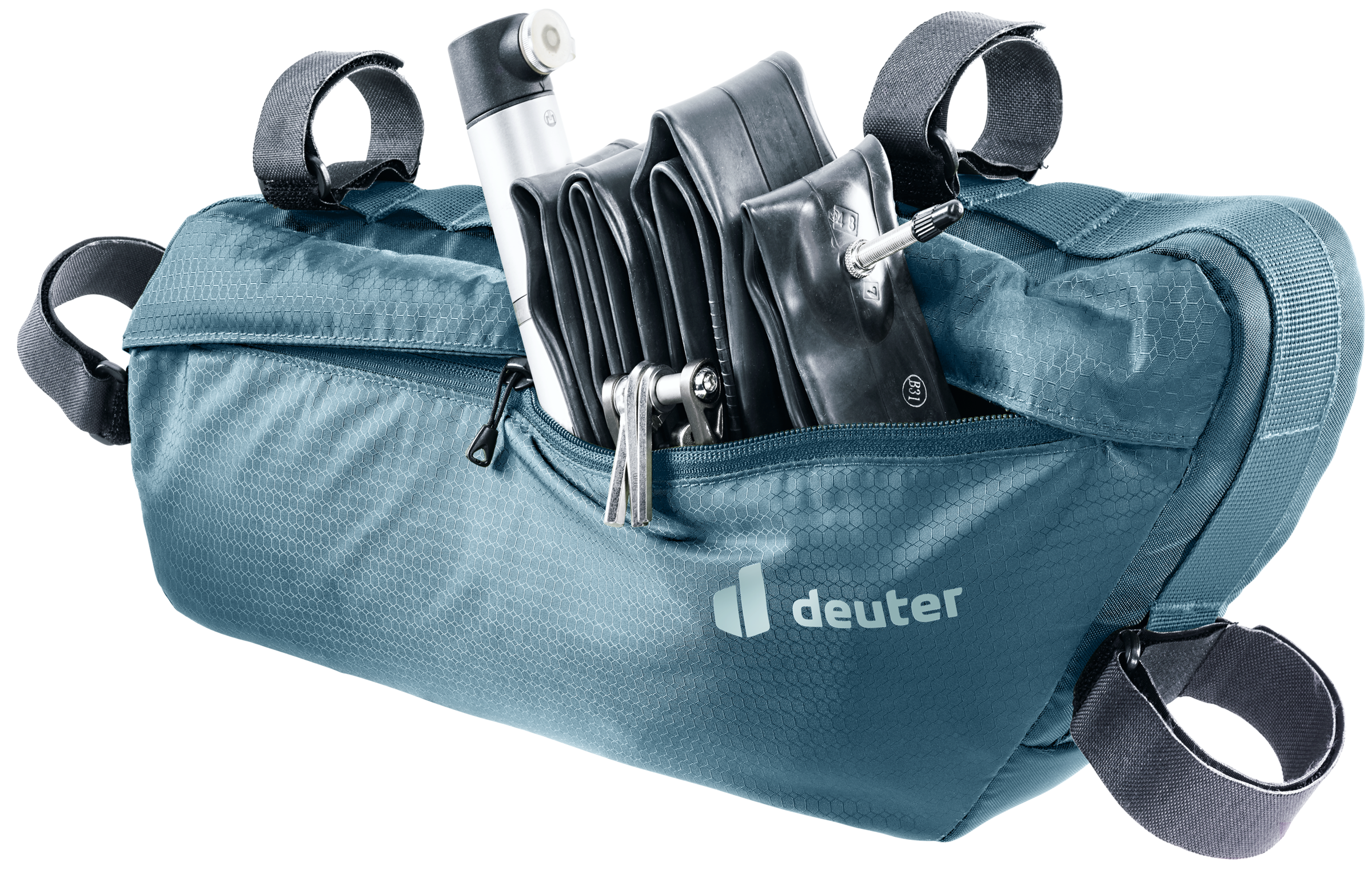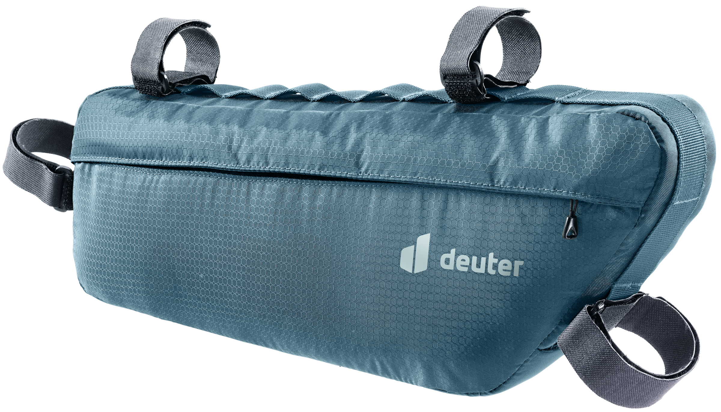 Leichte Rahmentasche für Bikepacking-Einsteiger*innen aus strapazierfähigem, recycelten und bluesign® zertifizierten Material mit reflektierenden Elementen und Materialschlaufen, Reißverschlusszugang zum geräumigen Hauptfach und kleineren Seitenfach. Die vier Doppelklettverschlüsse zur sicheren Fixierung können an unterschiedlichste Rahmengrößen und Rohrdurchmesser angepasst werden.