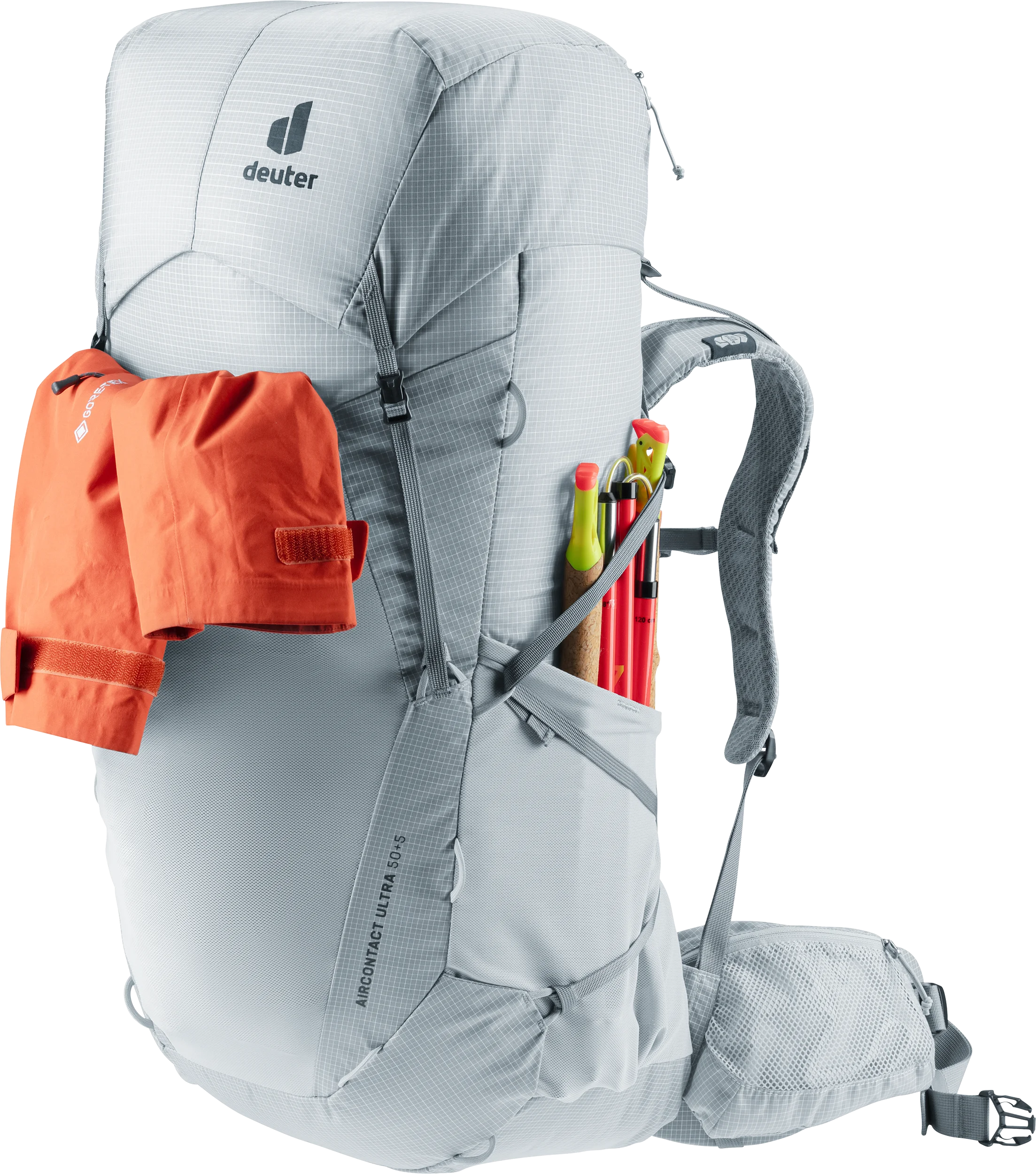 This lightweight backpack benefits from an outstanding comfort-to-weight ratio (with a removable lid and compression straps when every gram counts). The deuter Aircontact back system equally keeps the weight down, but above all creates ventilation across the back. The length of the back is adjusted via Clip & Loop system and ergonomic hip fins create a snug, comfortable fit while distributing the load effectively. The hard-wearing ripstop body fabric made from performance fibers is also built to withstand the rigors of thru-hiking.