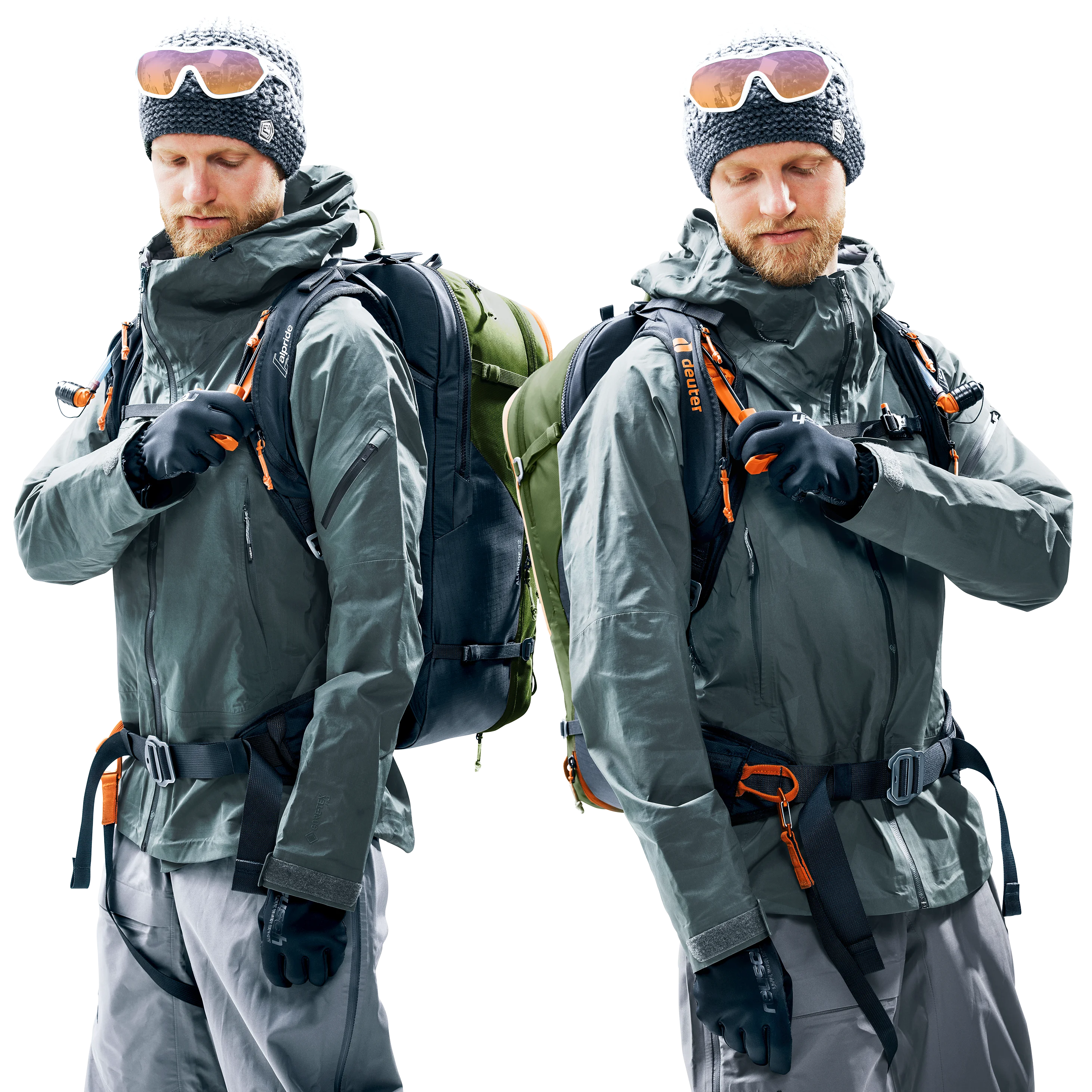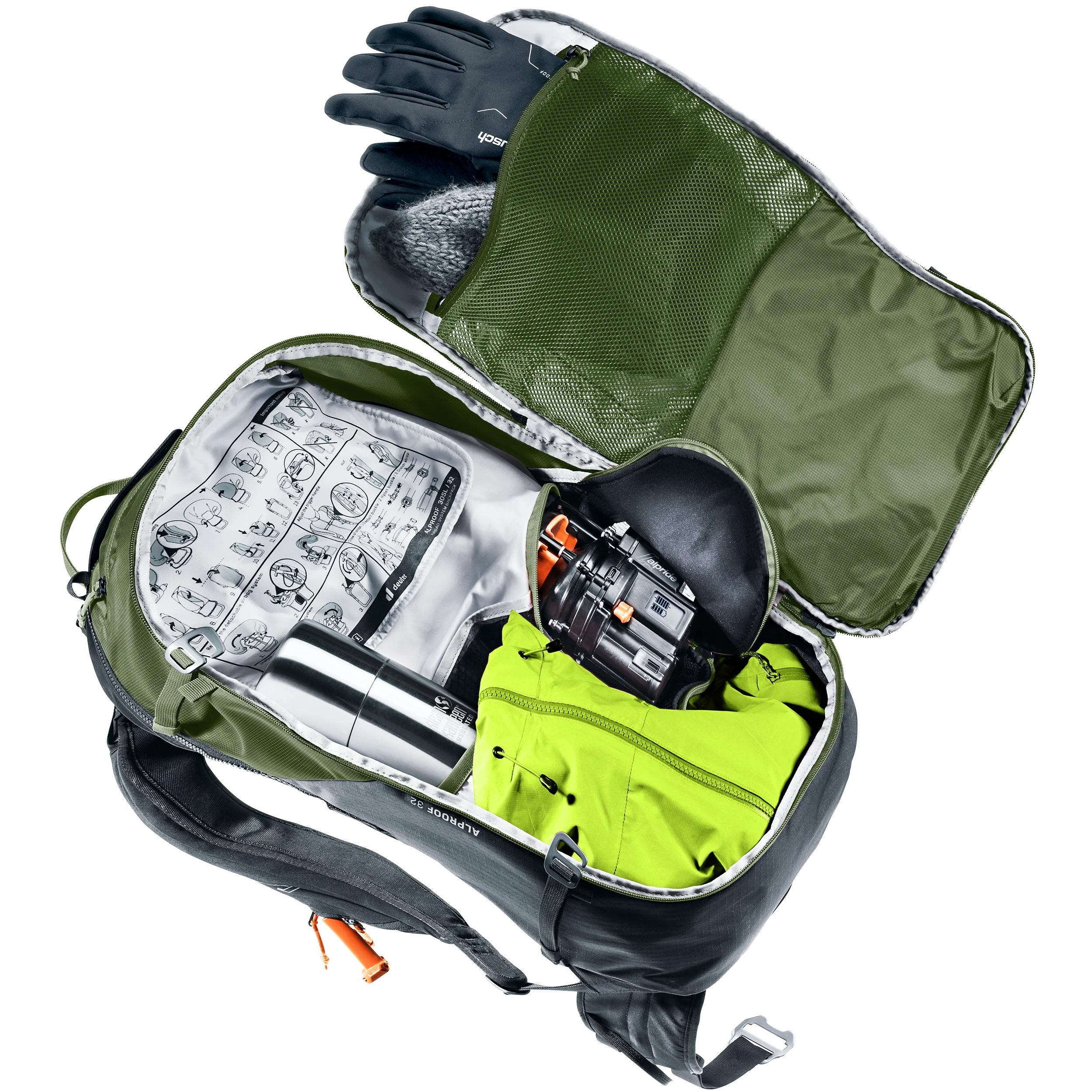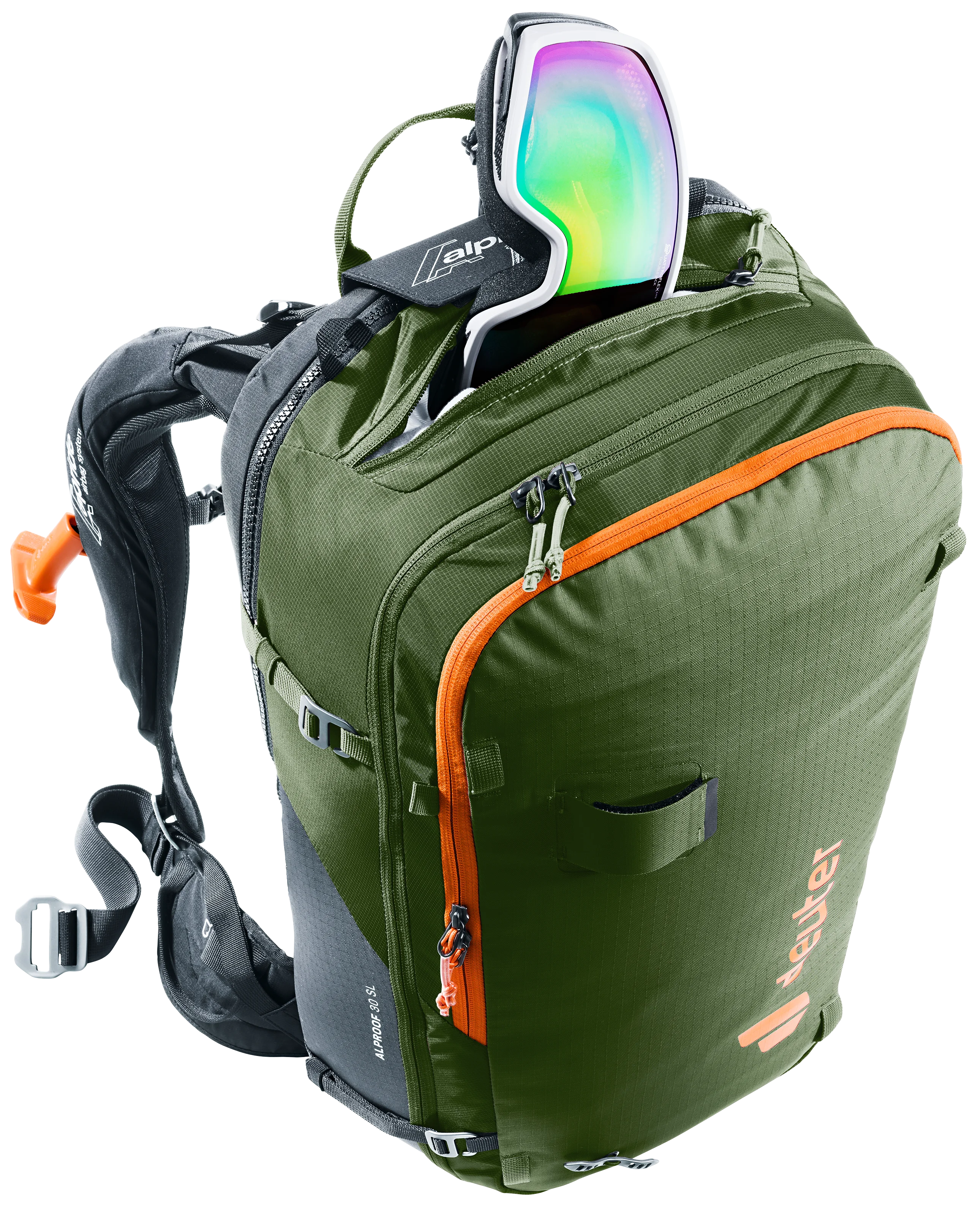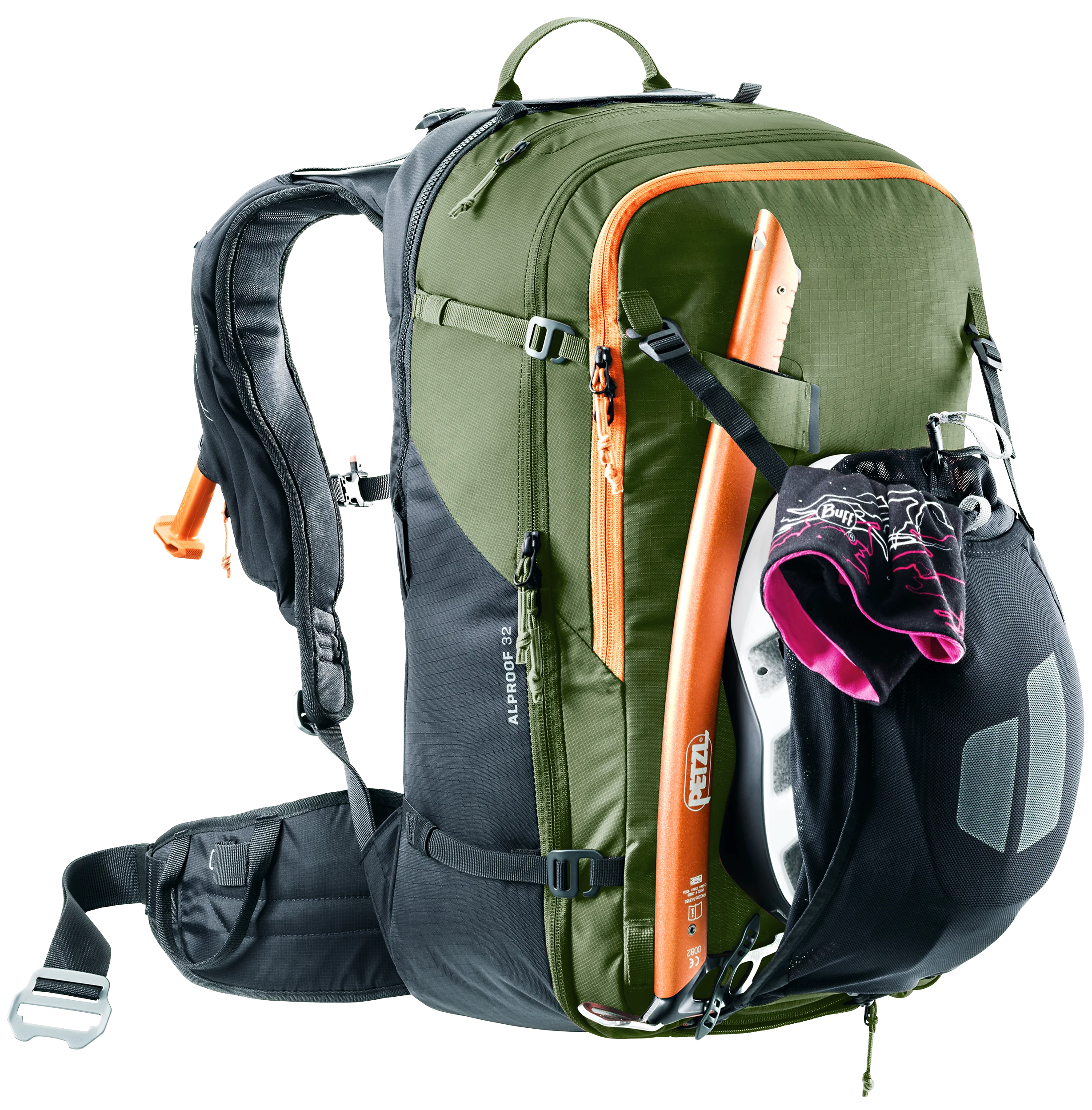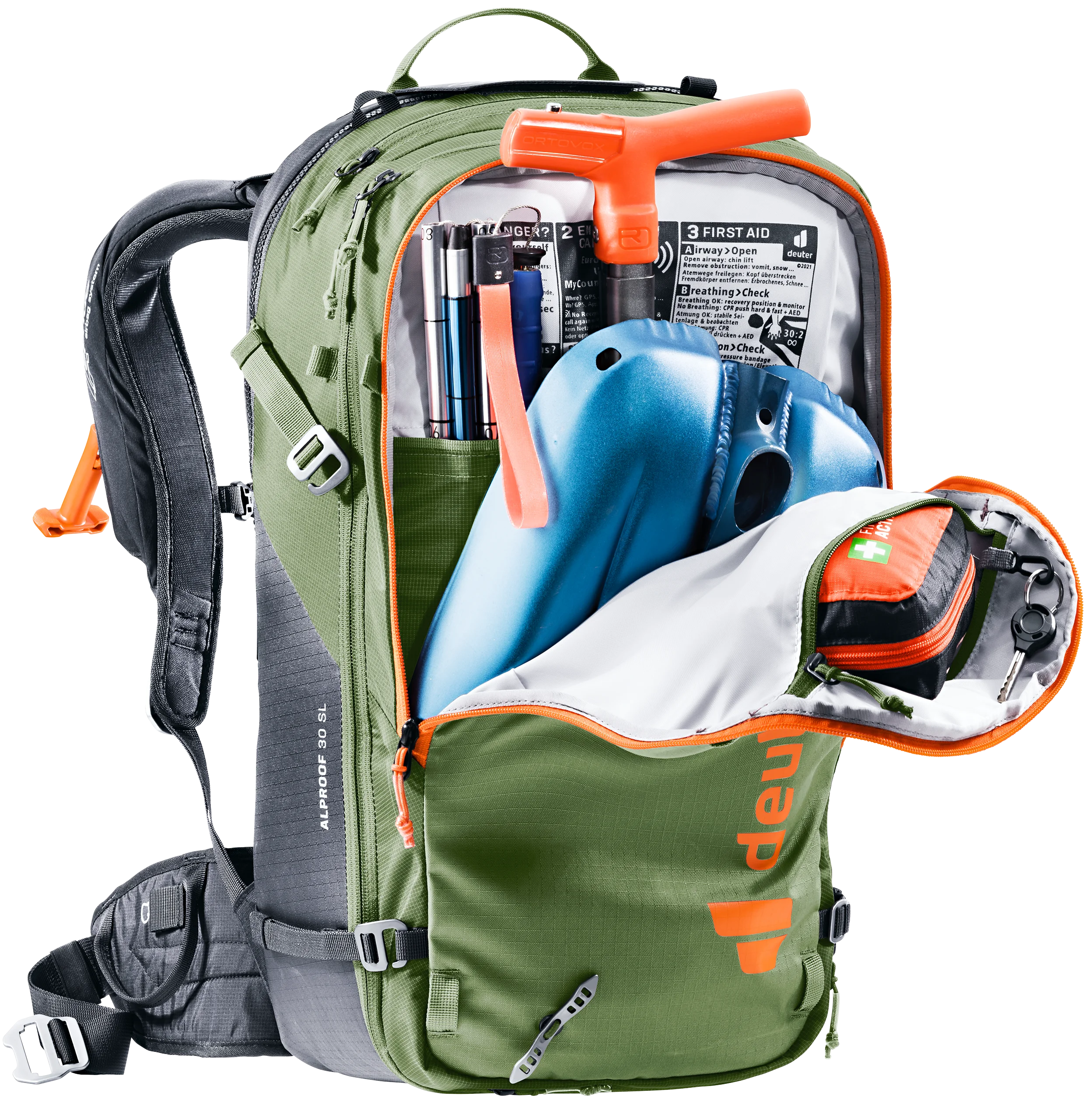 Gracias al airbag de avalancha Alpride E2 y a la última tecnología de supercondensadores, el Alproof permite un despliegue rápido, potente y fiable incluso a bajas temperaturas. La facilidad de manejo, el desbloqueo múltiple y el compartimento de seguridad de rápido acceso se unen a la gran comodidad de uso y al ajuste ceñido para una acción controlada en terrenos técnicos. Un lazo en la pierna evita el deslizamiento en caso de enterramiento, la bolsa para el casco, los lazos para el equipo y las correas de sujeción también permiten utilizar la mochila con airbag para avalanchas con certificación TÜV en condiciones de alta montaña.