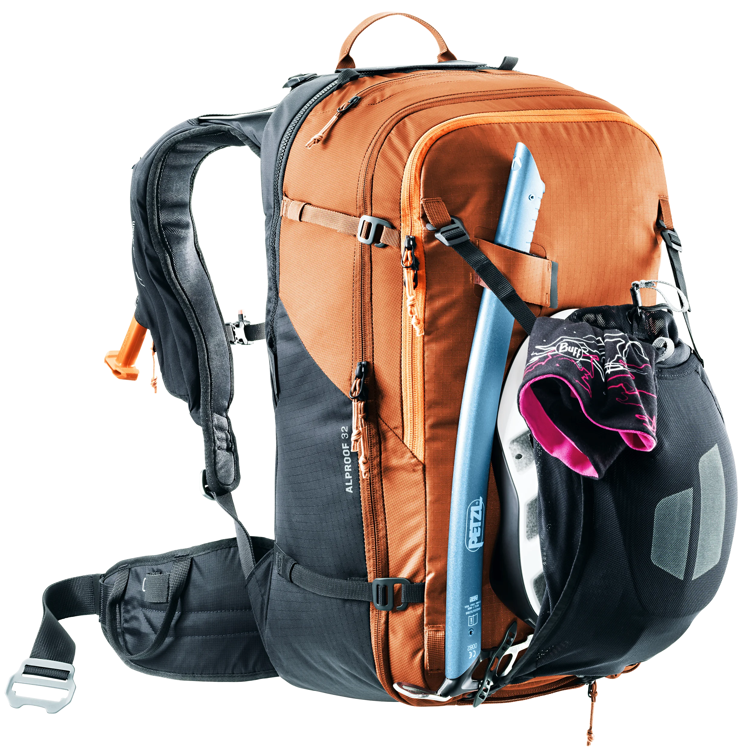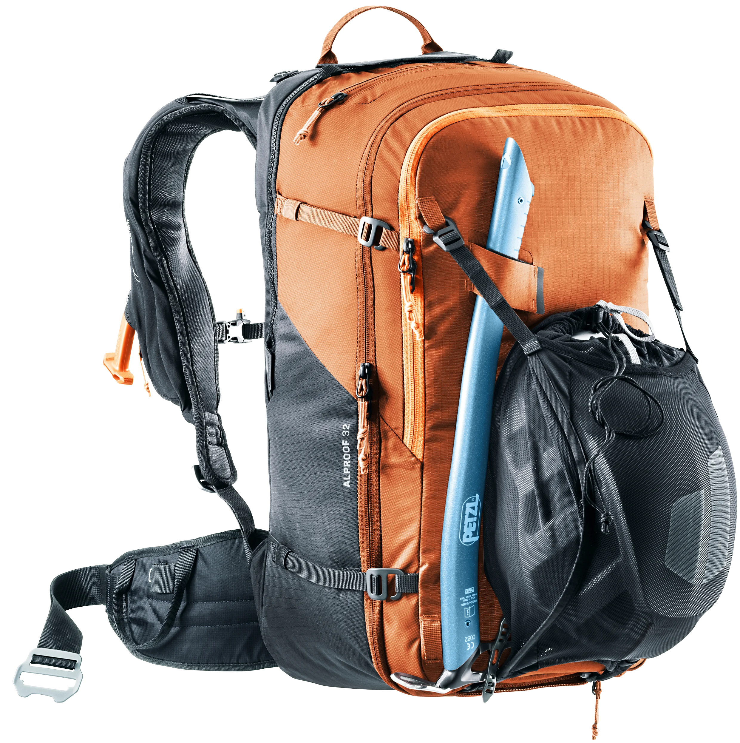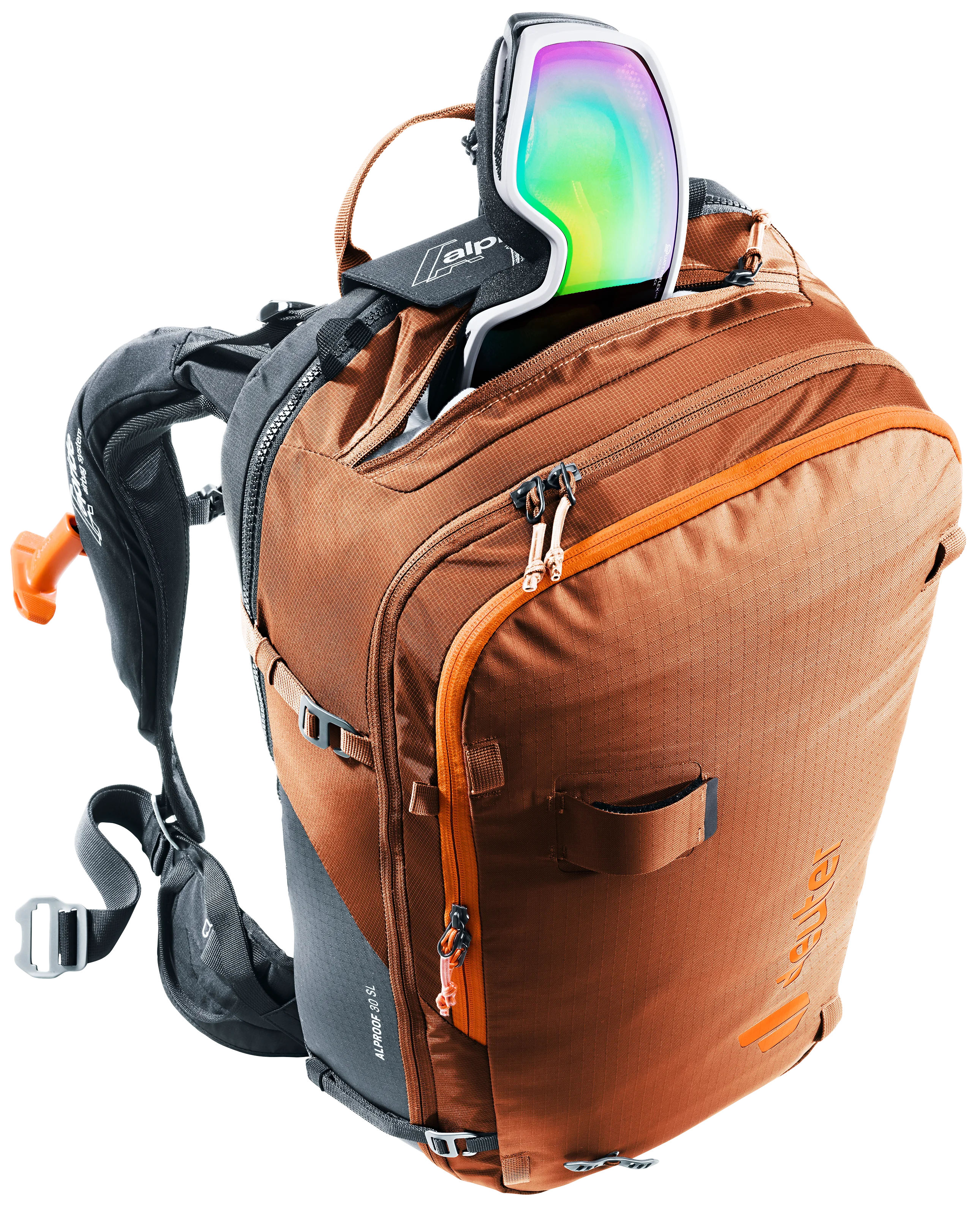 Gracias al airbag de avalancha Alpride E2 y a la última tecnología de supercondensadores, el Alproof permite un despliegue rápido, potente y fiable incluso a bajas temperaturas. La facilidad de manejo, el desbloqueo múltiple y el compartimento de seguridad de rápido acceso se unen a la gran comodidad de uso y al ajuste ceñido para una acción controlada en terrenos técnicos. Un lazo en la pierna evita el deslizamiento en caso de enterramiento, la bolsa para el casco, los lazos para el equipo y las correas de sujeción también permiten utilizar la mochila con airbag para avalanchas con certificación TÜV en condiciones de alta montaña.