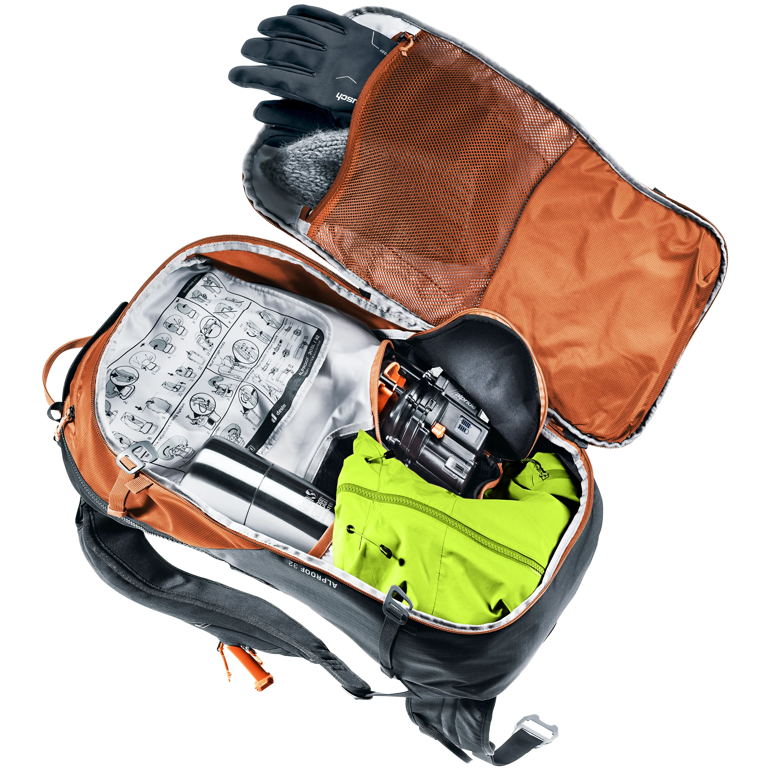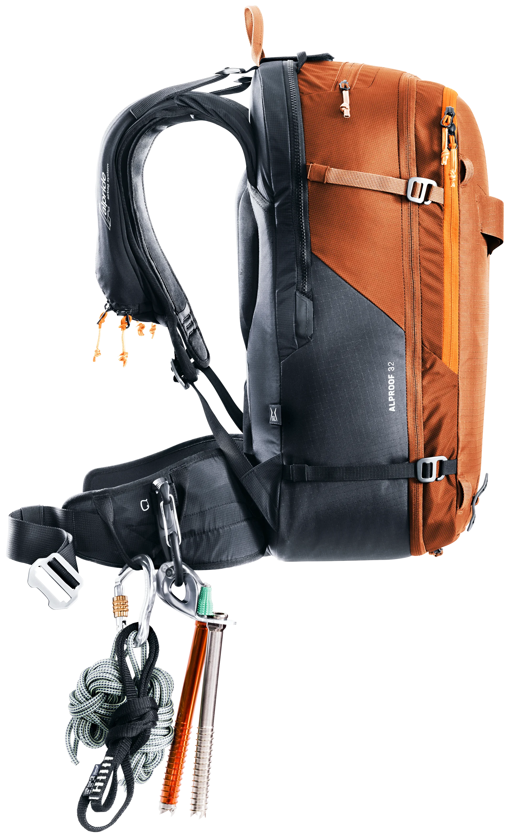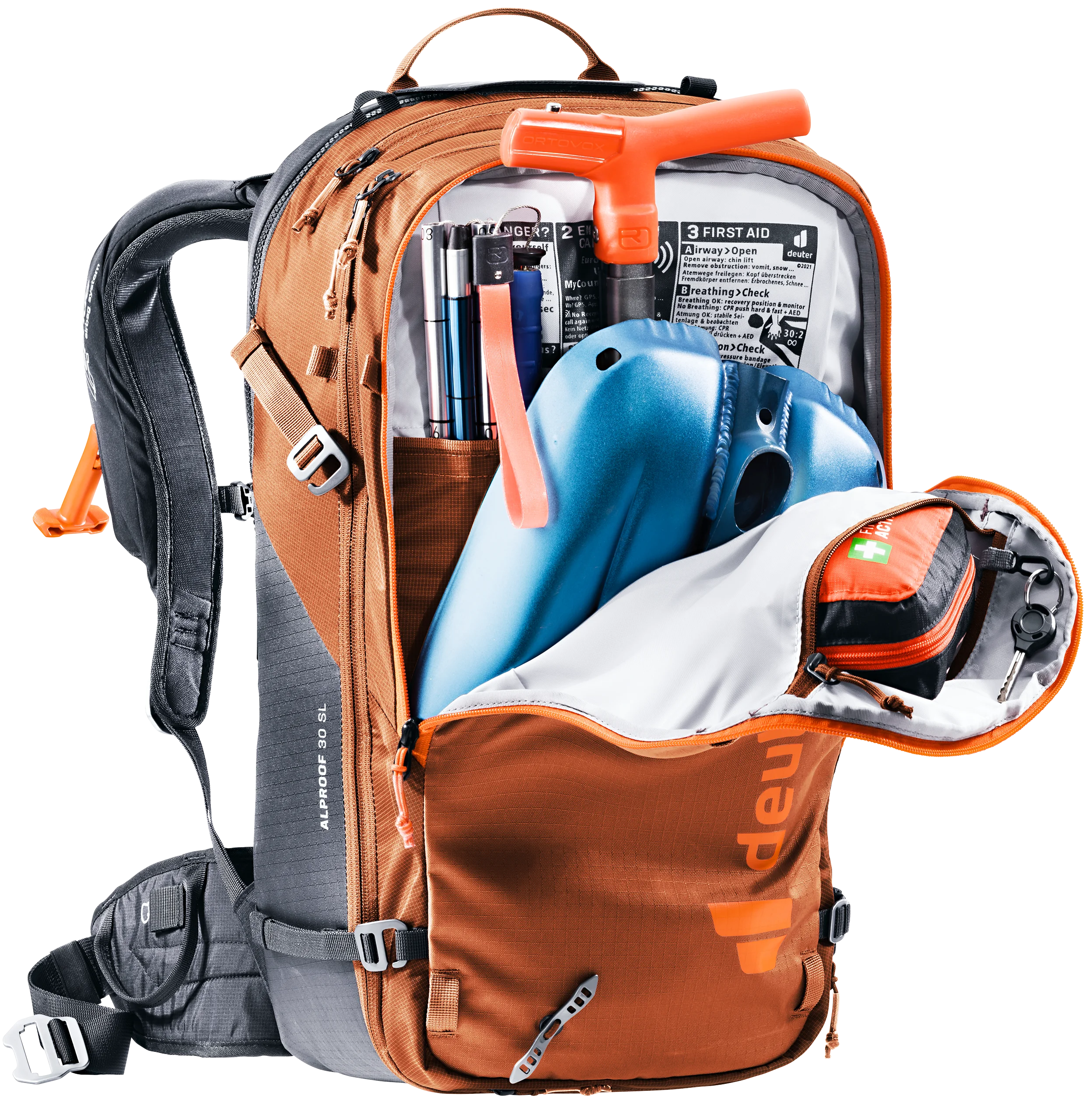 Gracias al airbag de avalancha Alpride E2 y a la última tecnología de supercondensadores, el Alproof permite un despliegue rápido, potente y fiable incluso a bajas temperaturas. La facilidad de manejo, el desbloqueo múltiple y el compartimento de seguridad de rápido acceso se unen a la gran comodidad de uso y al ajuste ceñido para una acción controlada en terrenos técnicos. Un lazo en la pierna evita el deslizamiento en caso de enterramiento, la bolsa para el casco, los lazos para el equipo y las correas de sujeción también permiten utilizar la mochila con airbag para avalanchas con certificación TÜV en condiciones de alta montaña.
