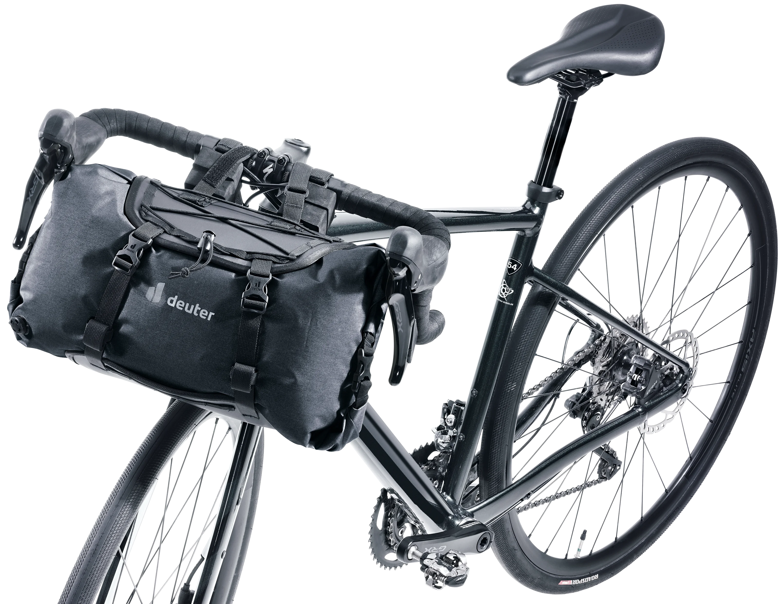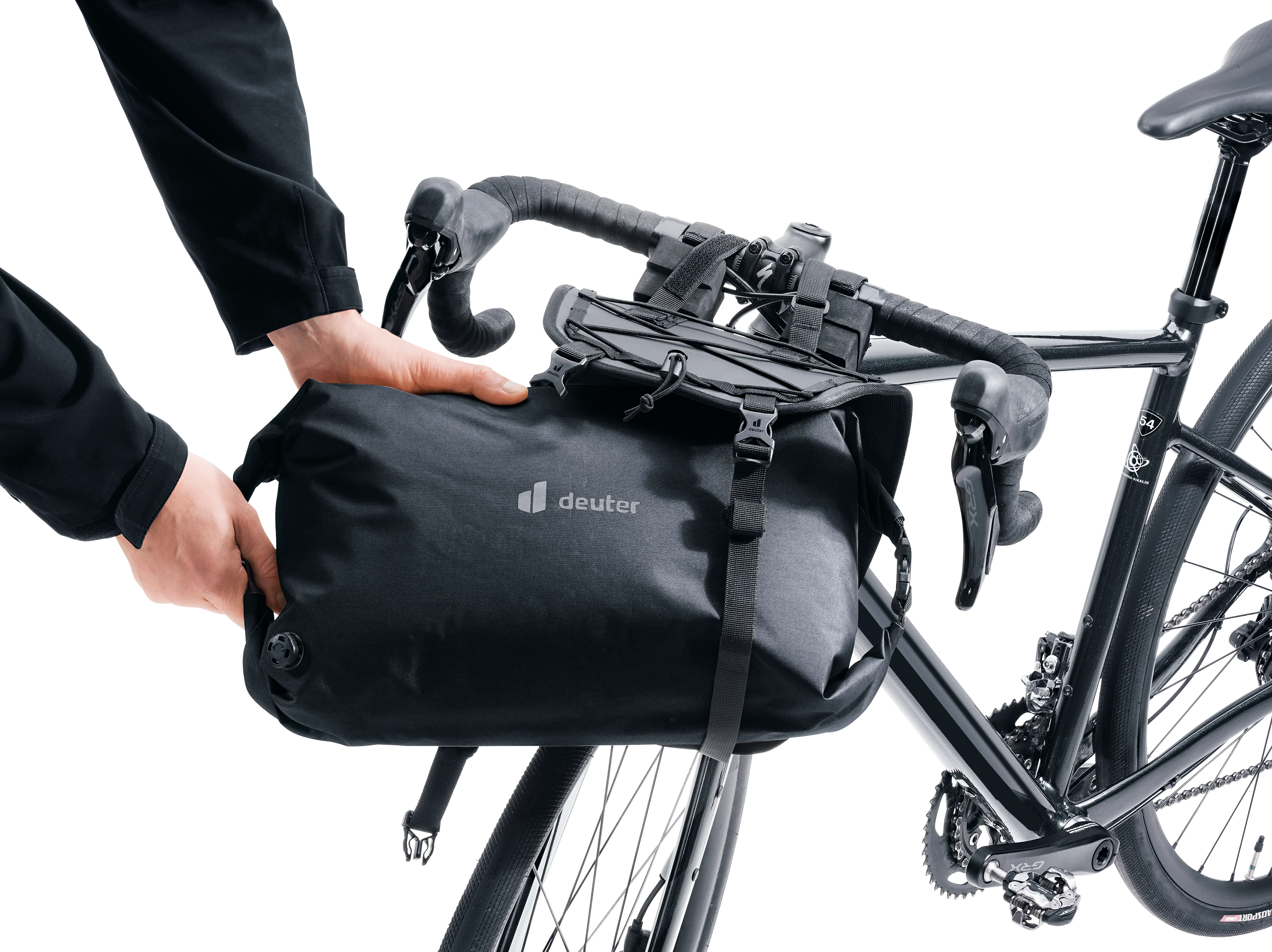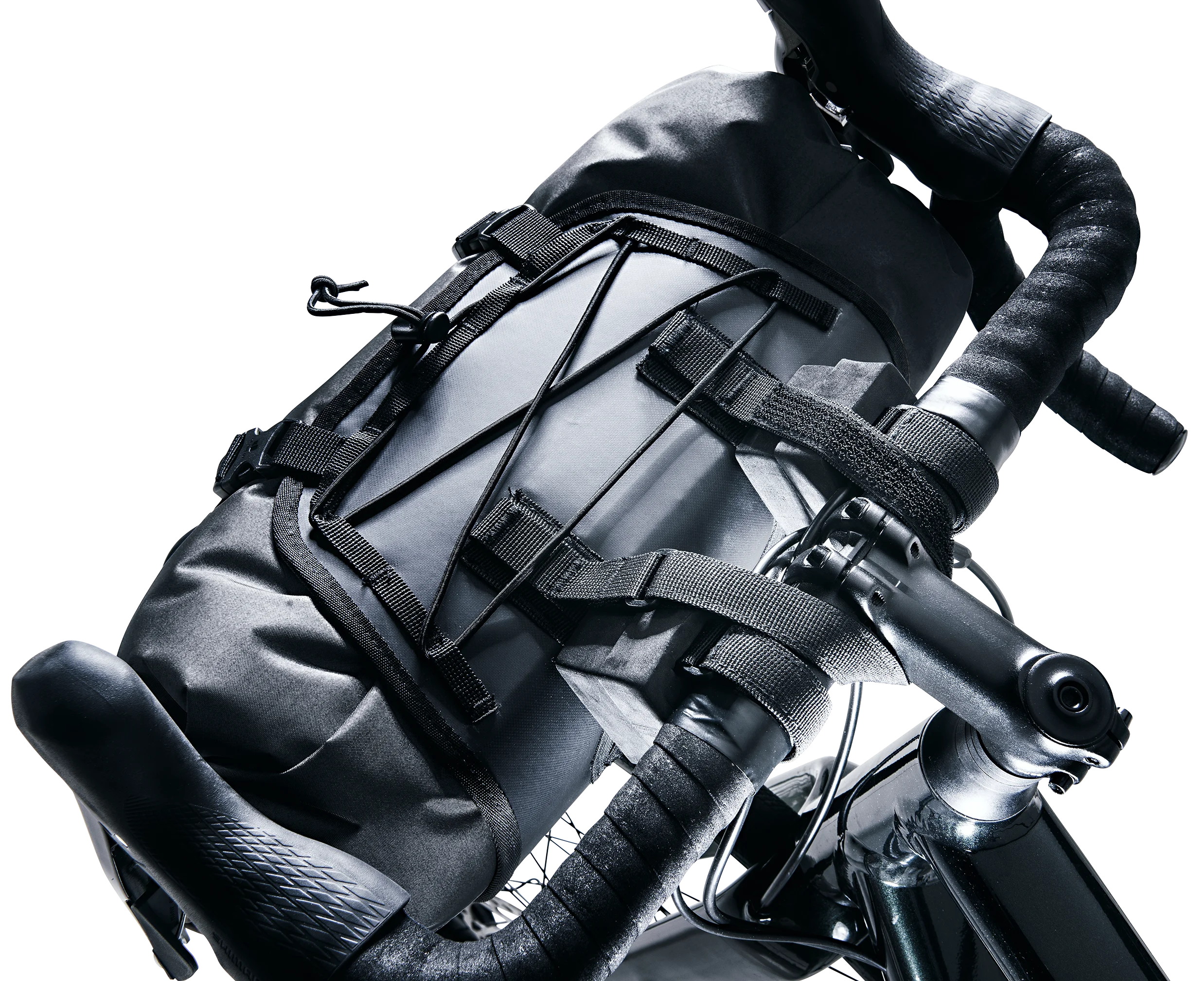 La construcción en dos piezas de las bolsas del manillar y del sillín permite cargarlas y descargarlas rápidamente. Durante un descanso rápido, la bolsa seca se puede desmontar fácilmente mientras el arnés permanece en la bicicleta.