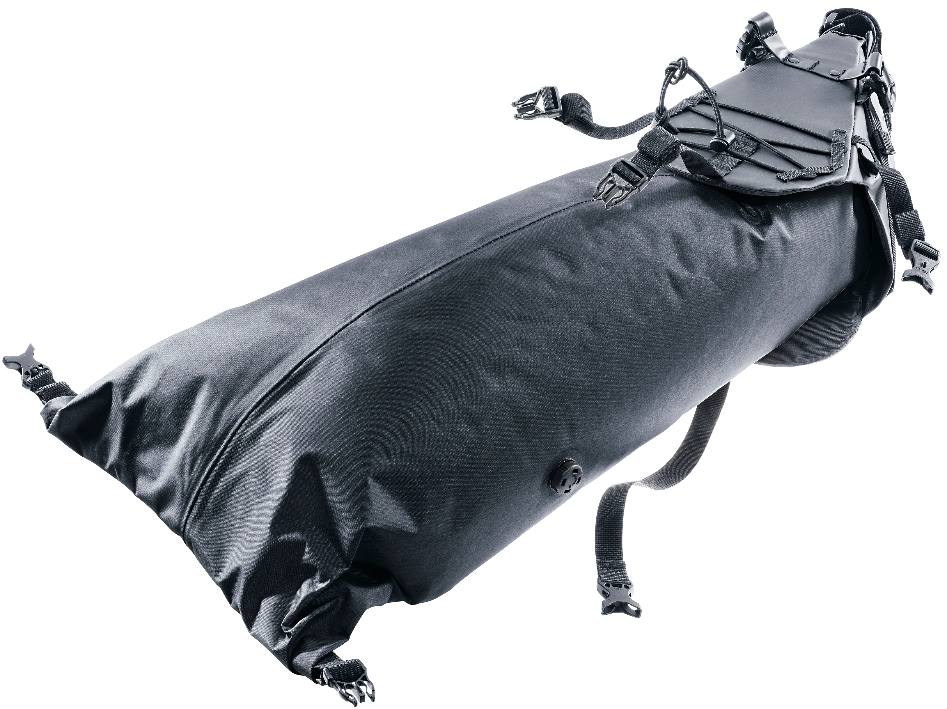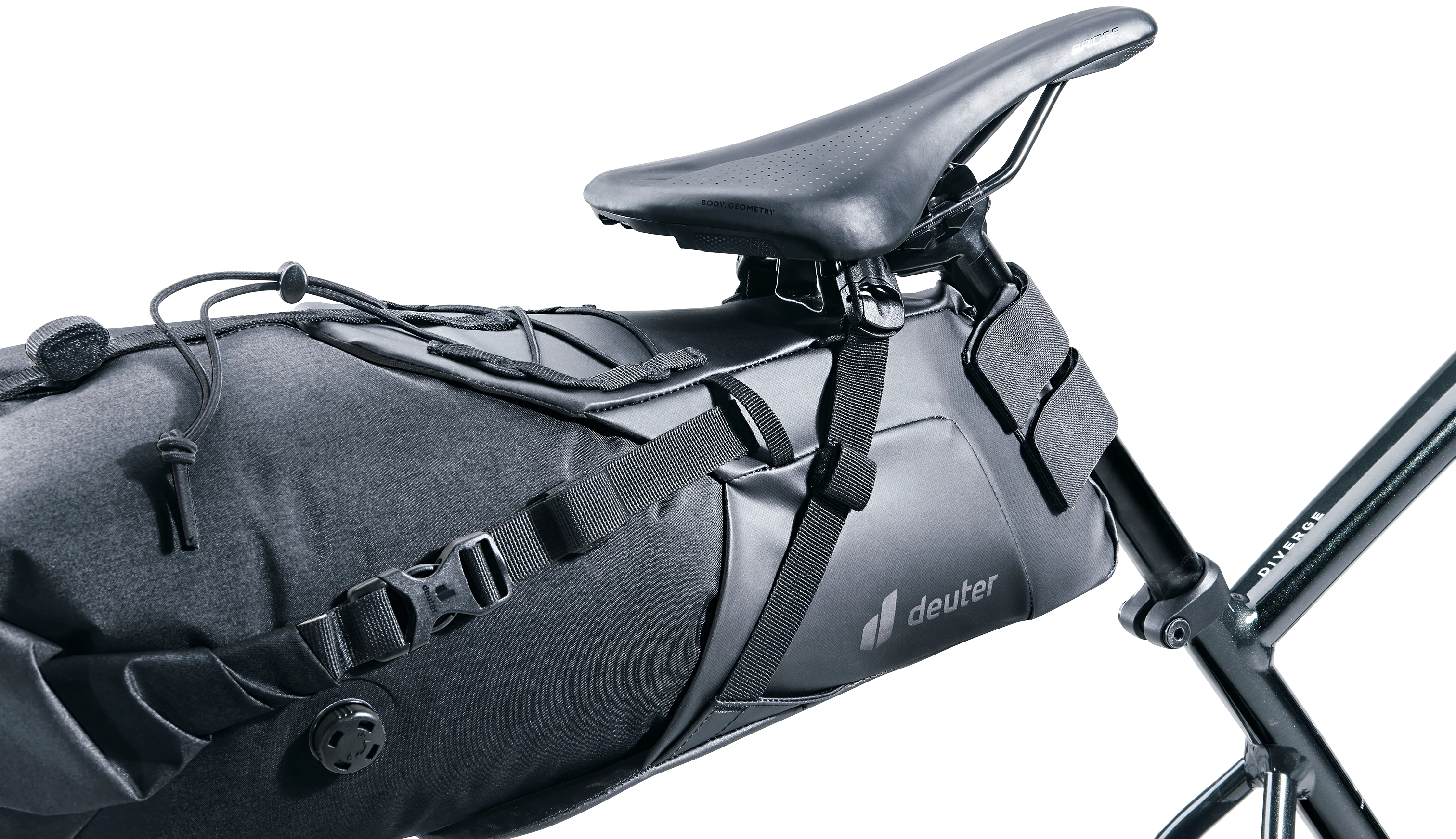 Really practical and nice saddle bag. I used to have the 16.5 liter Ortlieb but that one does not have a harness, which makes it very hard to attach it to the bike when it is full (the weight makes it fall down while you are trying to attach the tiny straps under the saddle)... I sold that one. This Deuter is so much easier with the separate harness which is easy to attach when emtpy. I simply leave the harness on the bike overnight, and I take out the sack. So much less work. You do need to pack the sack a bit perfectly in the part that goes near the saddle pin, so that it fits neatly into the harness. The air vent makes it easy to squeeze the bag nice and tight so that it does not hang down or flop around. I also used the elastics on top of the harness a few times. I used it in heavy rain, with mud also spraying up from the wheel, and the sack and harness are definitely waterproof. I don't even notice that the bag is there. I have seen people complain that big saddle bags sway left and right but I have never experienced that sentiment. Very happy with this Deuter.