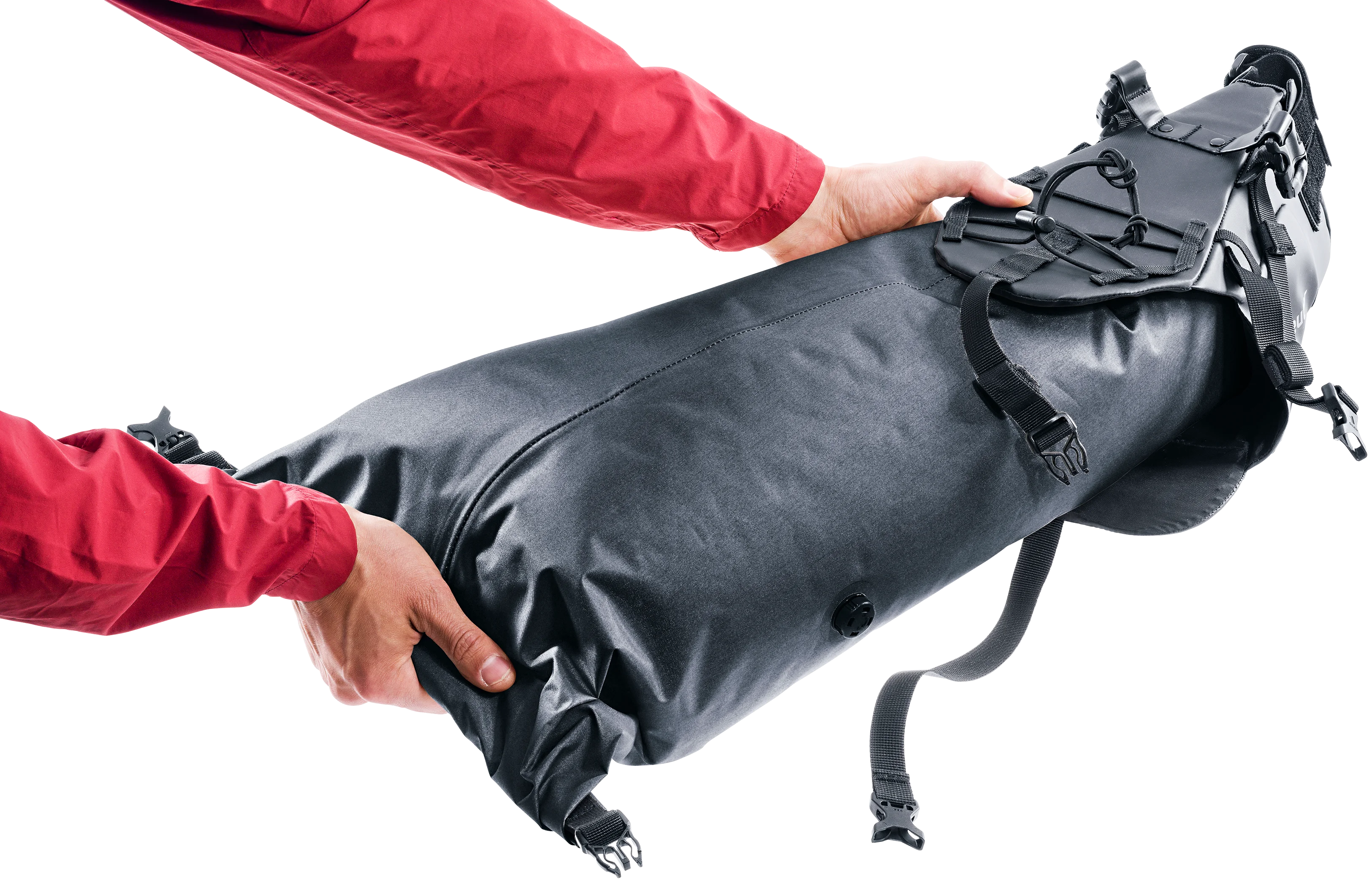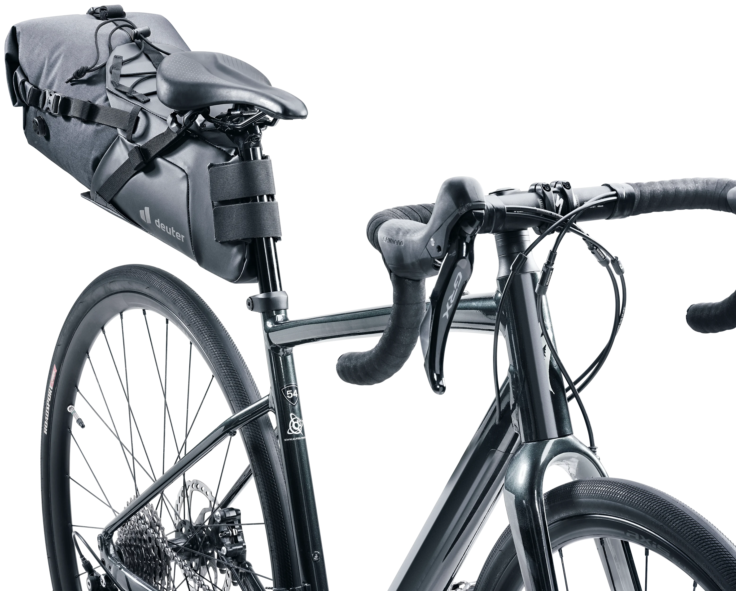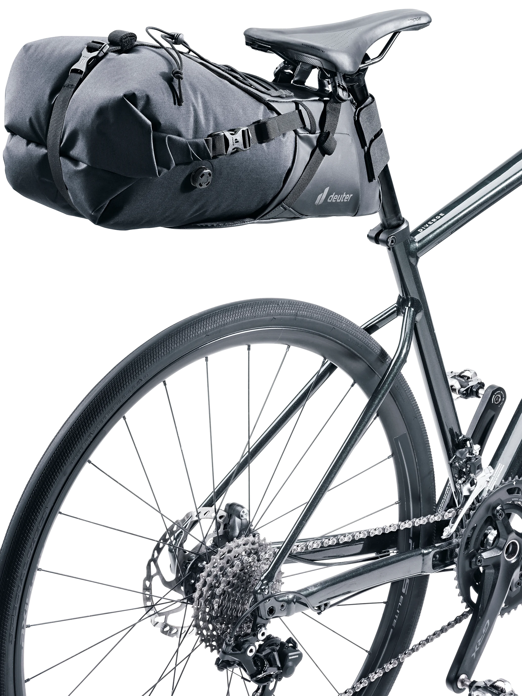 La construcción en dos piezas de las bolsas del manillar y del sillín permite cargarlas y descargarlas rápidamente. Durante un descanso rápido, la bolsa seca se puede desmontar fácilmente mientras el arnés permanece en la bicicleta.