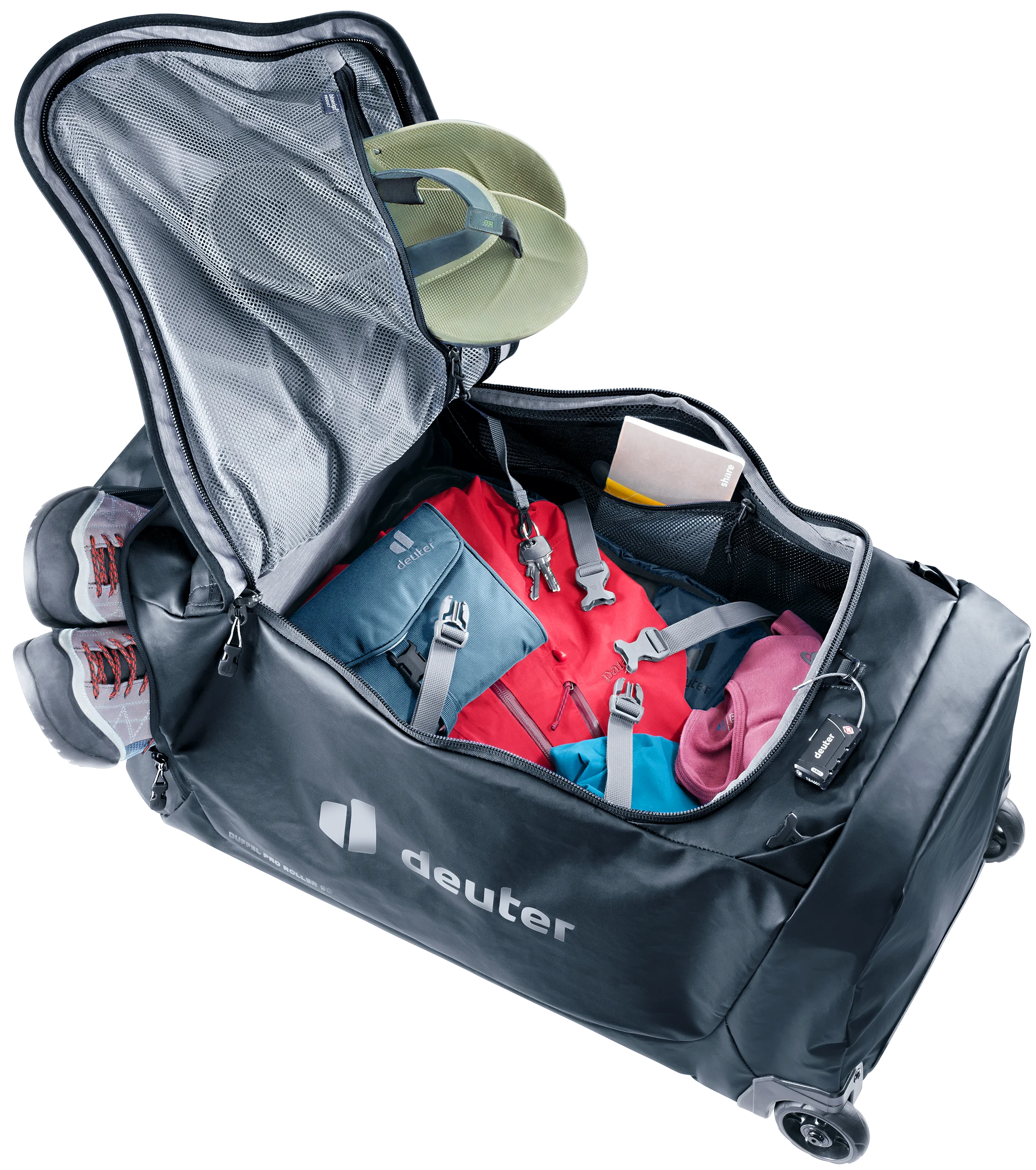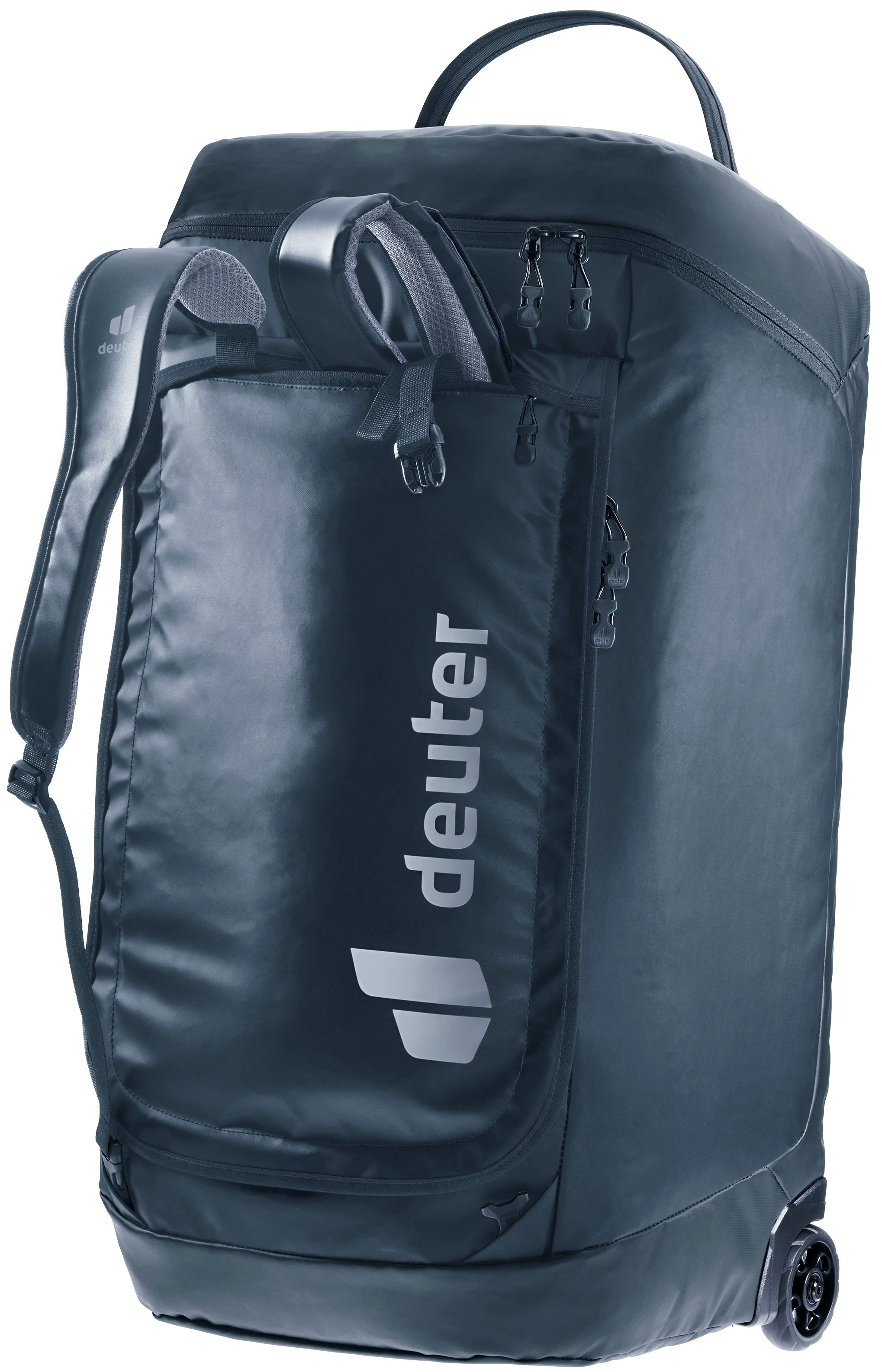 La Duffel Pro Roller se puede llevar de varias formas: no solo tiene ruedas, sino que también cuenta con hombreras opcionales para poder llevarla cómodamente sobre los hombros. Su tejido, que repele el agua, le otorga una gran robustez y permite usarla incluso con mal tiempo.