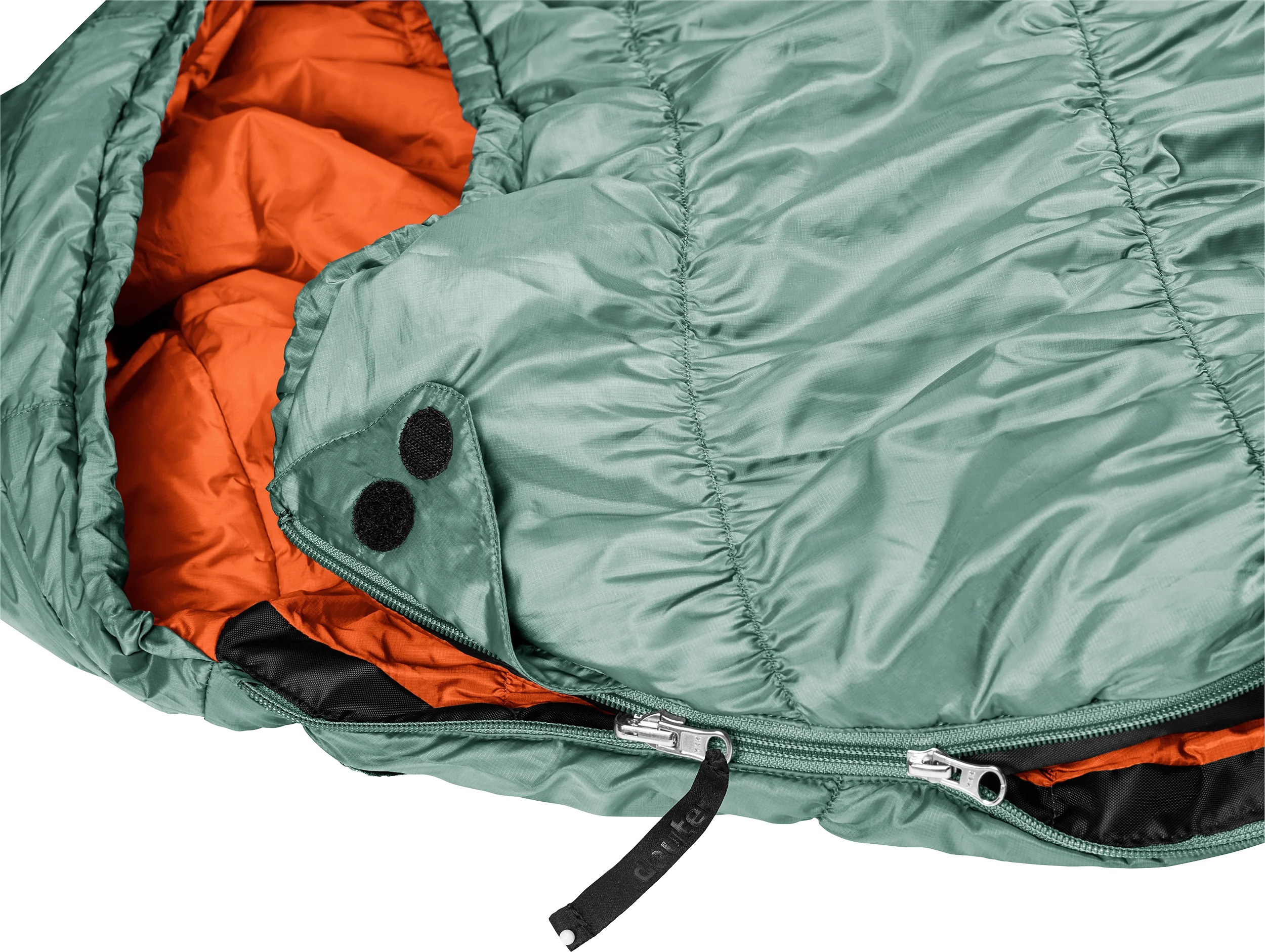 La funda y el forro con certificación bluesign®, así como casi todos los componentes de este saco de dormir, están fabricados con poliéster 100% reciclado. Las costuras ThermoStretch, la distribución en 360° del acolchado de fibra termoformada y la construcción en tablilla con solapamiento de 1,3 veces confieren a este saco de dormir un excelente confort para dormir. Los detalles prácticos, como el protector de cremallera antiaprisionamiento y la zona ergonómica para los pies, además de un tejido exterior funcional y resistente, hacen de este saco una opción ligera y funcional para su uso en la montaña.