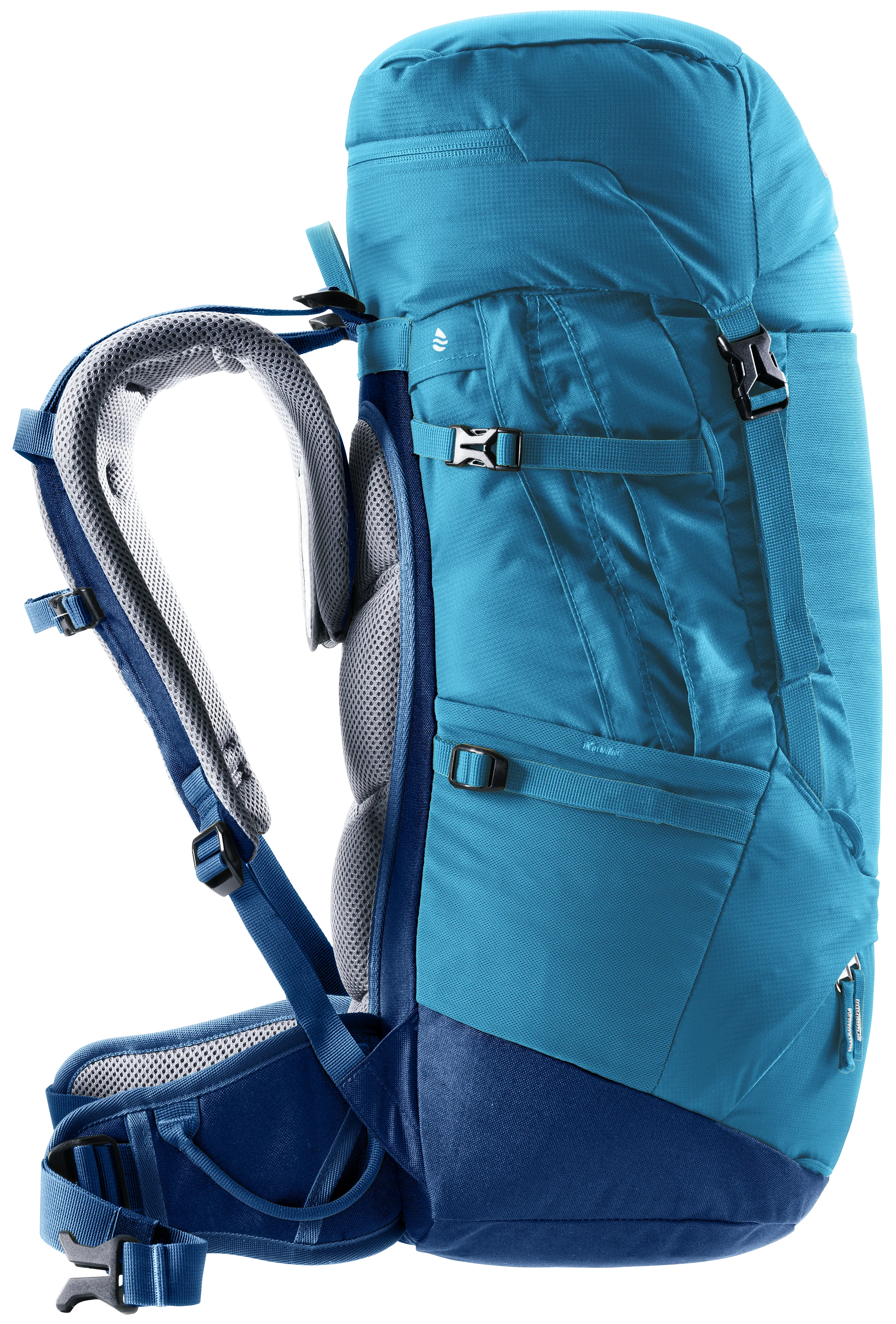 Las cargas de mucho peso se llevan mejor cuando la mochila y la persona que la lleva se mueven como uno solo. Aquí es donde el principio Aircontact entra en juego: el sistema de carga va pegado al cuerpo, por lo que la carga se mantiene cerca del centro de gravedad del cuerpo. Esto garantiza un control absoluto y una transferencia del peso efectiva. Al mismo tiempo, el acolchado transpirable Aircontact asegura una ventilación notable y agradable gracias a su efecto de bombeo en cada movimiento.