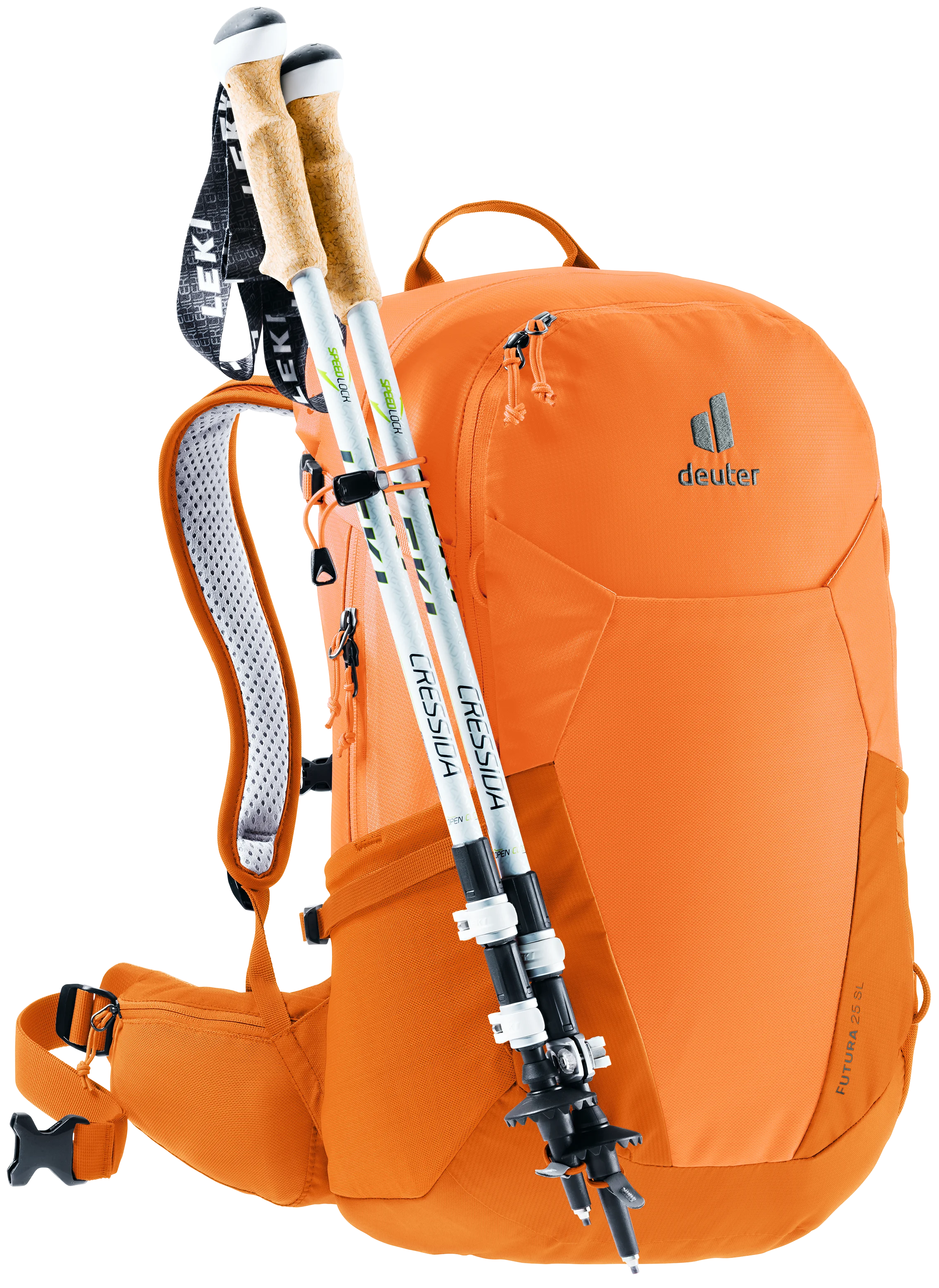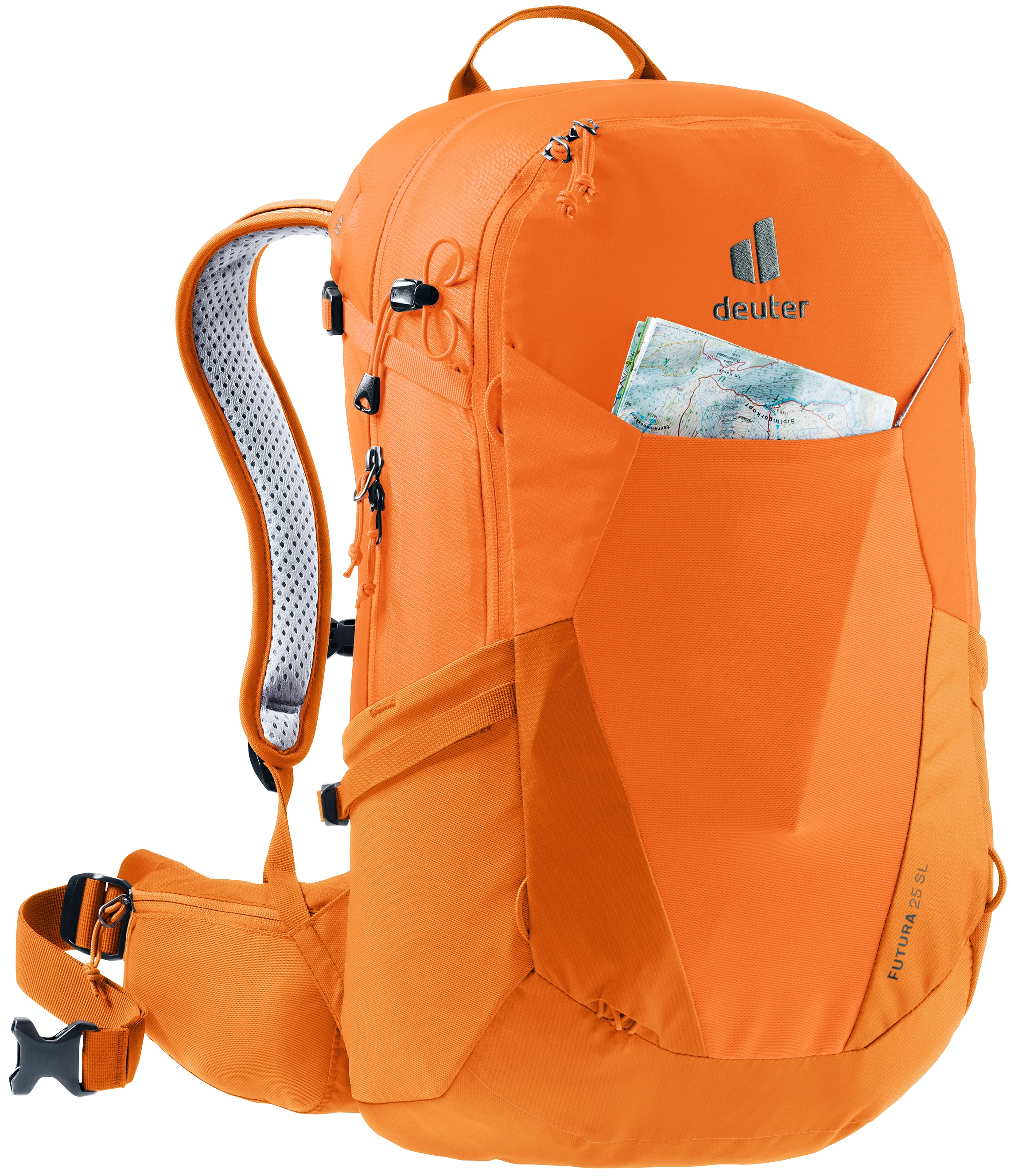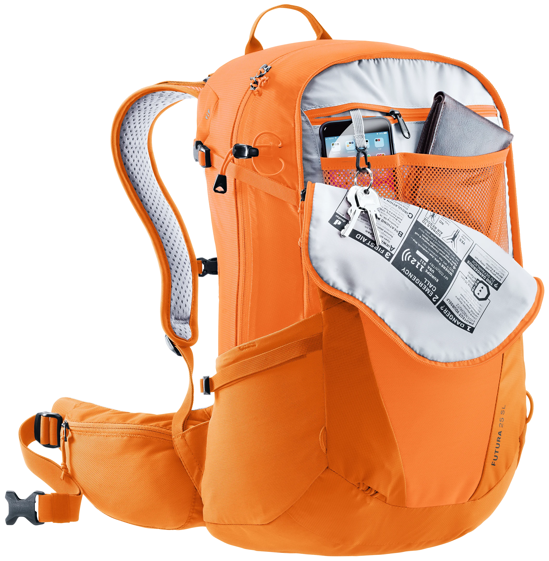La ligera y funcional mochila de senderismo Futura SL está especialmente diseñada para adaptarse a la anatomía femenina. Con una espalda más corta, tirantes más estrechos y aletas de cadera de forma cónica, el Futura SL se sienta cómodamente en la espalda. El sistema de espalda Aircomfort con la nueva malla asegura la máxima ventilación en la espalda durante las caminatas deportivas de día. Si la ropa se humedece, puede secarse rápidamente en el bolsillo delantero elástico y permeable al aire durante la caminata.